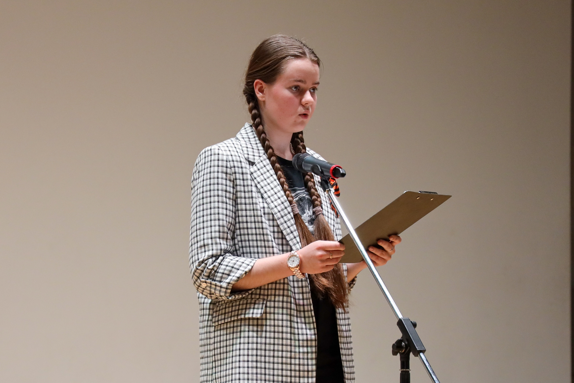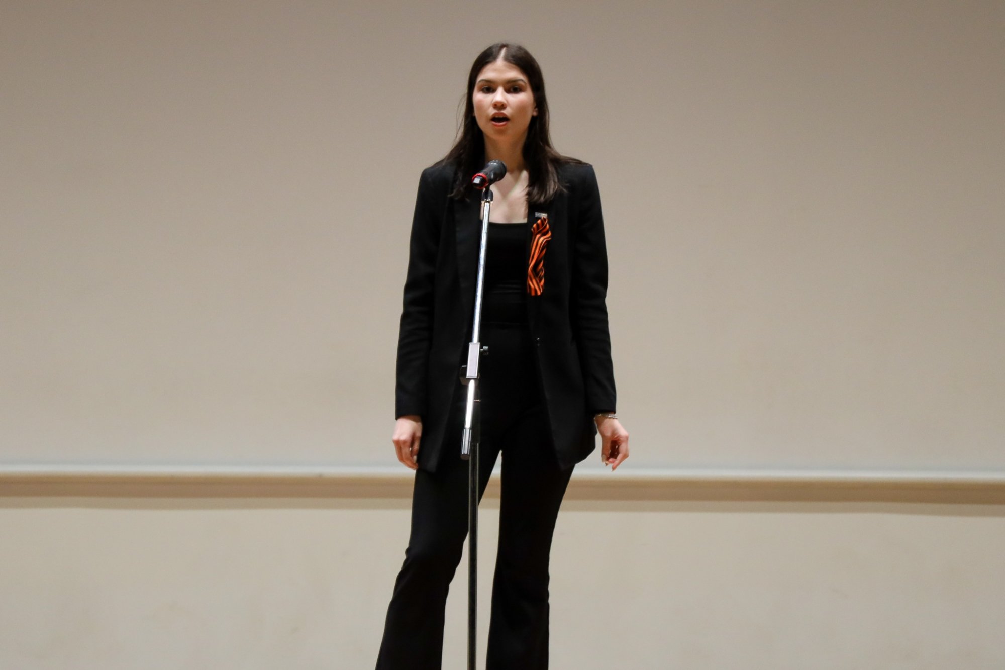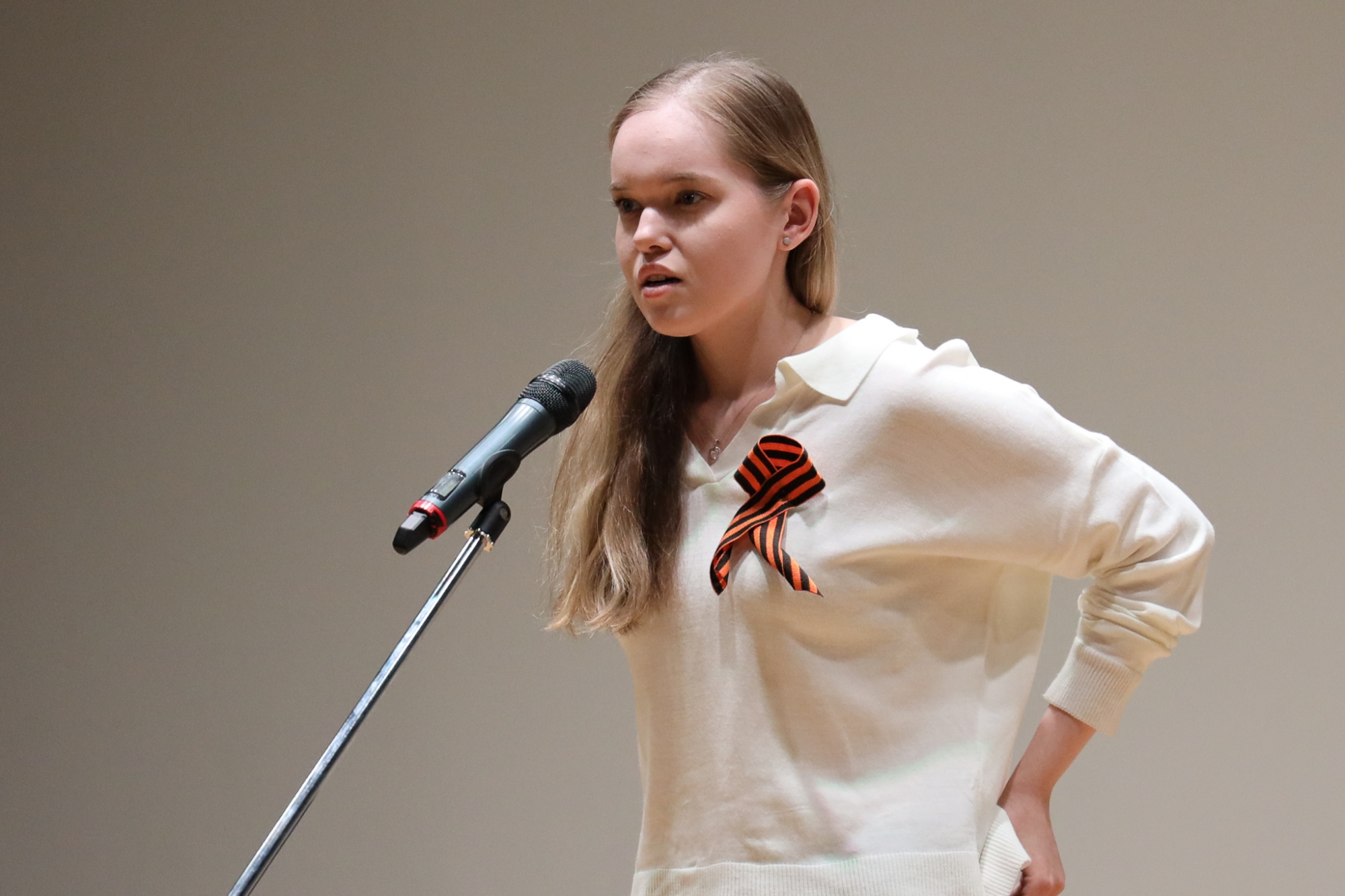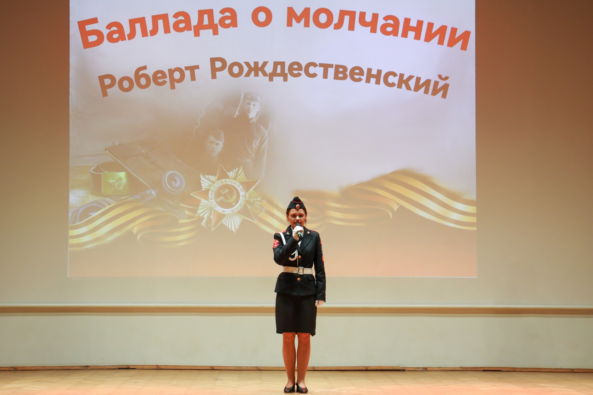 Самая молодая участница, ученица кадетского класса ГБОУ Школа № 2006 Мария Старош рассказала «Балладу о молчании» Роберта Рождественского.