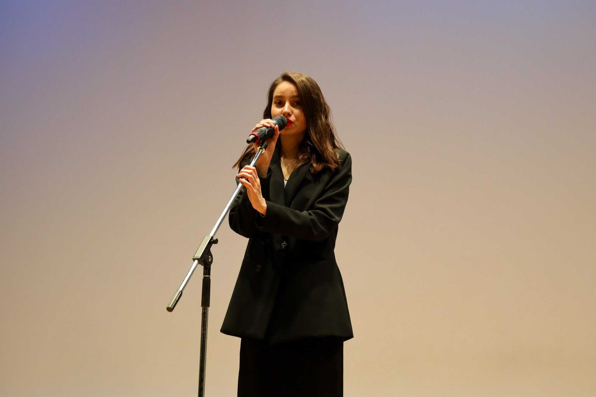 Виктория Казанбаева выступила с произведением Роберта Рождественского «Баллада о зенитчицах». Магистрантка продекламировала балладу трогательно, эмоционально и проникновенно.