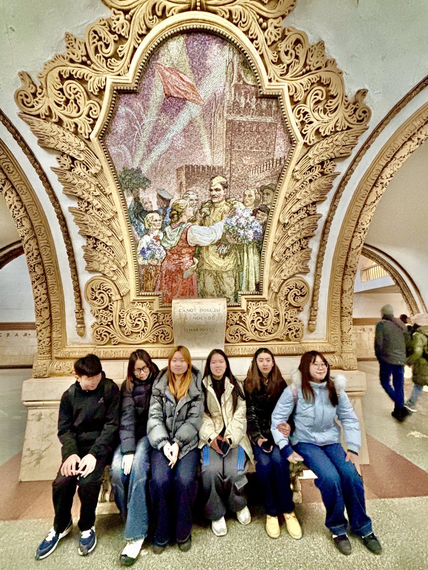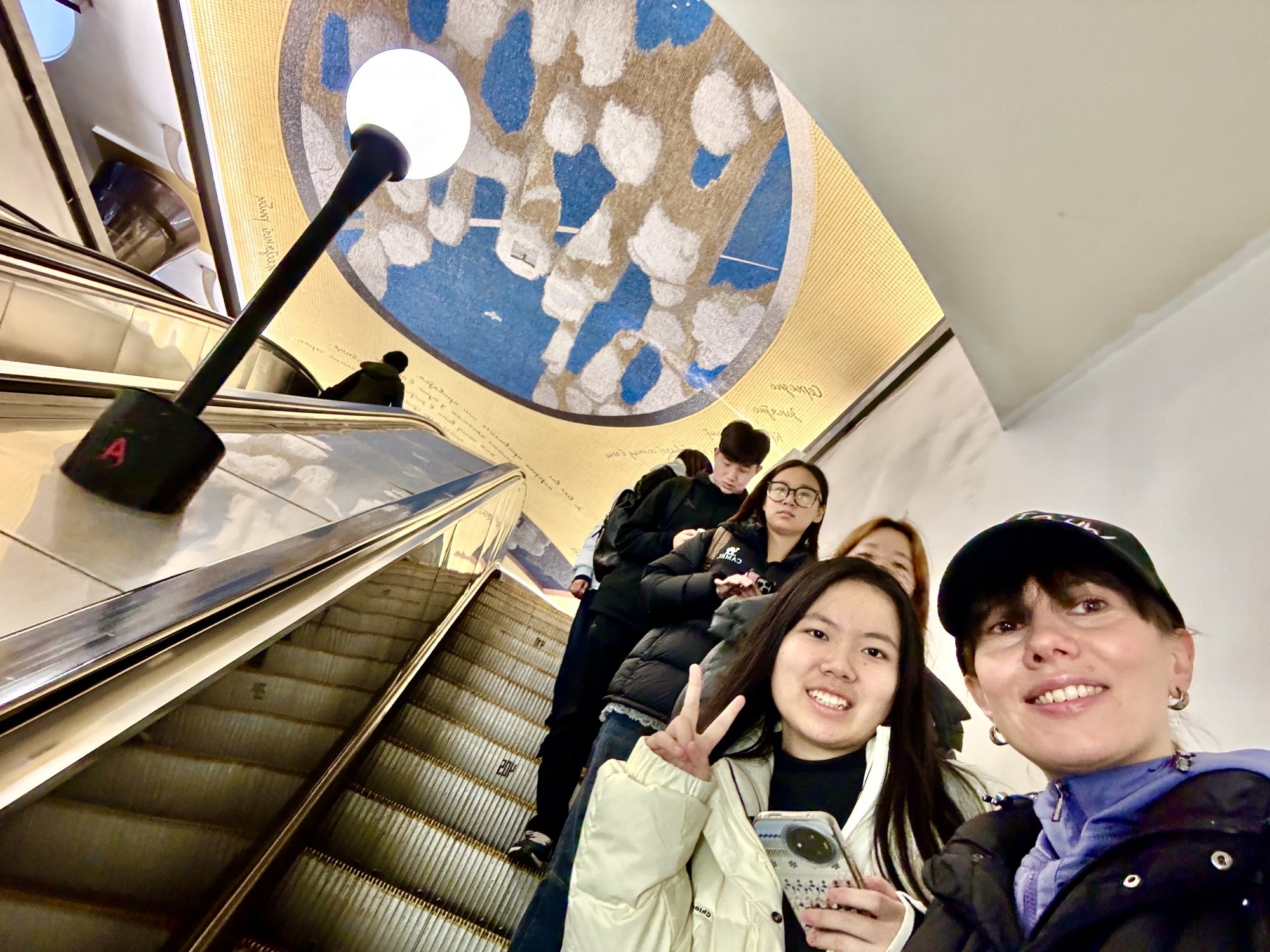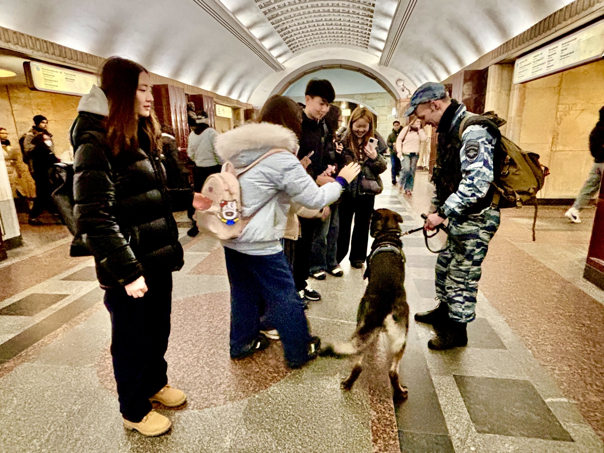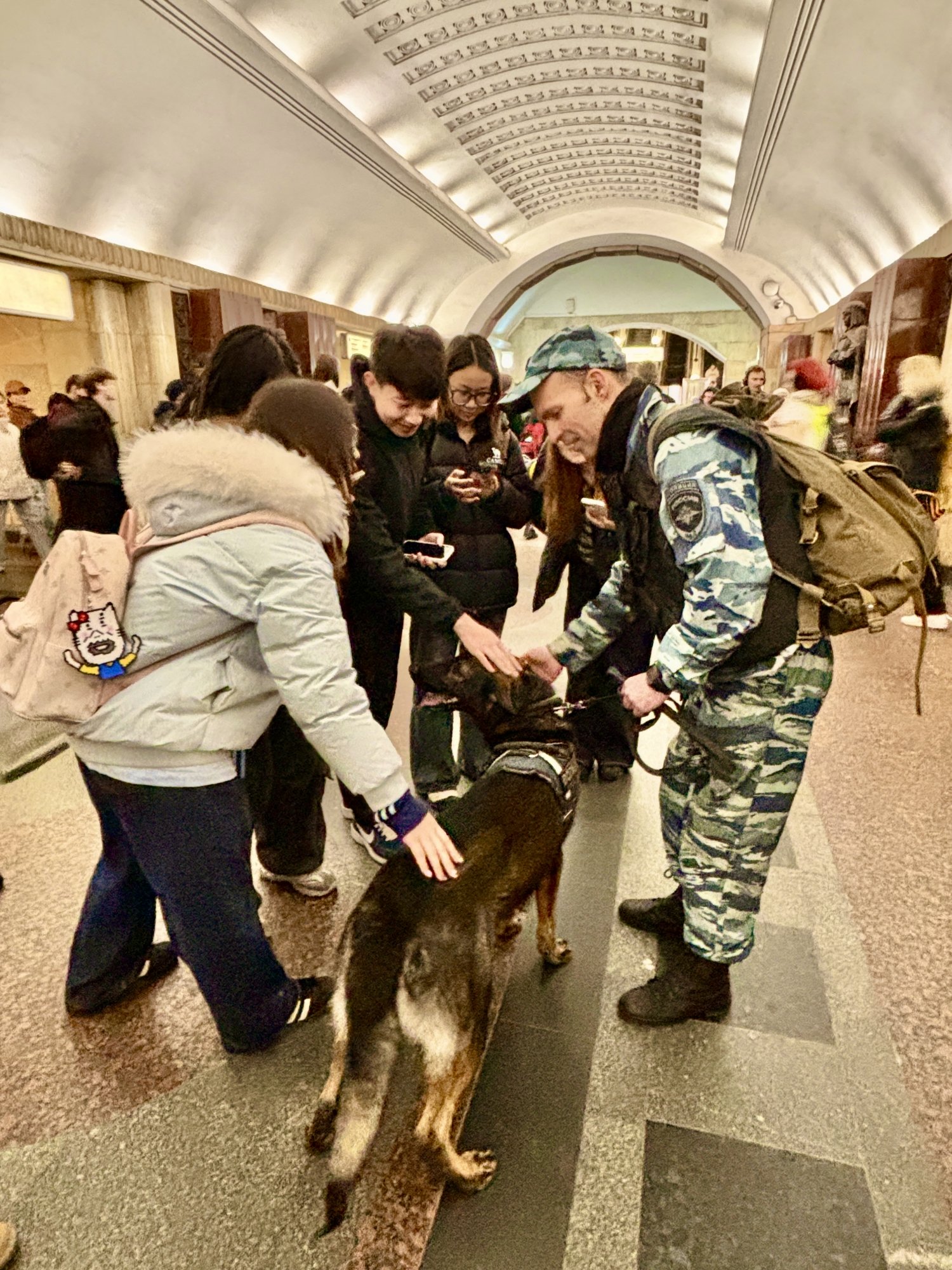 Мы начали экскурсию от станции, которая ближе всего к студенческому общежитию. Потом перешли на синюю ветку метро и остановились на «Бауманской», где встретили полицейского с овчаркой, которая натренирована разыскивать бомбы. Полицейский рассказал, что изучает китайский язык, поэтому произнёс несколько слов по-китайски и позволил погладить своего служебного пса. На «Маяковской» ребята рассмотрели все 34 мозаичных панно работы Александра Александровича Дейнеки, проверили эффект шепчущей галереи, где слова от колонны к колонне передаются по металлическому каркасу, минуя шум, и прочитали стихотворение Владимира Маяковского, расположенное на потолке вестибюля.