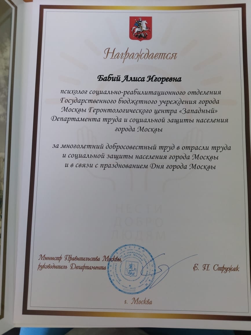 Старший преподаватель кафедры общей психологии и психологии труда Алиса Игоревна Бабий получила почетную грамоту министра правительства Москвы.