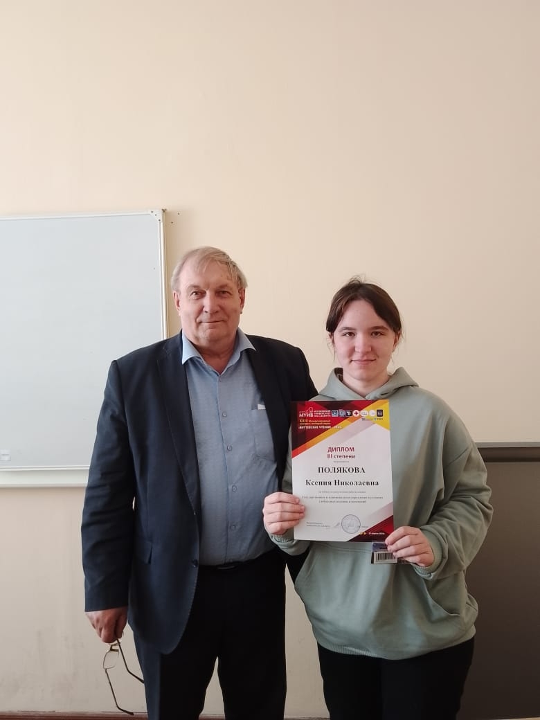 По итогам работы секции «Государственное и муниципальное управление в условиях глобальных вызовов и изменений» был отмечен доклад Ксении Поляковой. Ей был вручён диплом победительницы и ценный подарок.