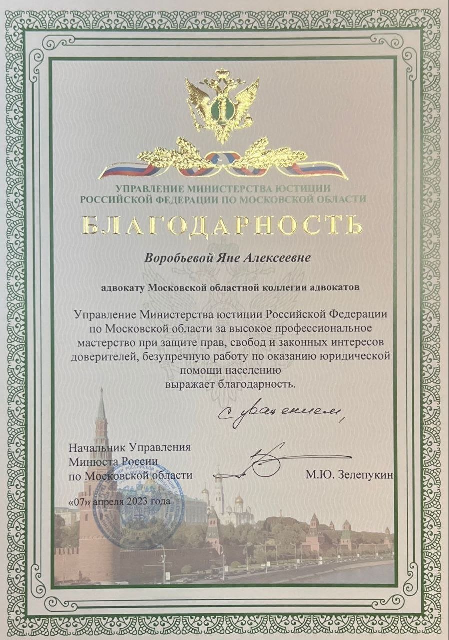 Адвокат Московской областной коллегии адвокатов, преподаватель кафедры частного права РосНОУ Яна Алексеевна Воробьёва получила благодарственное письмо Управления Министерства юстиции Российской Федерации по Московской области.