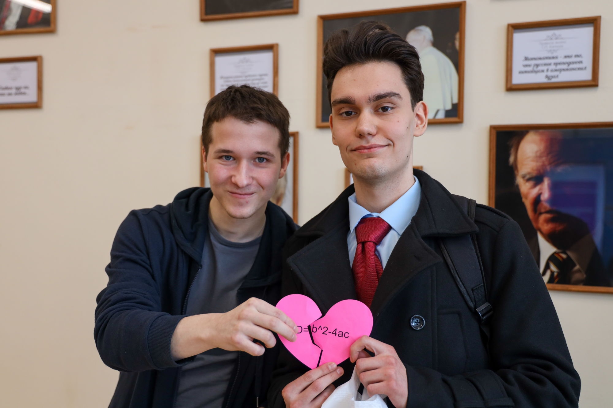 Части разрезанных бумажных сердец с написанными физическими и химическими формулами раздавали в холле первого этажа всем, кто начал раннее утро с первой пары. Задача влюблённых в науку состояла в том, чтобы соединить разрезанную формулу и сердце одновременно.
