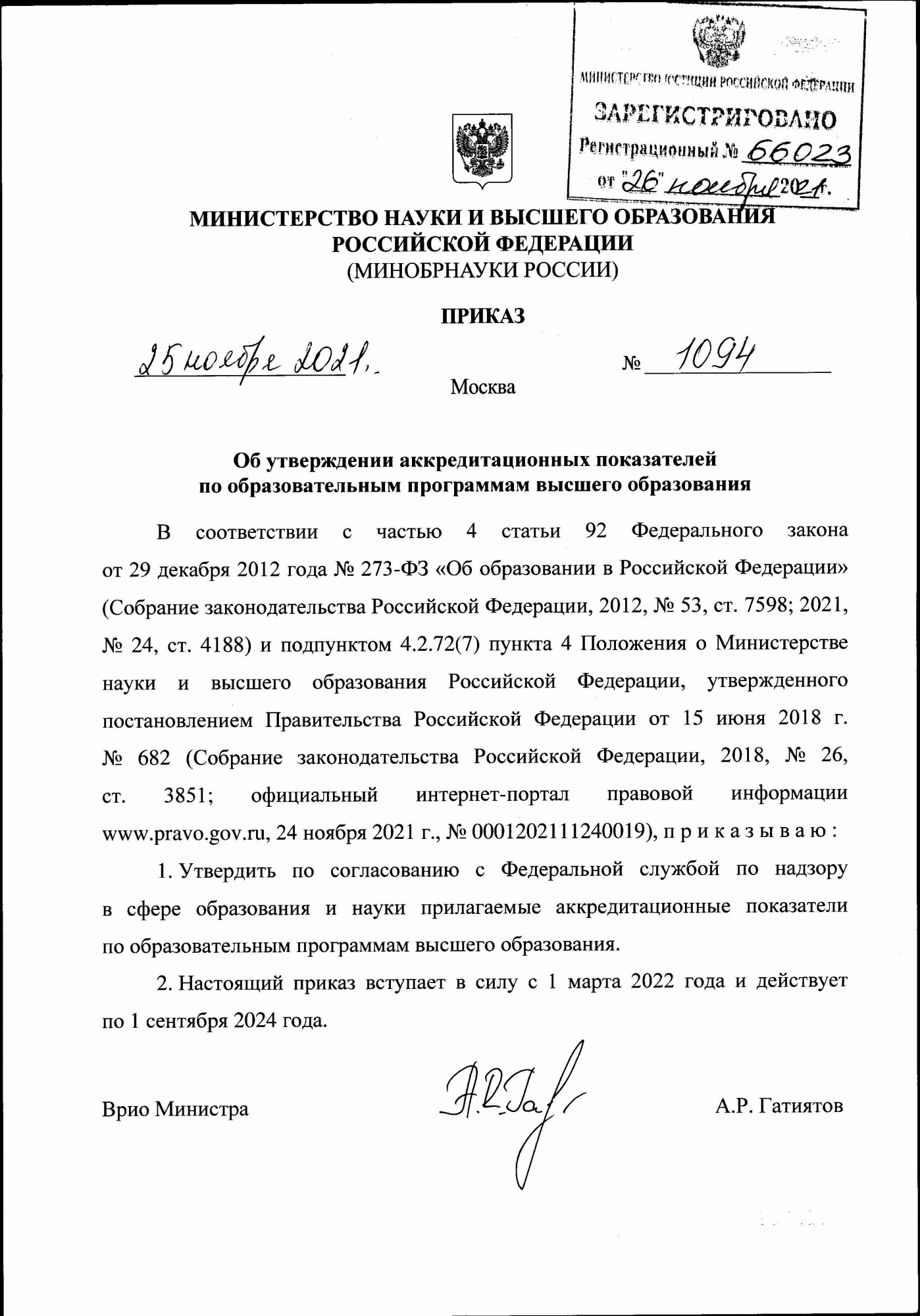 — Приказ № 1094 от 25 ноября 2021 года «Об утверждении аккредитационных показателей по образовательным программам высшего образования», который был опубликован на официальном интернет-портале правовой информации 29 ноября, поставил точку в давних дебатах и спорах о трансформации процедуры государственной аккредитации. Это, без преувеличения, революционный поворот в процедуре государственной аккредитации, изменения которой вступят в силу с 1 марта 2022 года.