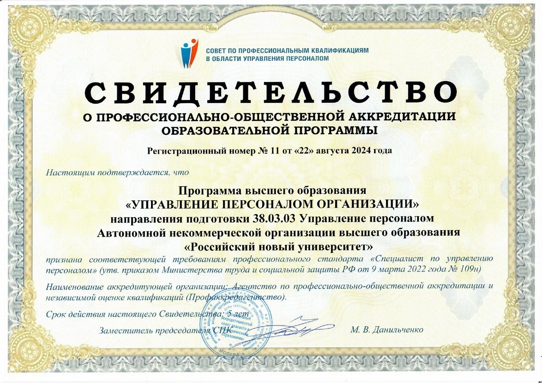 Образовательная программа Института бизнес-технологий Российского нового университета (РосНОУ) «Управление персоналом организации» (направление подготовки 38.03.03 «Управление персоналом») получила свидетельство о прохождении профессионально-общественной аккредитации от Совета по профессиональным квалификациям (СПК) в области управления персоналом организации. Программа признана соответствующей требованиям профессионального стандарта «Специалист по управлению персоналом», срок действия документа составит 5 лет.