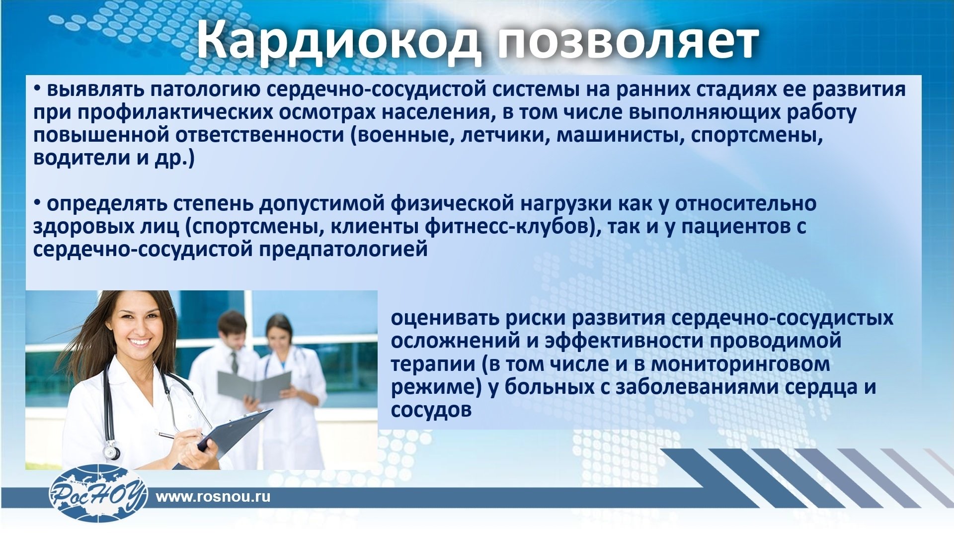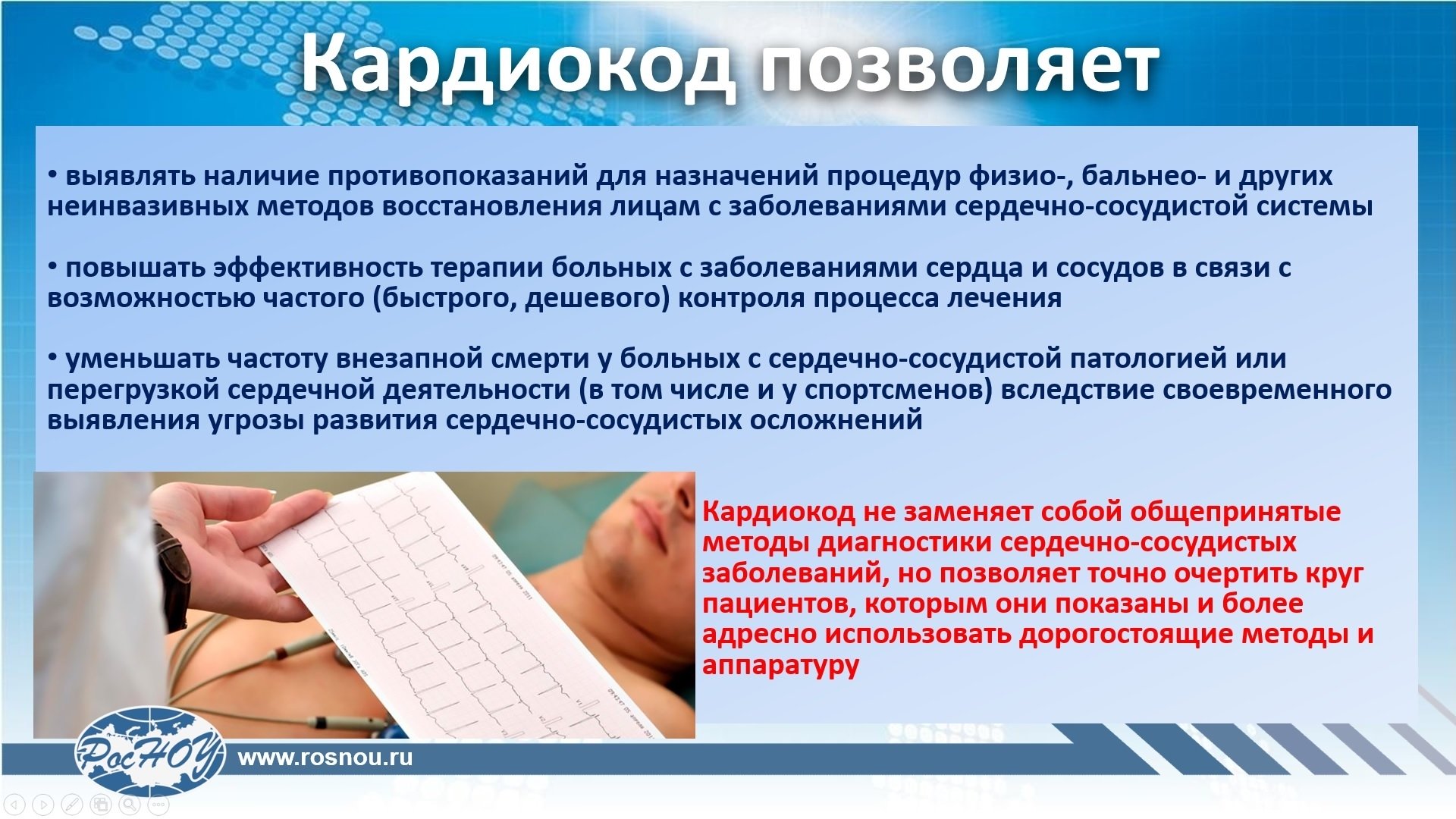 — «Кардиокод» позволяет выявлять патологию сердечно-сосудистой системы на ранних стадиях её развития, оценивать риски развития сердечно-сосудистых осложнений и эффективность проводимой терапии, а также уменьшать частоту внезапной смерти у больных, — отметила старший научный сотрудник.