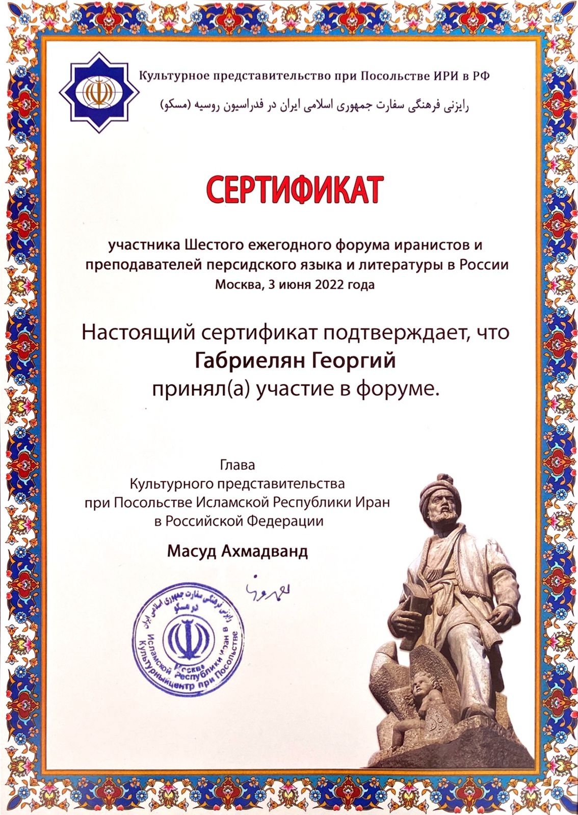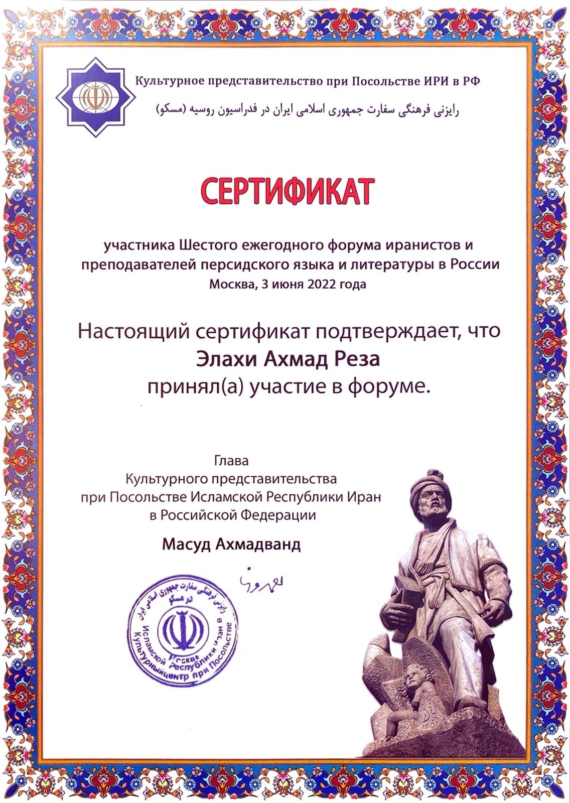 3 июня 2022 года в резиденции Посла Исламской Республики Иран в РФ прошёл VI ежегодный форум иранистов и преподавателей персидского языка и литературы в России. В мероприятии приняли участие представители РосНОУ.