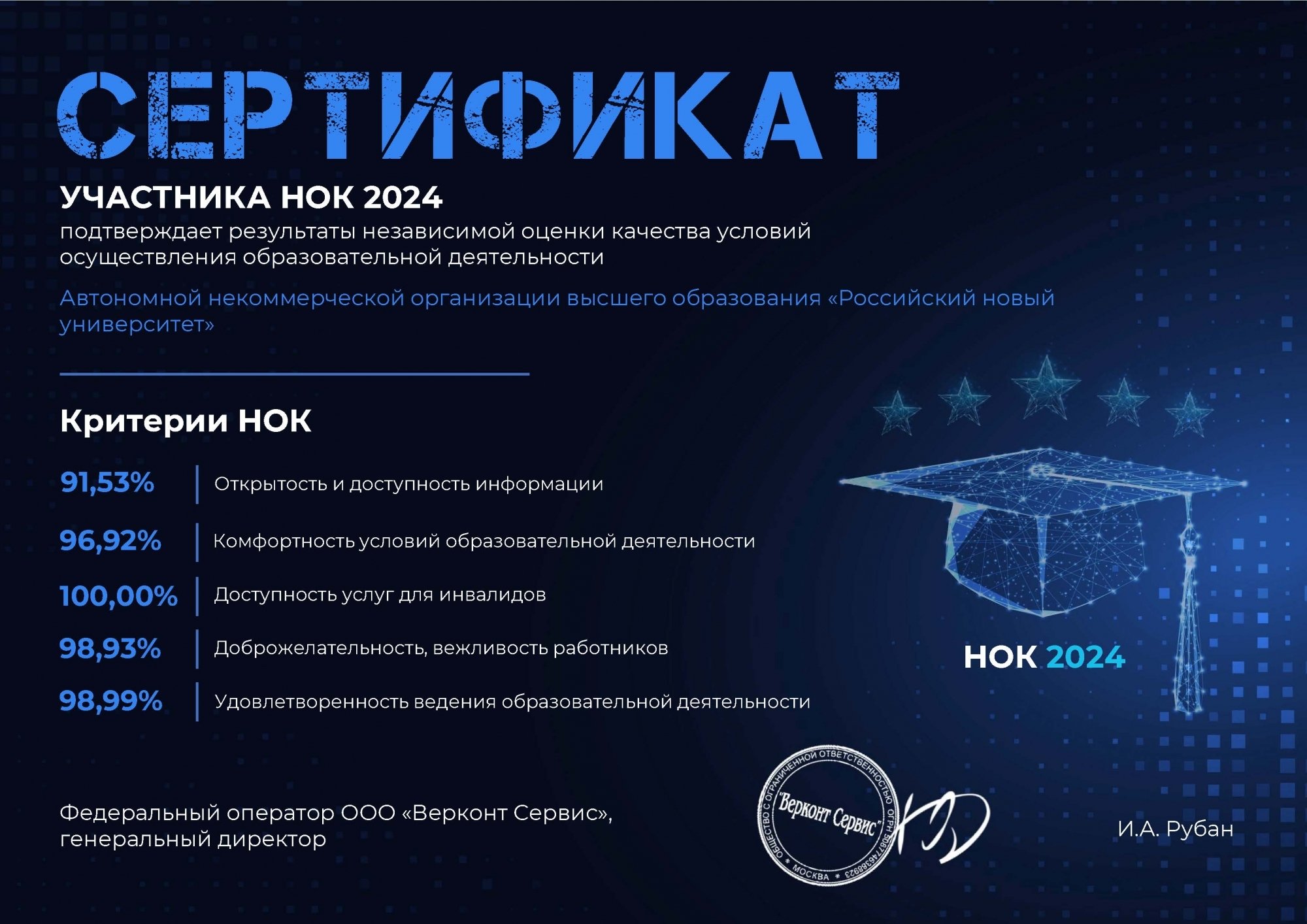 Российский новый университет (РосНОУ) прошёл независимую оценку качества условий осуществления образовательной деятельности. Об этом свидетельствует сертификат, выданный федеральным оператором независимой оценки качества условий осуществления образовательной деятельности, проведённой компанией «Верконт Сервис» по заказу Министерства науки и высшего образования РФ.