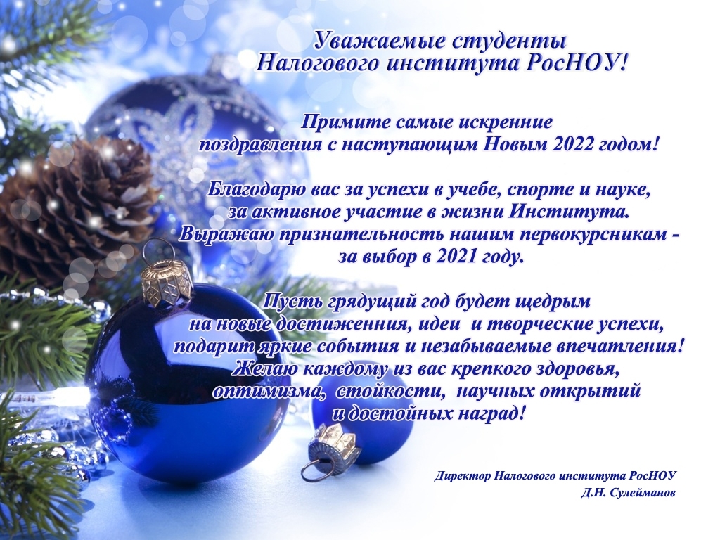 Я верю, что в новом году нас ждут перемены к лучшему и непременно сбудутся заветные мечты! Пусть 2022 год подарит много восхитительных моментов, приятных знакомств и личных побед, студенческая жизнь будет насыщенной, плодотворной, успешной, а учёные и педагоги продолжат вносить весомый вклад в воспитание молодых специалистов и передавать уникальный опыт последующим поколениям преподавателей.
