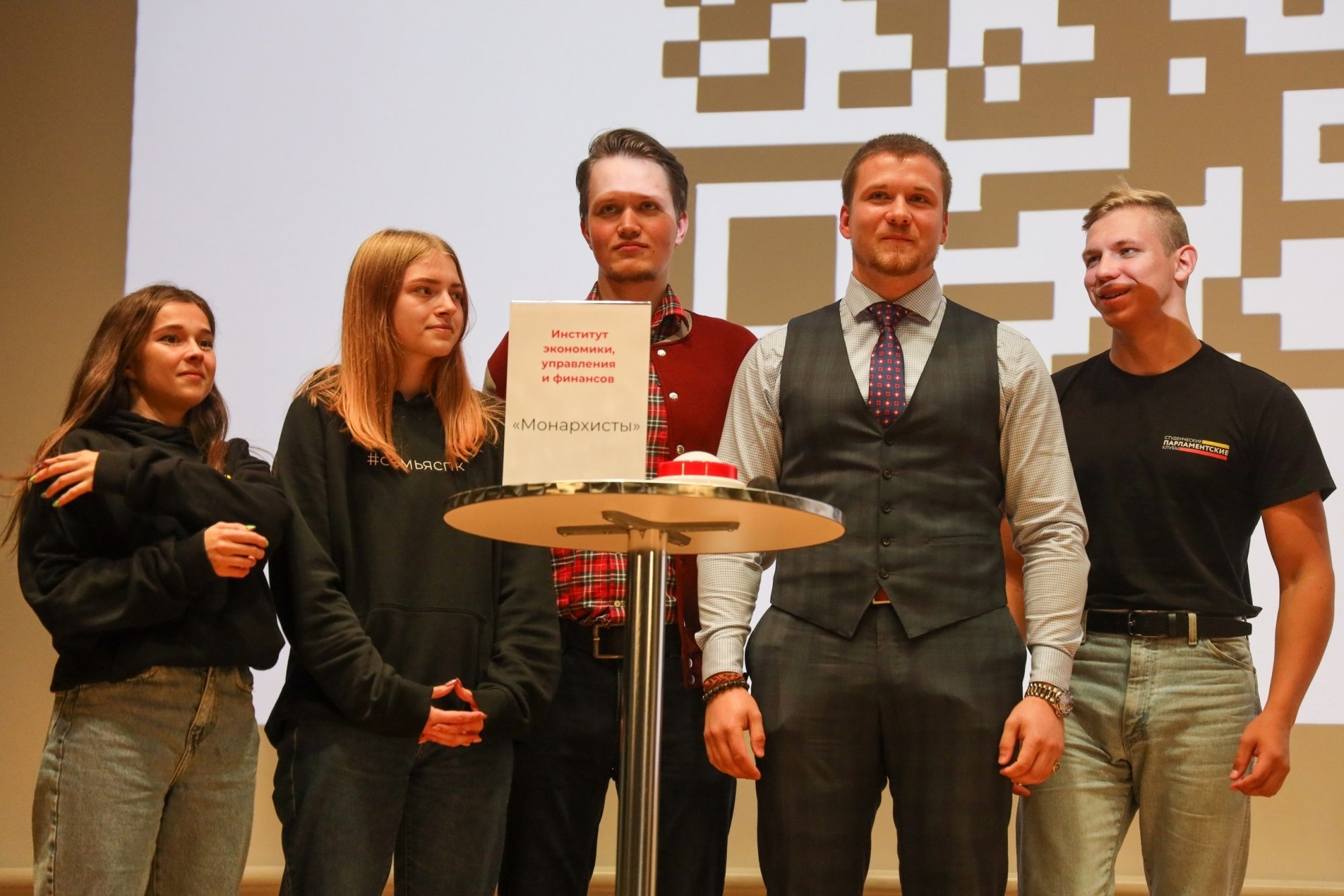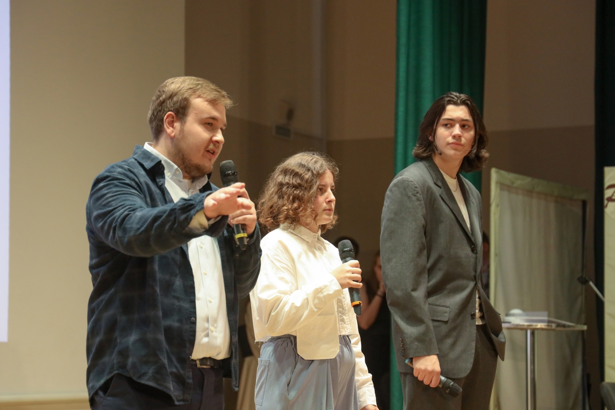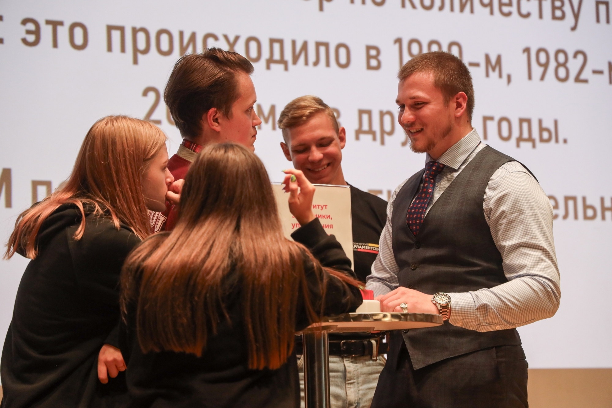 Семён Семенченков председатель Студенческого парламентского клуба провёл интерактив со зрителями. Все активно принимали участие. Команда СПК продемонстрировала свой мерч пройдясь по Малахитовому залу.