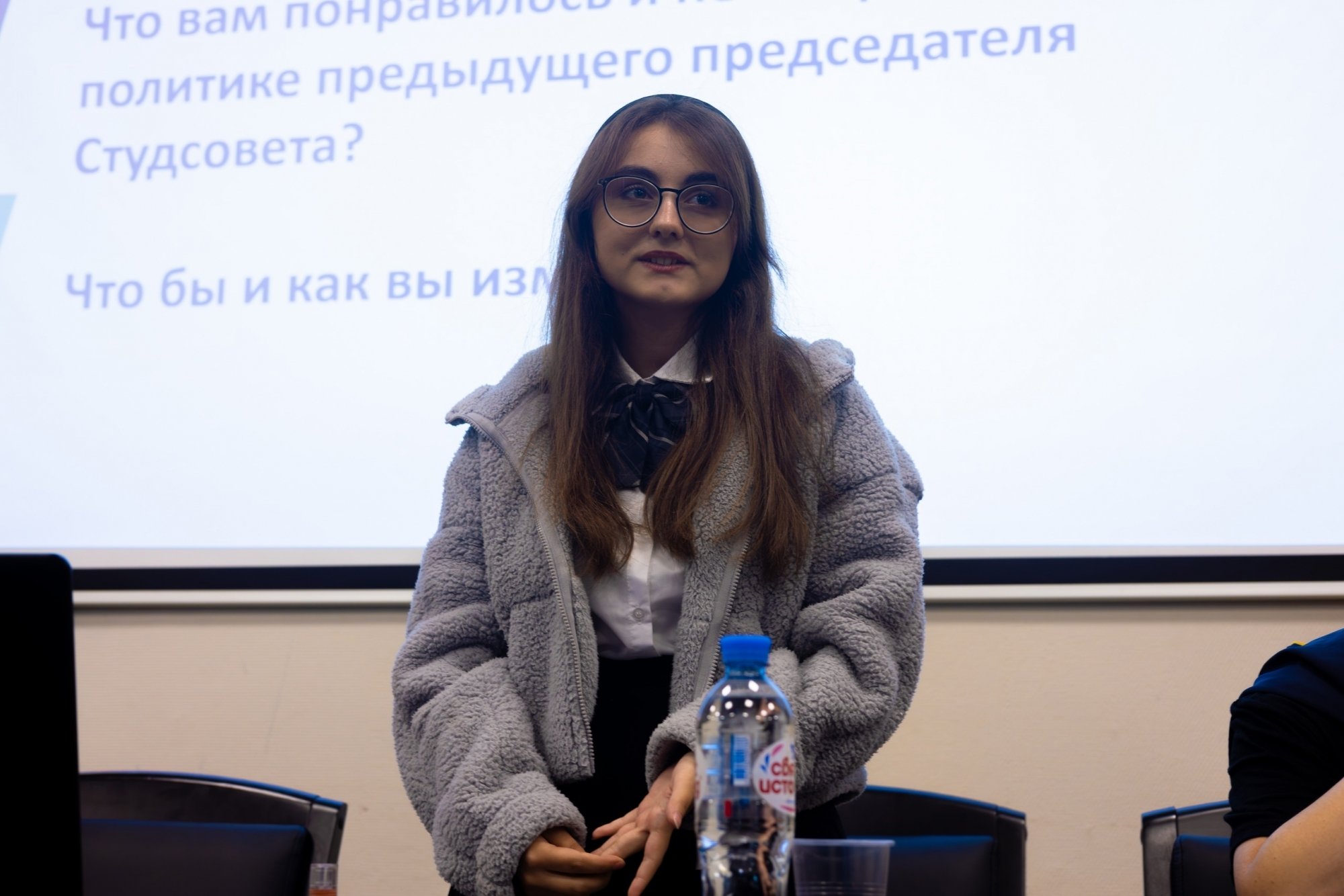 В первой части дебатов кандидаты отвечали на общие вопросы от своего предшественника: делали предвыборные обещания, говорили о коммуникации со студентами и о формировании будущей команды студсовета, делились планами.