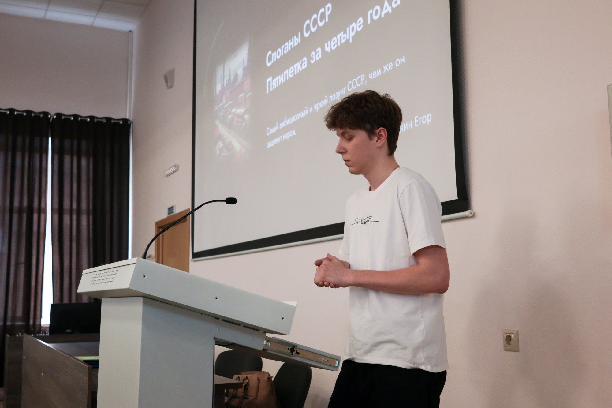 Студенты представили доклады, посвящённые происхождению, историческому контексту и роли в общественной жизни советских лозунгов: Константин Ким — «Кто не работает, тот не ест!», Егор Девочкин — «Пятилетку в четыре года!», Александр Журавлёв — «Мир! Труд! Май!», Михаил Сапрыкин — «Трезвость — норма жизни!», Максим Жамлин и Георгий Глонти — «От каждого по способностям, каждому по труду», Тогрул Сеидов — «Догнать и перегнать!».