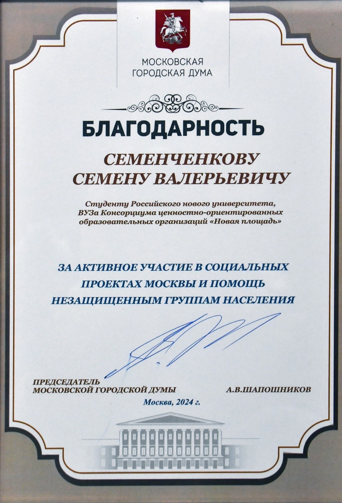 Мы с Марией Андреевной активно занимаемся сбором гуманитарной помощи для участников СВО и госпиталей, где раненые бойцы проходят лечение и реабилитацию. Я сам вожу грузы на линию фронта. Очень благодарен Московской городской думе и Алексею Валерьевичу Шапошникову за высокую оценку нашего с коллегами труда. Рад быть частью отличной команды неравнодушных, коими можно назвать буквально каждого студента нашего вуза!