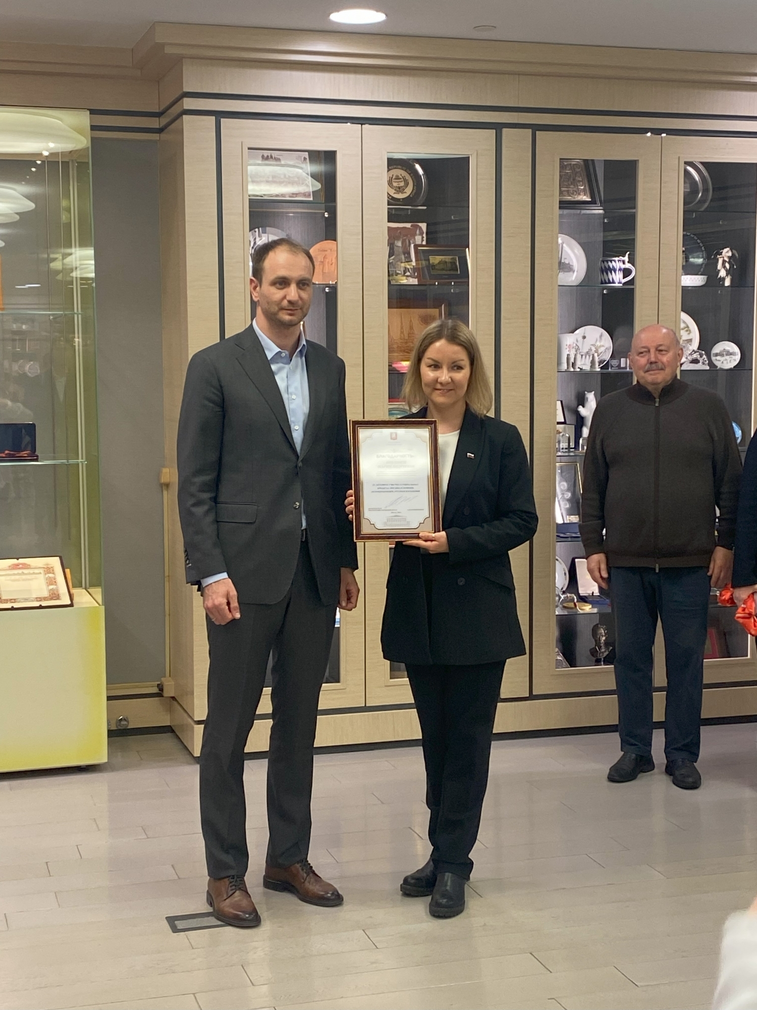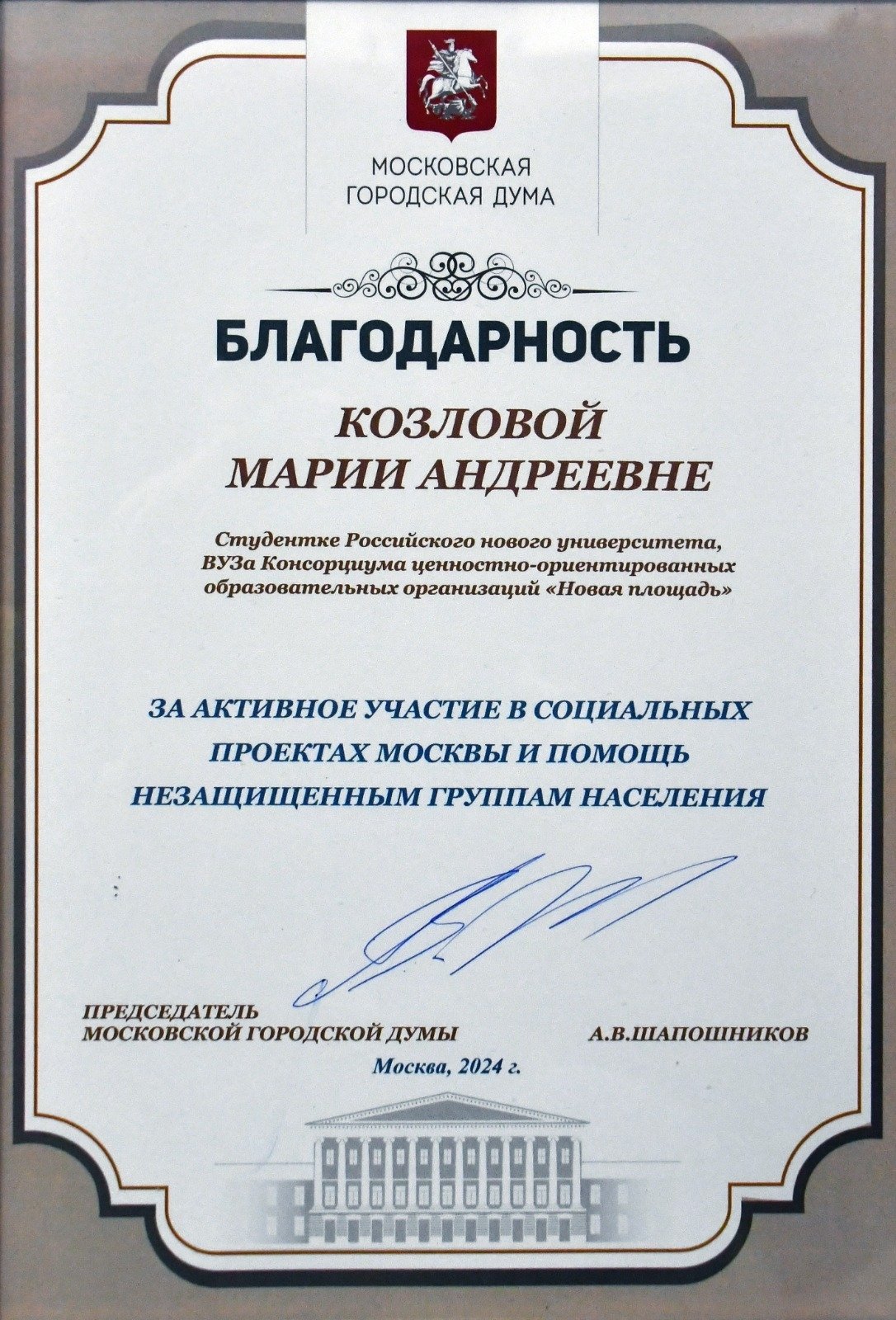 Студент 4 курса специалитета ИЭУиФ по направлению подготовки «Таможенное дело» Семен Валерьевич Семенченков и аспирантка по специальности «Педагогика» («Общая педагогика, история педагогики и образования») Мария Андреевна Козлова, удостоились благодарностей «За активное участие в социальных проектах Москвы и помощь незащищенным группам населения». Почетные документы обучающимся вручил депутат Московской городской думы Щитов Кирилл Владимирович.