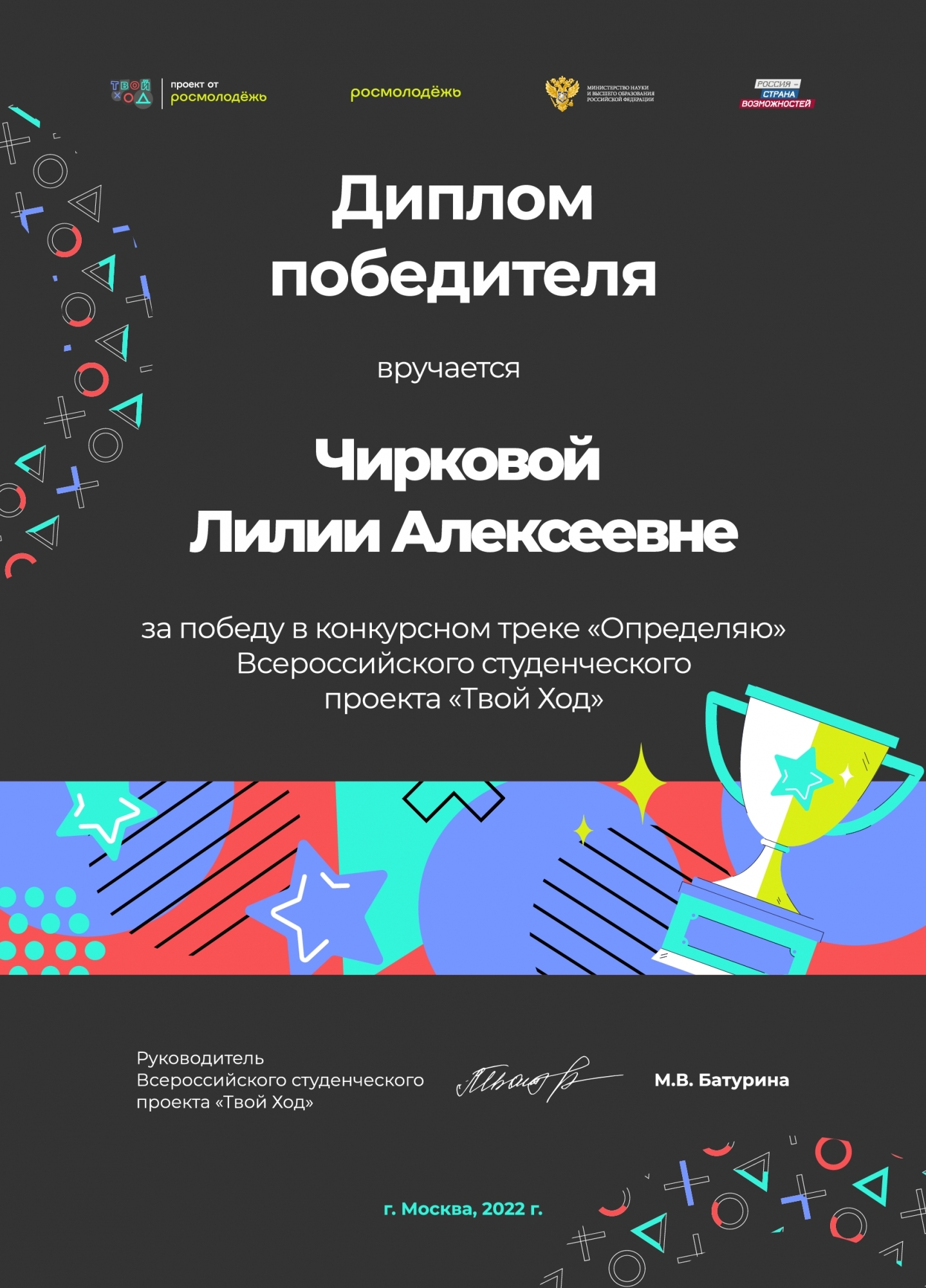 — В конкурсе я принимаю участие с первого сезона. Есть три направления: «Делаю», «Определяю» и «Создаю». «Определяю» — направление для тех, у кого есть идеи по изменению и улучшению среды вузов. Студент не знает, как воплотить в жизнь свои идеи, но готов их озвучить. «Создаю» — для тех, кто готов разработать и провести образовательную активность, полноценное мероприятие. «Делаю» — для тех, кто уже разработал проект и реализует его. Я победила в направлении «Определяю». — поделилась информацией Лилия Чиркова.