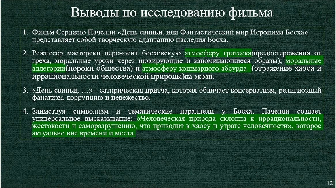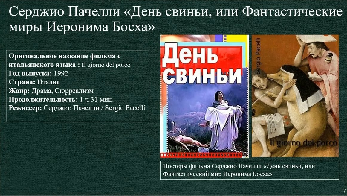 Студентка подготовила исследование на тему «Интерпретация Босха в фильме Серджио Пачелли «День свиньи, или Фантастические миры Иеронима Босха» под руководством доцента кафедры издательского дела БТ РосНОУ, кандидата филологических наук Ирины Александровны Таировой. Доклад был представлен в секции «Фольклор, литература и искусство: взаимодействие семиотических систем».