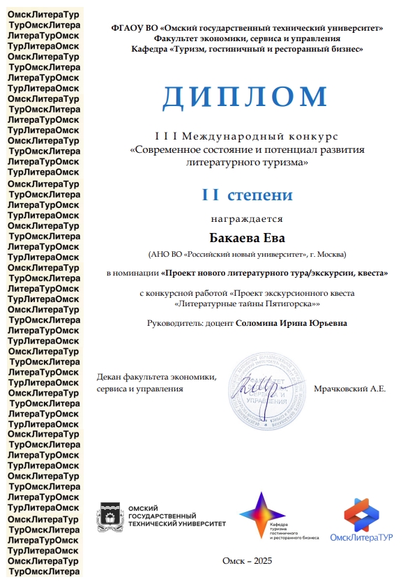 Студентка представила конкурсную работу «Проект экскурсионного квеста „Литературные тайны Пятигорска“», выполненную под руководством доцента кафедры туризма и гостиничного дела, кандидата философских наук Ирины Юрьевны Соломиной. Работа заняла второе место в номинации «Проект нового литературного тура/экскурсии, квеста».