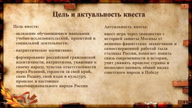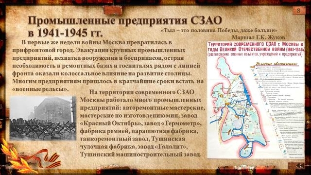 — Перед командой наших ребят стояло несколько сложных, но интересных задач: сбор материала о ключевых объектах тыла времен Великой Отечественной войны, находившихся в СЗАО города Москвы; разработка, создание и проведение членами команды квест-путешествия по «станциям», где каждая остановка посвящалась значимой стороне жизни тружеников тыла и становилась эмоциональным погружением в атмосферу времен войны 1941–1945 годов.