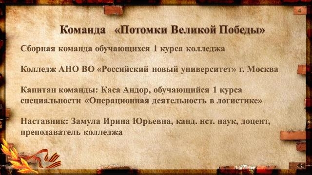 Участниками команды Колледжа РосНОУ под названием «Потомки Великой Победы» стали студенты 1 курса, капитаном — Каса Андор, обучающийся по специальности «Операционная деятельность в логистике», а наставником — Ирина Юрьевна Замула.