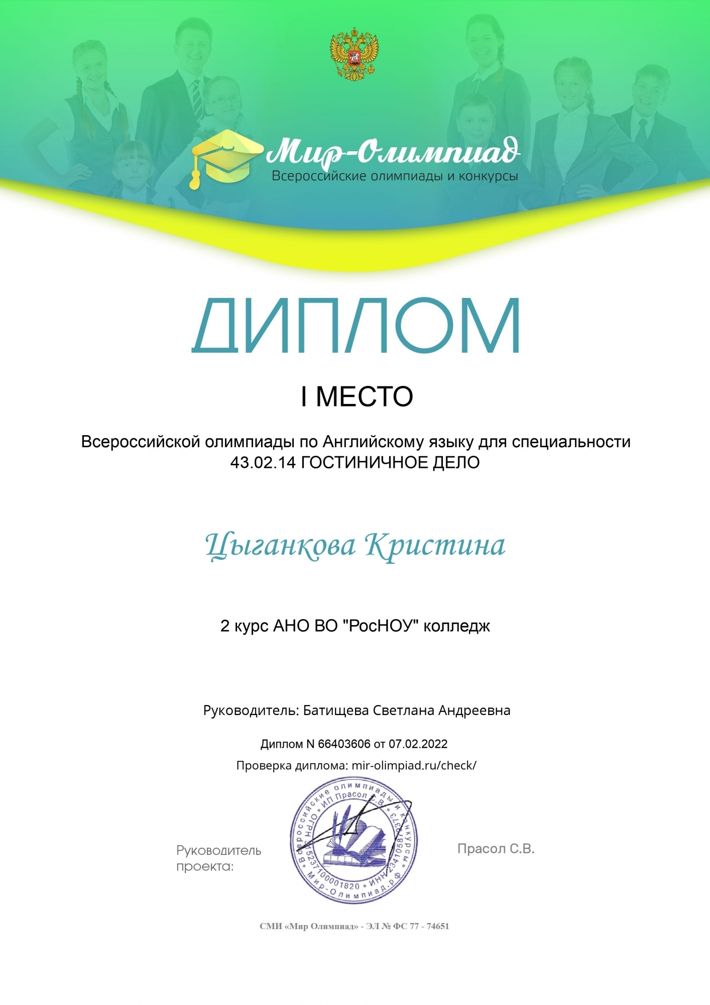 Отдельная благодарность выражается преподавателю колледжа РосНОУ Батищевой Светлане Андреевне за подготовку участников и победителей Всероссийской олимпиады по английскому языку по специальности «Гостиничное дело».