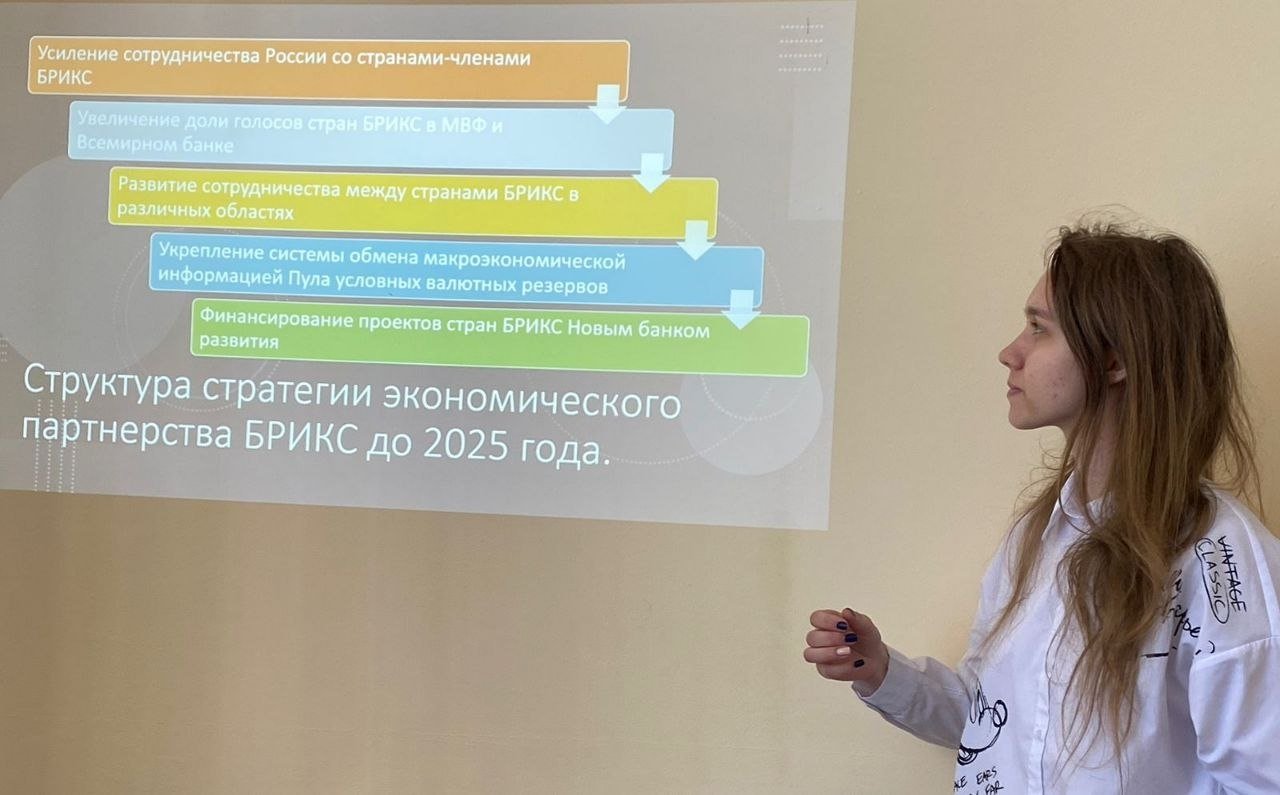 Она рассмотрела финансовые аспекты взаимодействия стран-участниц БРИКС и России. — Это взаимодействие было рассмотрено в контексте финансирования из средств Нового банка проектов, направленных на развитие российской экономики, и поддержания стабильности российской валюты с использованием средств Пула валютных резервов, — пояснила студентка.