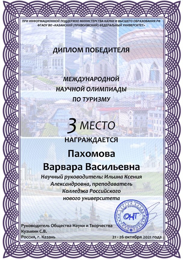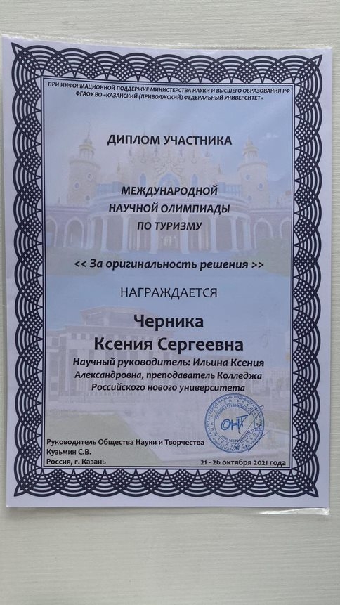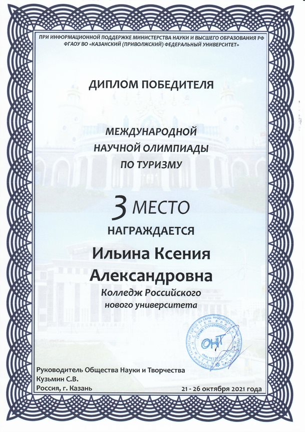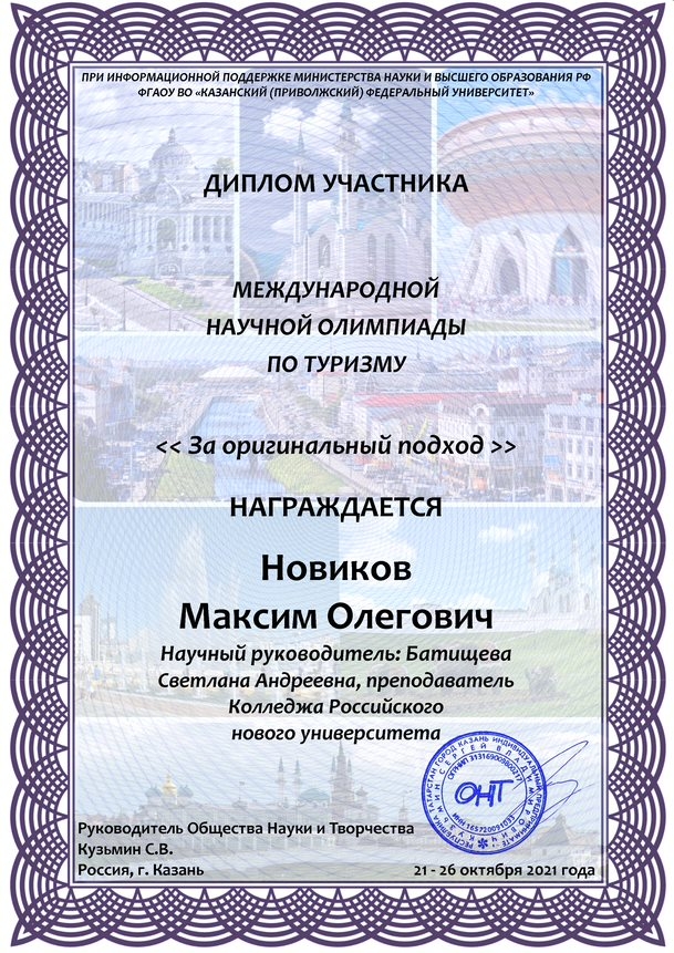 С 21 по 26 октября 2021 года в городе Казани прошла международная научная олимпиада по туризму, организованная Обществом науки и творчества .