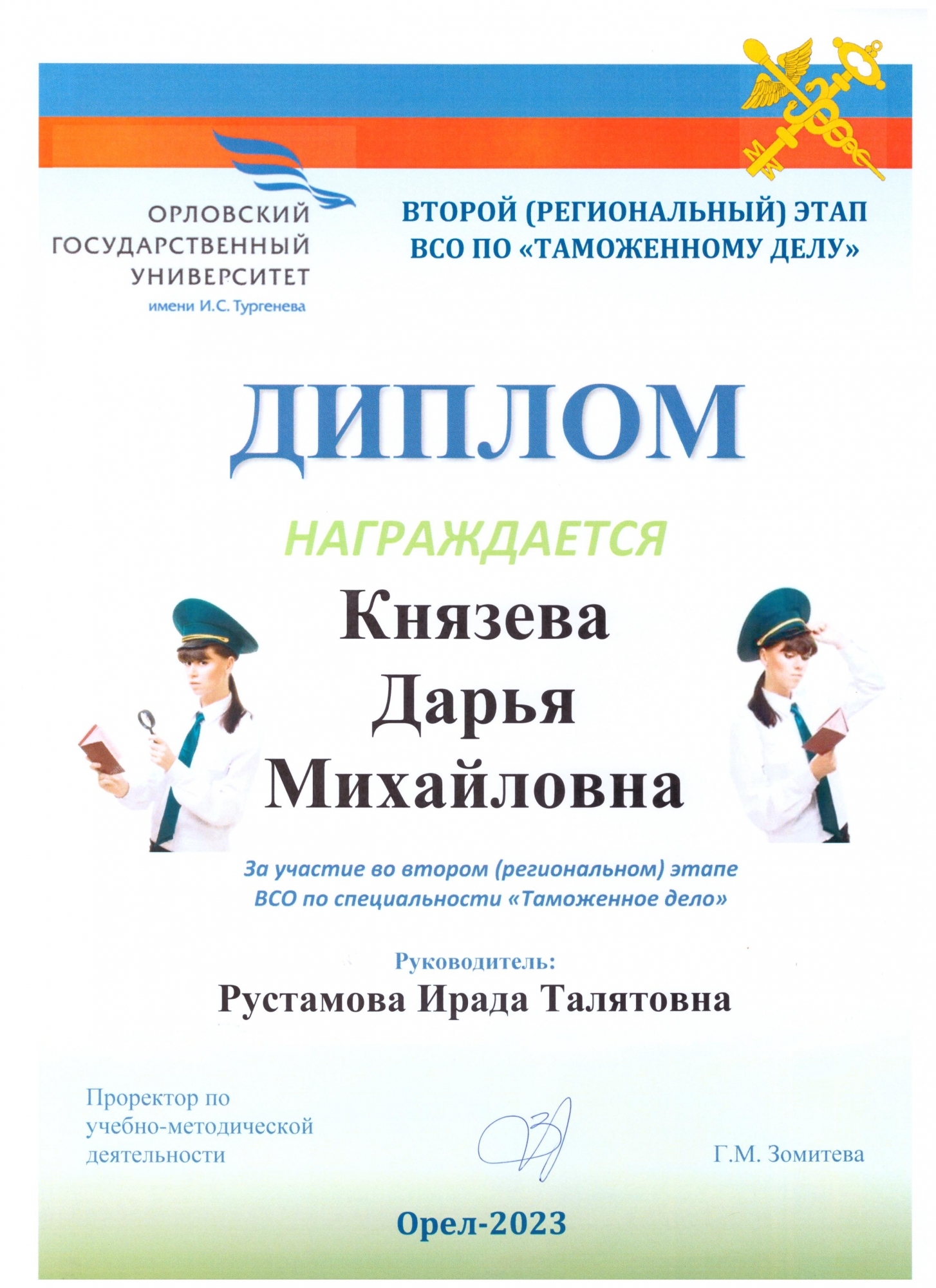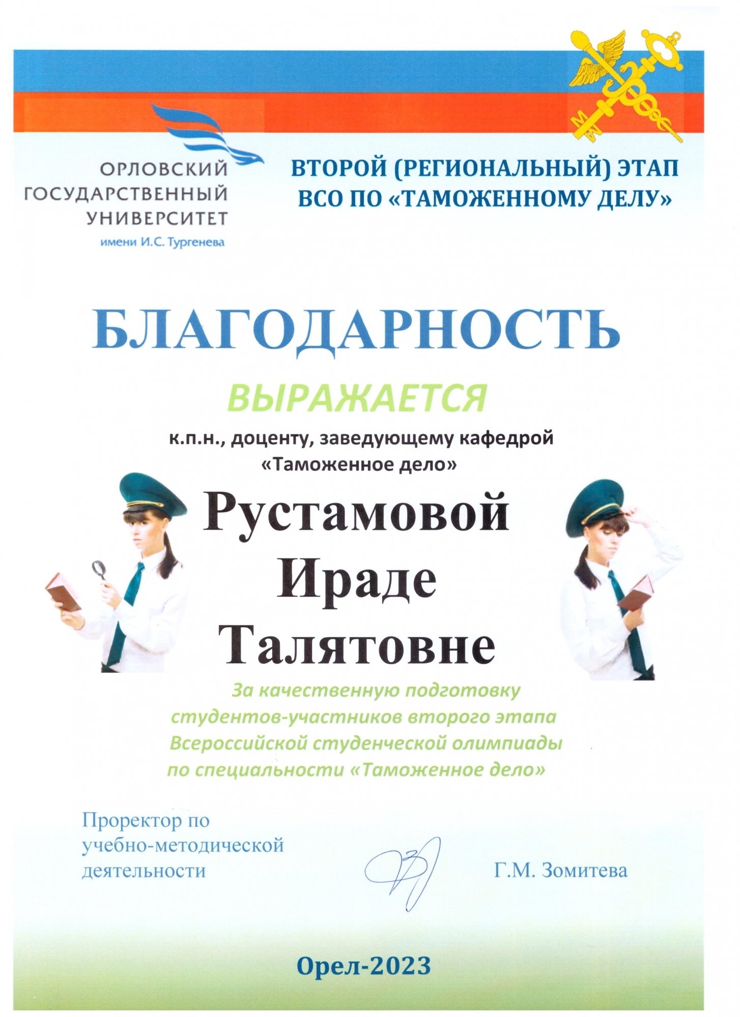 Всероссийская студенческая олимпиада по специальности «Таможенное дело» проводилась на базе кафедры товароведения и таможенного дела Орловского государственного университета имени И. С. Тургенева. В олимпиаде приняли участие 30 студентов из 10 образовательных организаций России и Республики Беларусь. Студенты состязались в личном и командном первенствах, участвовали в творческом конкурсе.