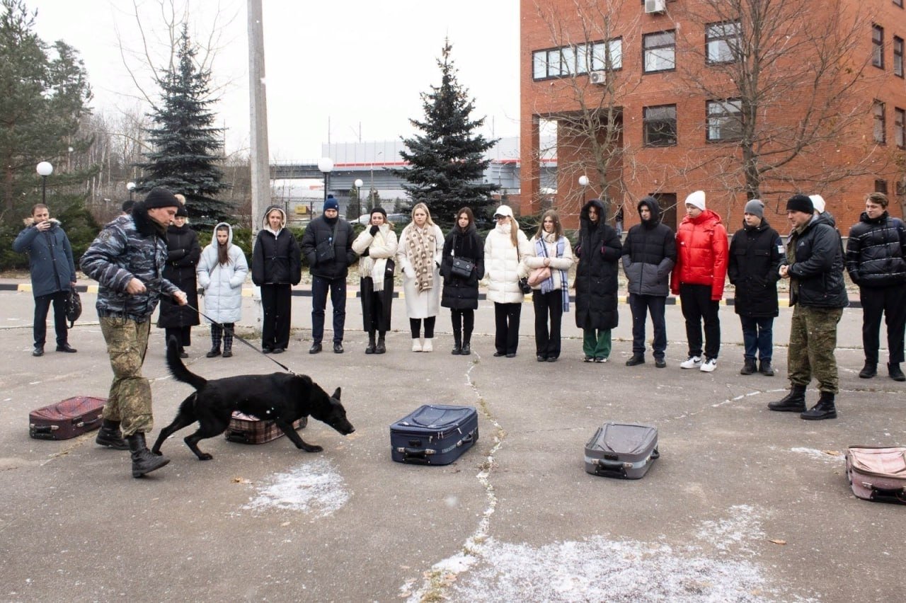 Представители кинологического подразделения таможни продемонстрировали работу служебных собак в процессе поиска табачных изделий, что вызвало у студентов большой интерес. Должностные лица рассказали об особенностях несения службы, о специфике обучения служебных собак и ответили на большое количество вопросов. Далее студентам показали, в каких условиях живут четвероногие помощники и как осуществляется их перевозка до Международного аэропорта Шереметьево.