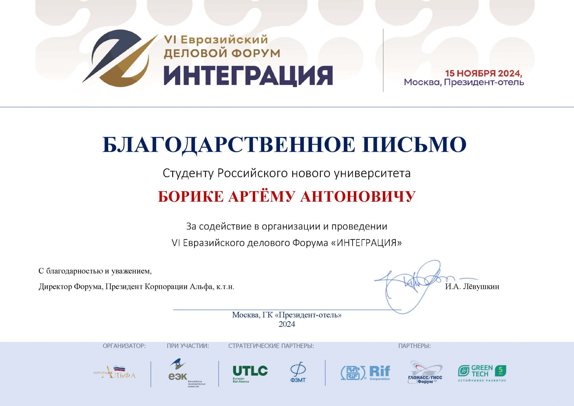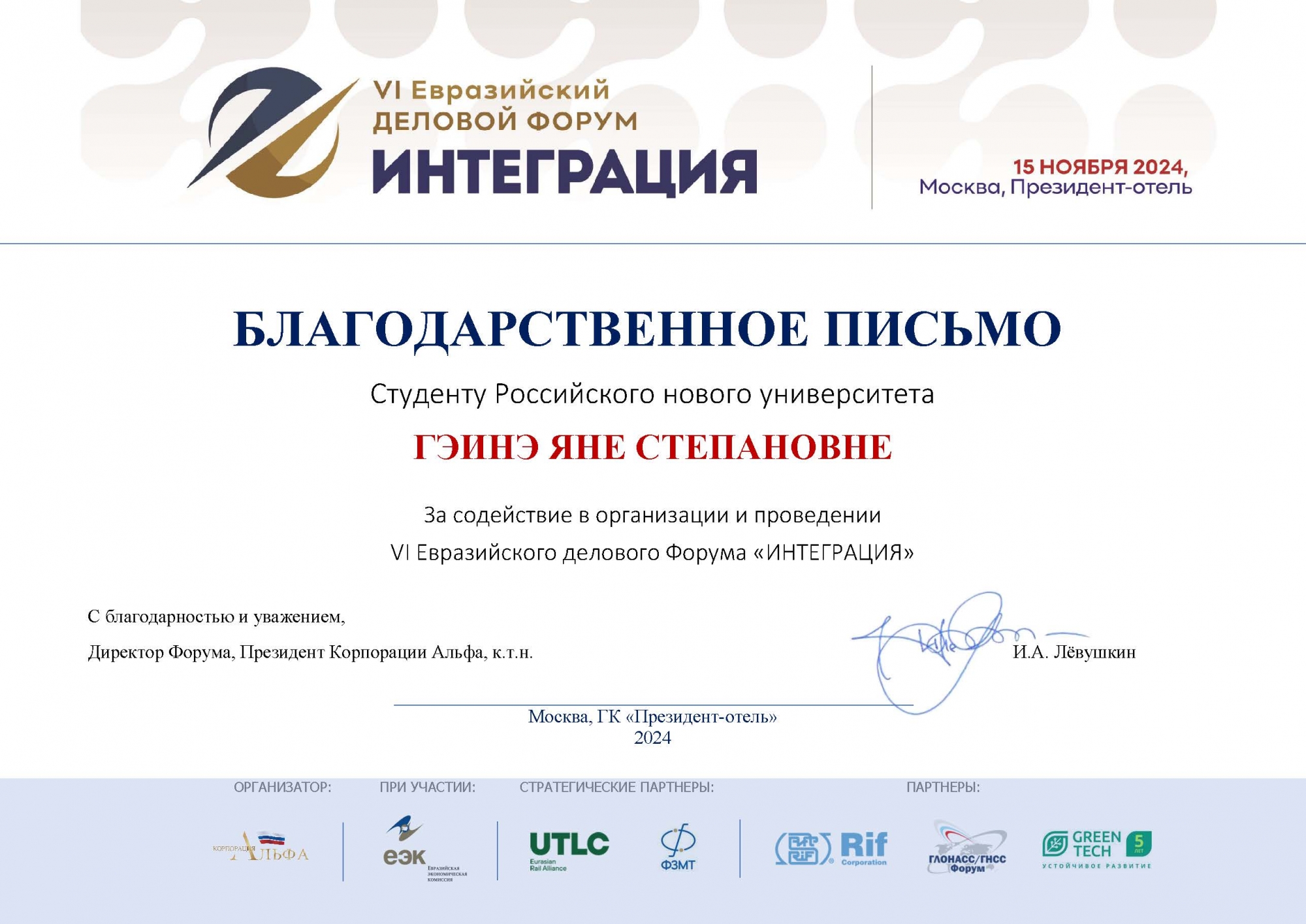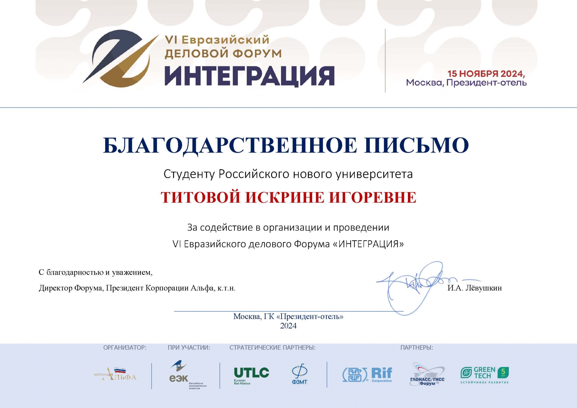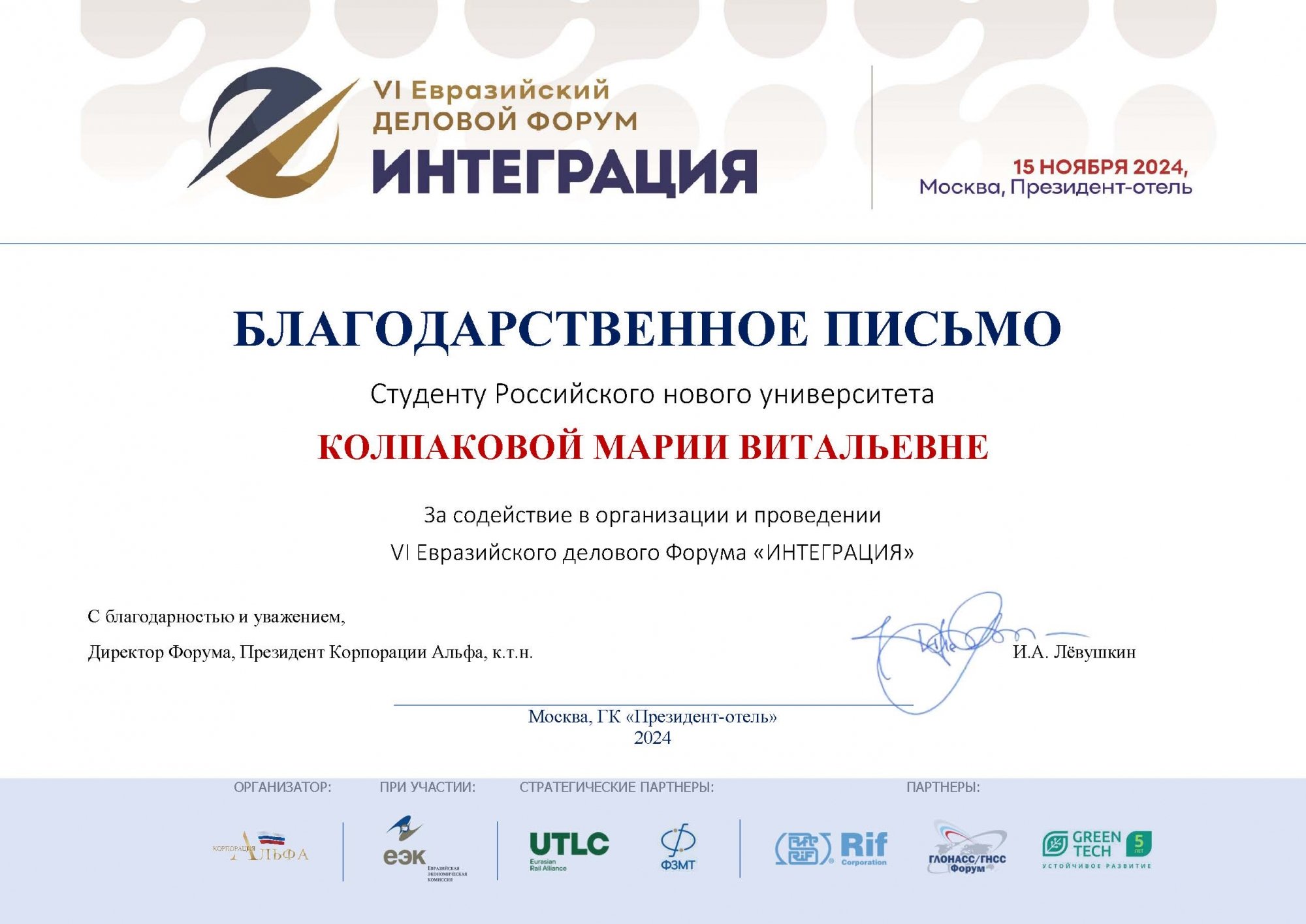 За помощь в проведении форума студенты получили благодарственные письма за подписью директора форума, президента АНО по содействию экономической активности предпринимателей «Корпорация Альфа» Ивана Александровича Лёвушкина.