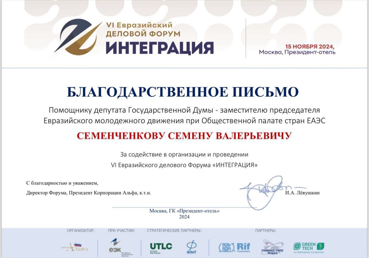 Одним из участников форума стал студент 5 курса Института экономики, управления и финансов Российского нового университета (ИЭУиФ РосНОУ) направления подготовки «Таможенное дело» Семён Семенченков — член Комитета по развитию евразийской молодёжной политики и дипломатии Общественной палаты (ОП) ЕАЭС и заместитель председателя Евразийского молодежного движения при ОП ЕАЭС.