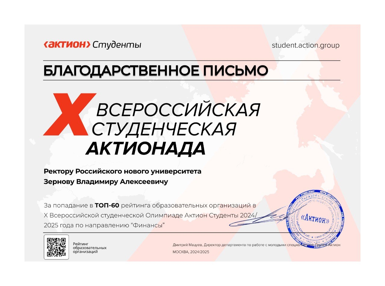 Уважаемый Владимир Алексеевич! Ваш вклад в развитие компетенций и навыков студентов, а также в их вовлечение во внеучебную жизнь сложно переоценить! Направляем благодарность за попадание Вашей образовательной организации в рейтинг Актионады. Всегда будем рады сотрудничеству и поддержке инициативы Ваших студентов. Также заранее приглашаем студентов РосНОУ принять участие в XI Всероссийской студенческой Актионаде, старт которой назначен на 1 сентября 2025 года.