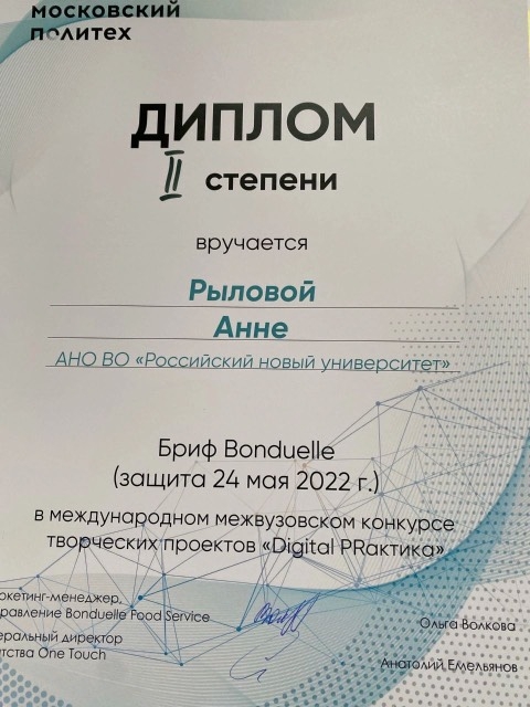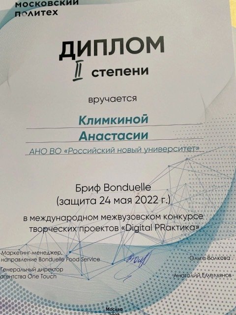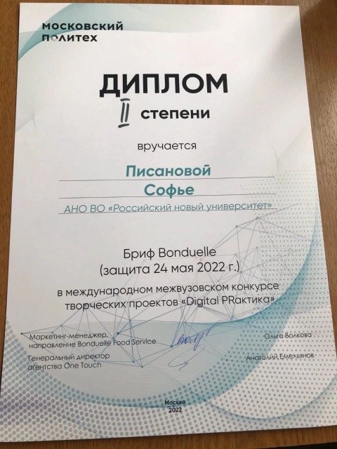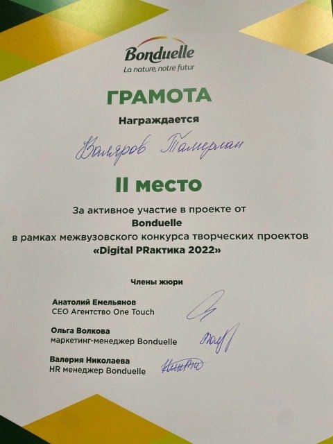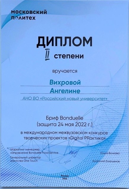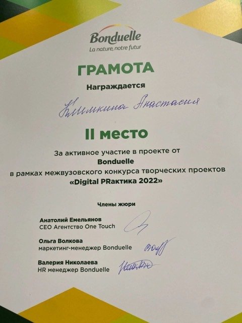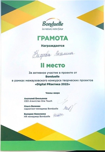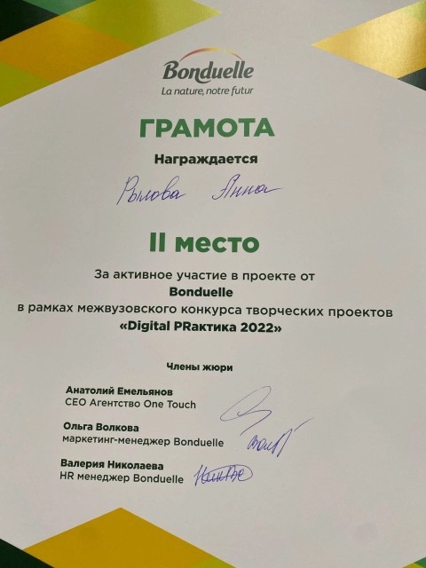 — «Digital PRактика» — отличная проверка hard skills по рекламе и связям с общественностью, — отметила участница команды Bonduelle Ангелина Вихрова. — Конкурс даёт студентам старт к поиску себя, поиску возможностей и развитию карьеры.