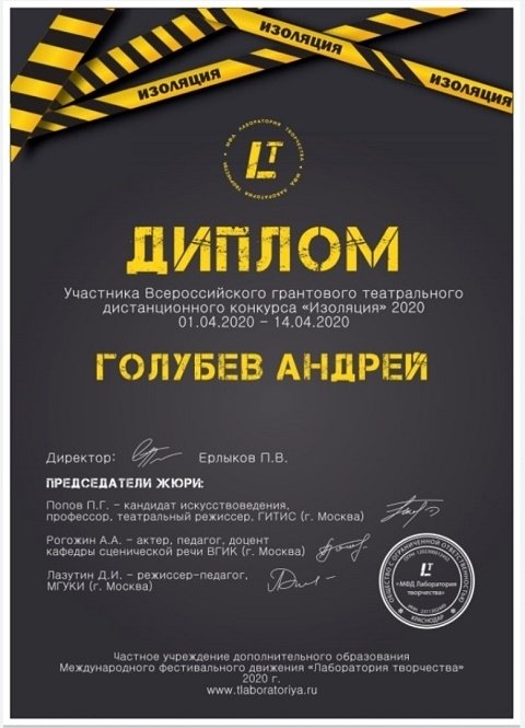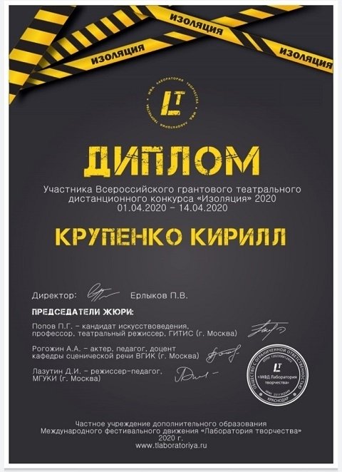 С 1 по 14 апреля 2020 года прошёл Всероссийский грантовый дистанционный театральный конкурс «Изоляция 2020», организованный международным фестивальным движением «Лаборатория творчества».
