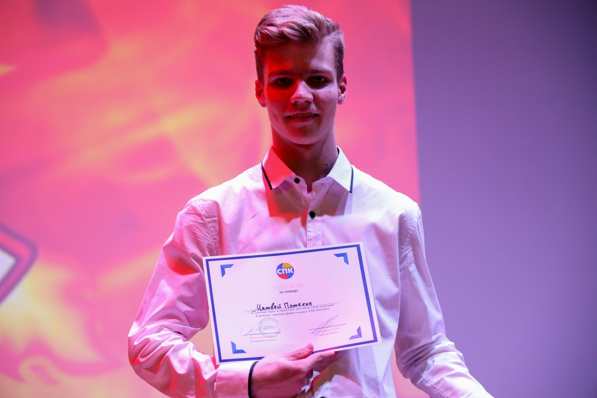 Будущие парламентарии рассуждали об актуальности профориентационных классов в школах, необходимости авторского права и формах власти и спорили о том, является ли высшее образование панацеей для нашей страны. Темы участники выбирали сами, и судя по поддержке зрителей, эти вопросы действительно волнуют активную молодежь. Именно поддержка аудитории была решающей для выступающих. У зрителей была возможность задавать вопросы, и выбор победителя основывался на мнении зала, симпатию к каждому выступающему измеряли с помощью шумомера. Выступали четыре пары оппонентов. В одной из них студент РосНОУ Денис Засимов превзошел своего конкурента.