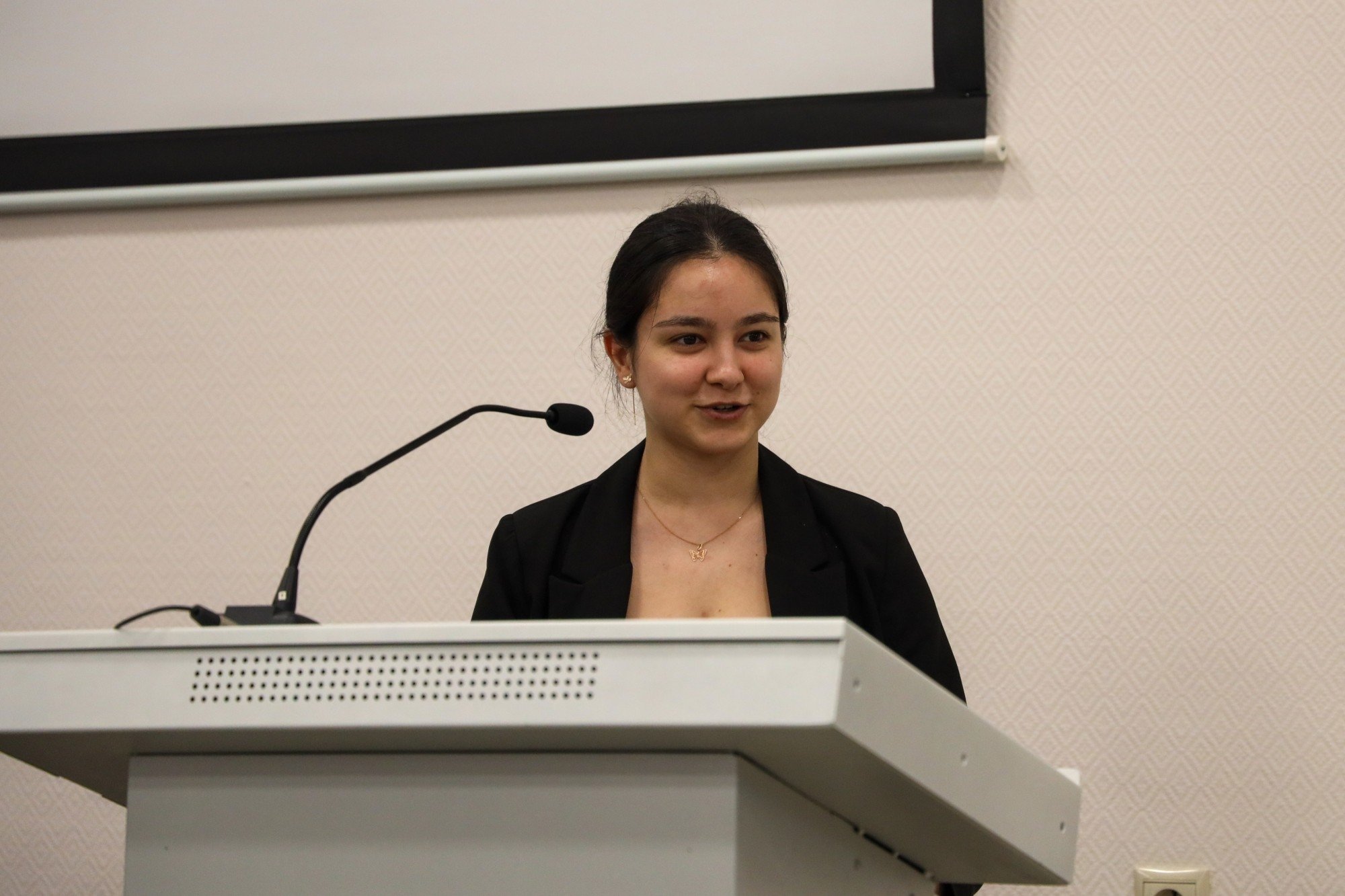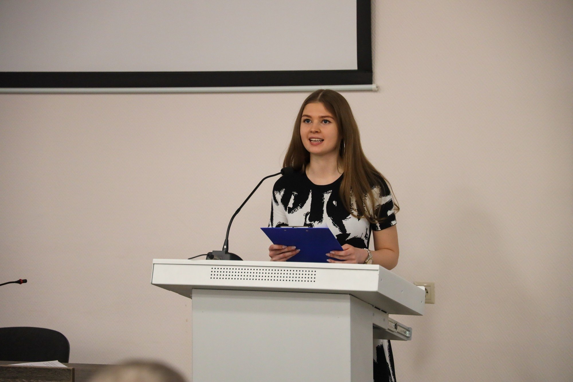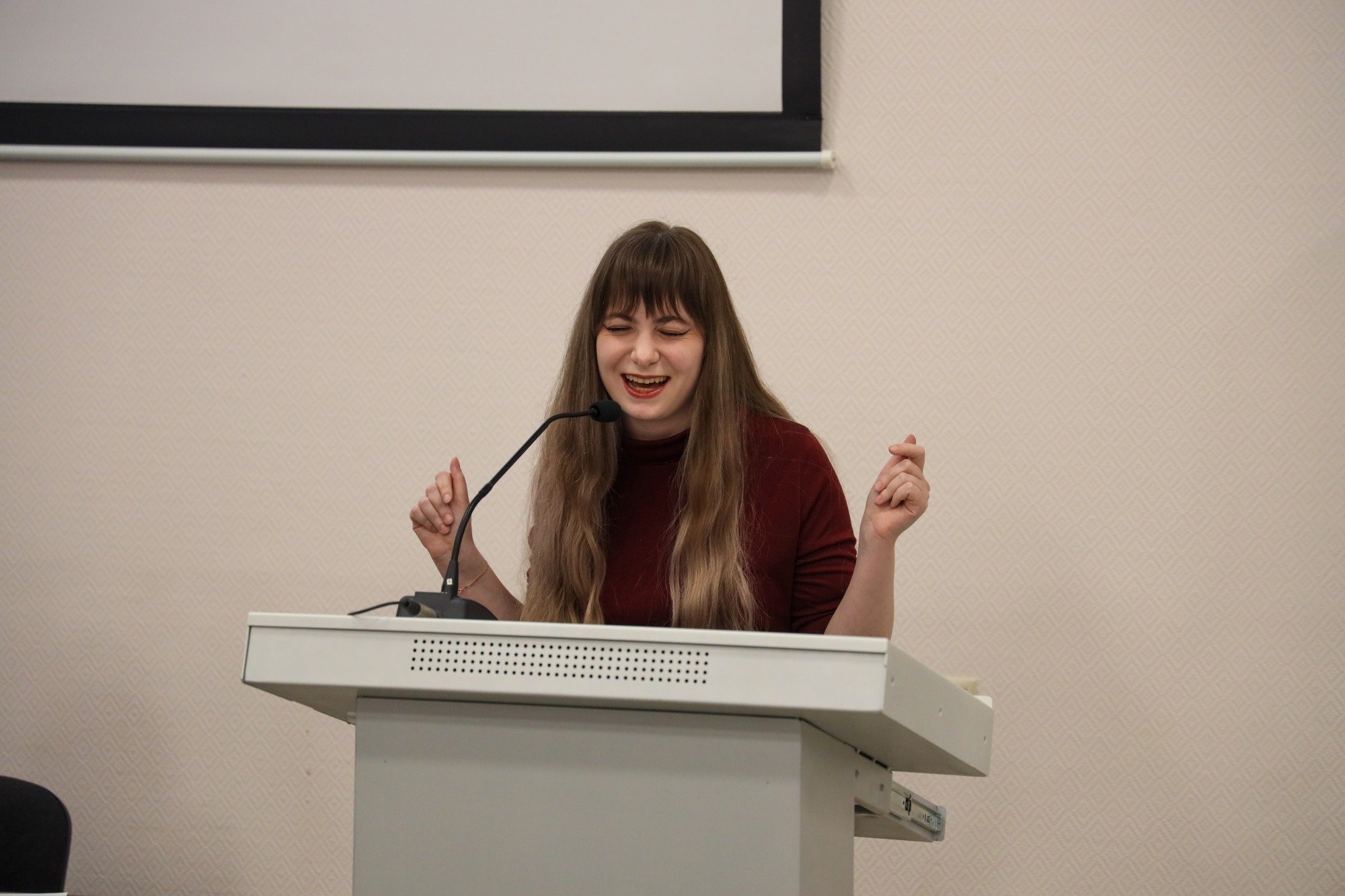 Профессиональному жюри больше всего понравилось выступление Клары Авербух (4 курс, ГИ) «Заимствованные слова и их влияние на русский язык». Речь была образцом безупречного стиля, спикер очень грамотно взаимодействовала с аудиторией и сразу объяснила, почему именно эта тема так важна для нее. Даже имя Клара — заимствованное, в переводе означает «светлая», так что перед аудиторией, при отсутствии в нашем языке иностранных слов, будет выступать уже Светлана.