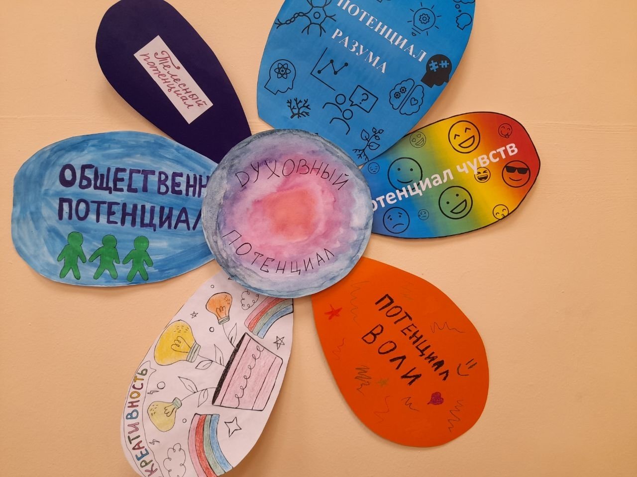 — Здоровье — понятие комплексное. Оно включает в себя развитие разных сфер личности, — отметили ведущие. — Давайте вспомним концепцию здоровья обучающихся, разработанную выдающимся психологом ХХ столетия Борисом Герасимовичем Ананьевым, и построим «Цветок потенциалов».