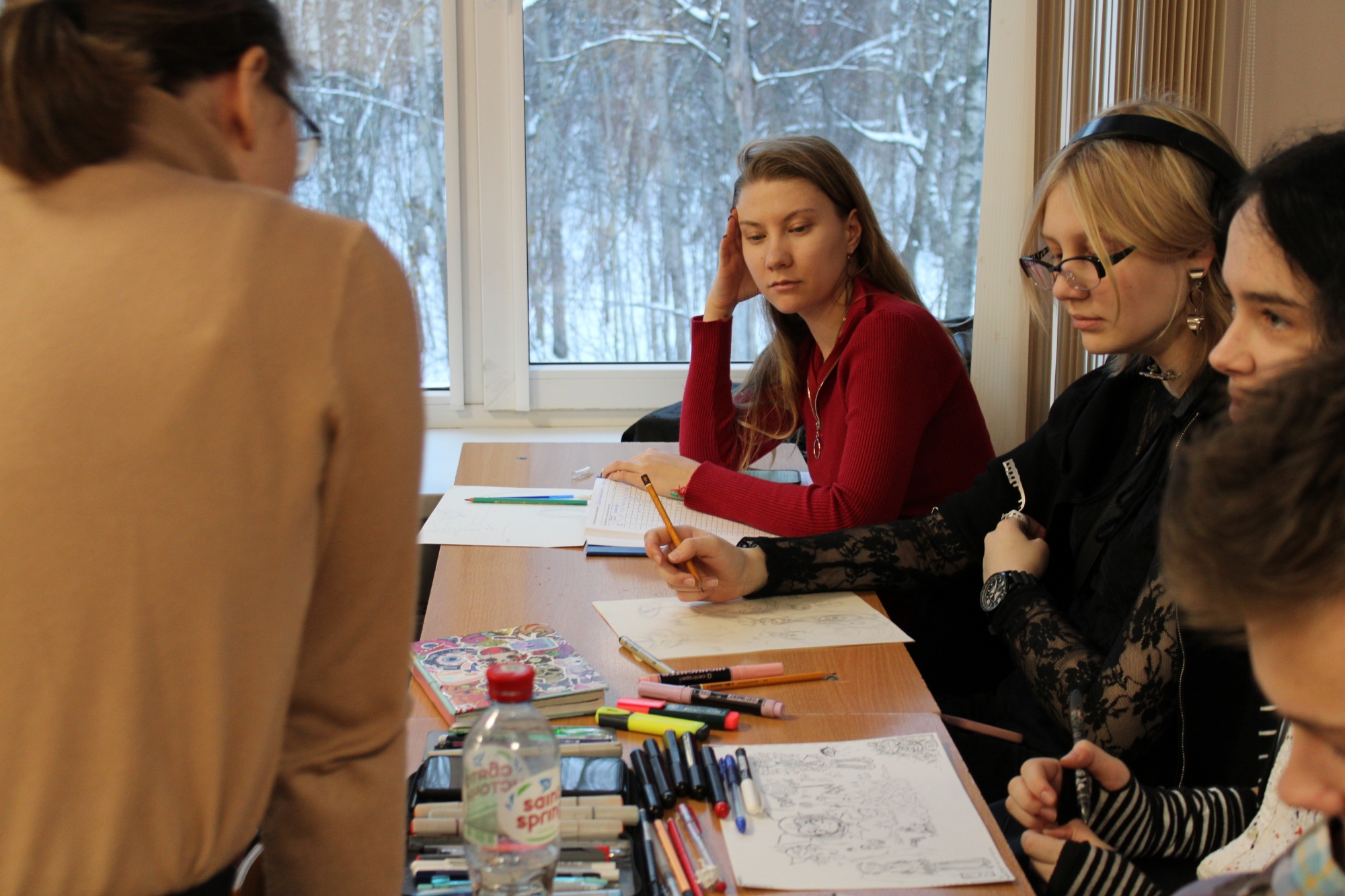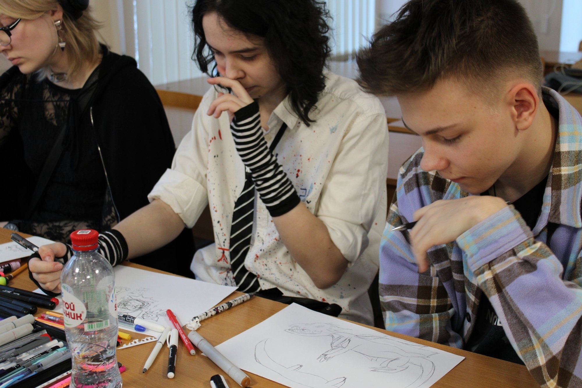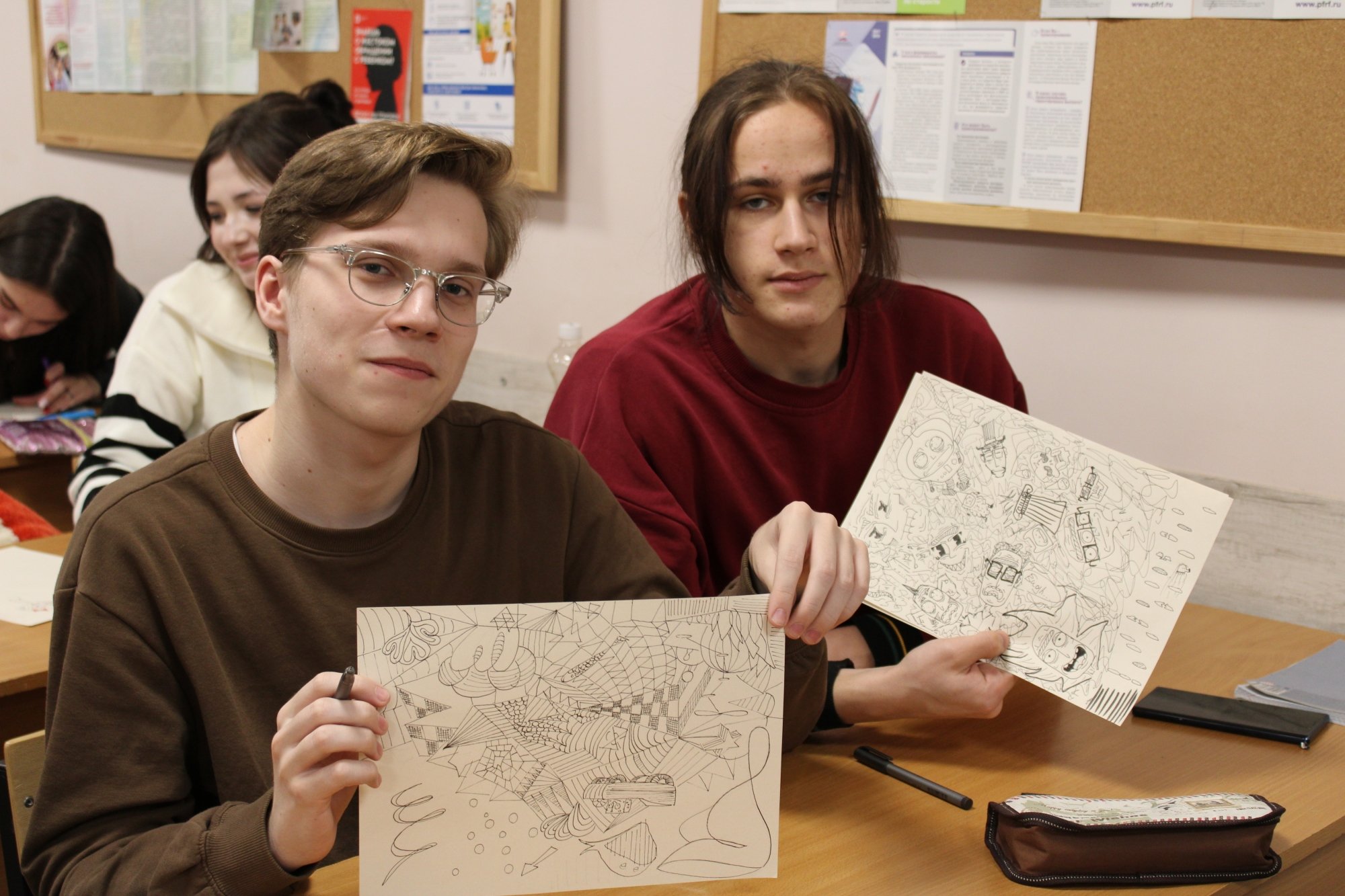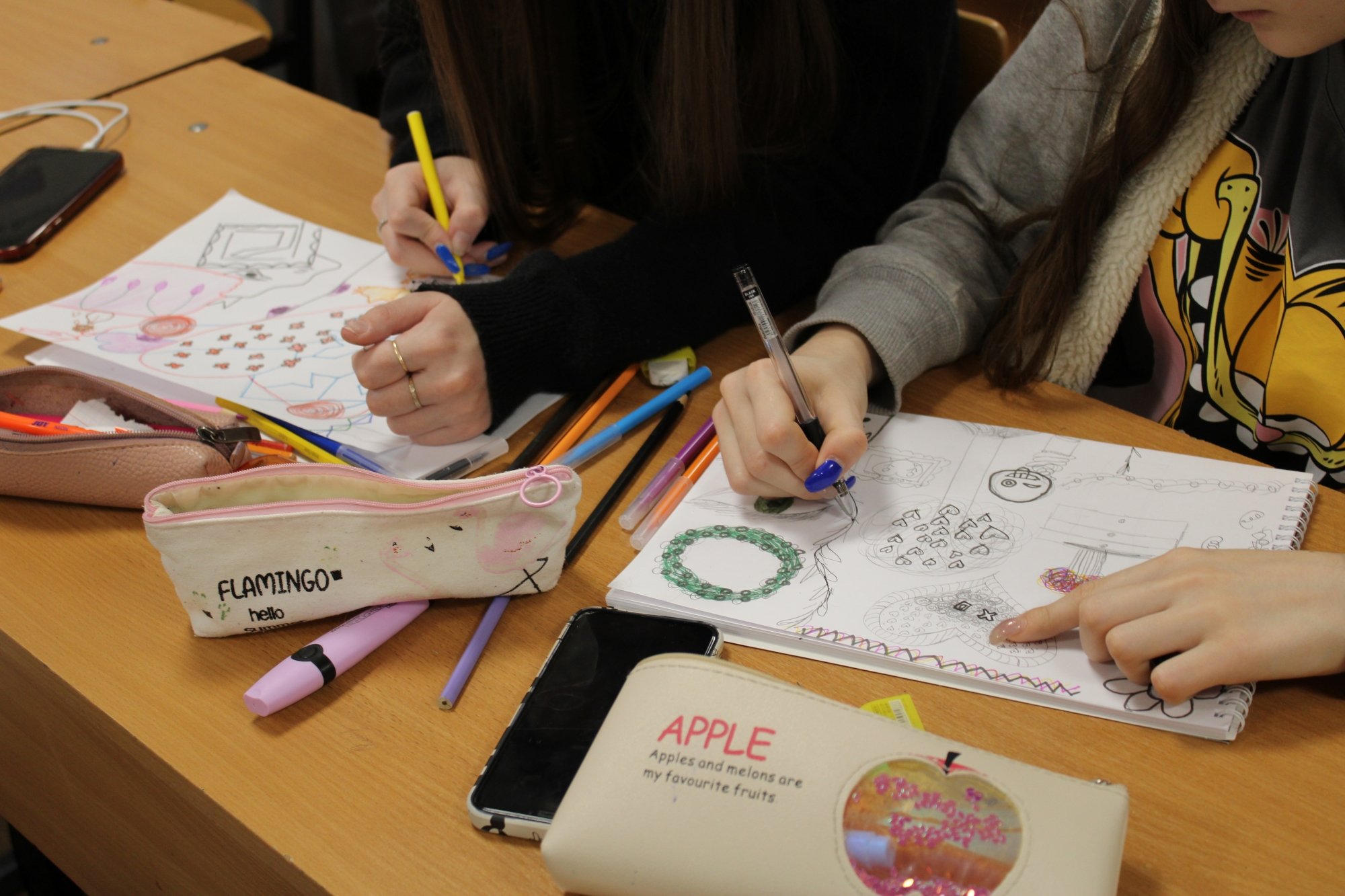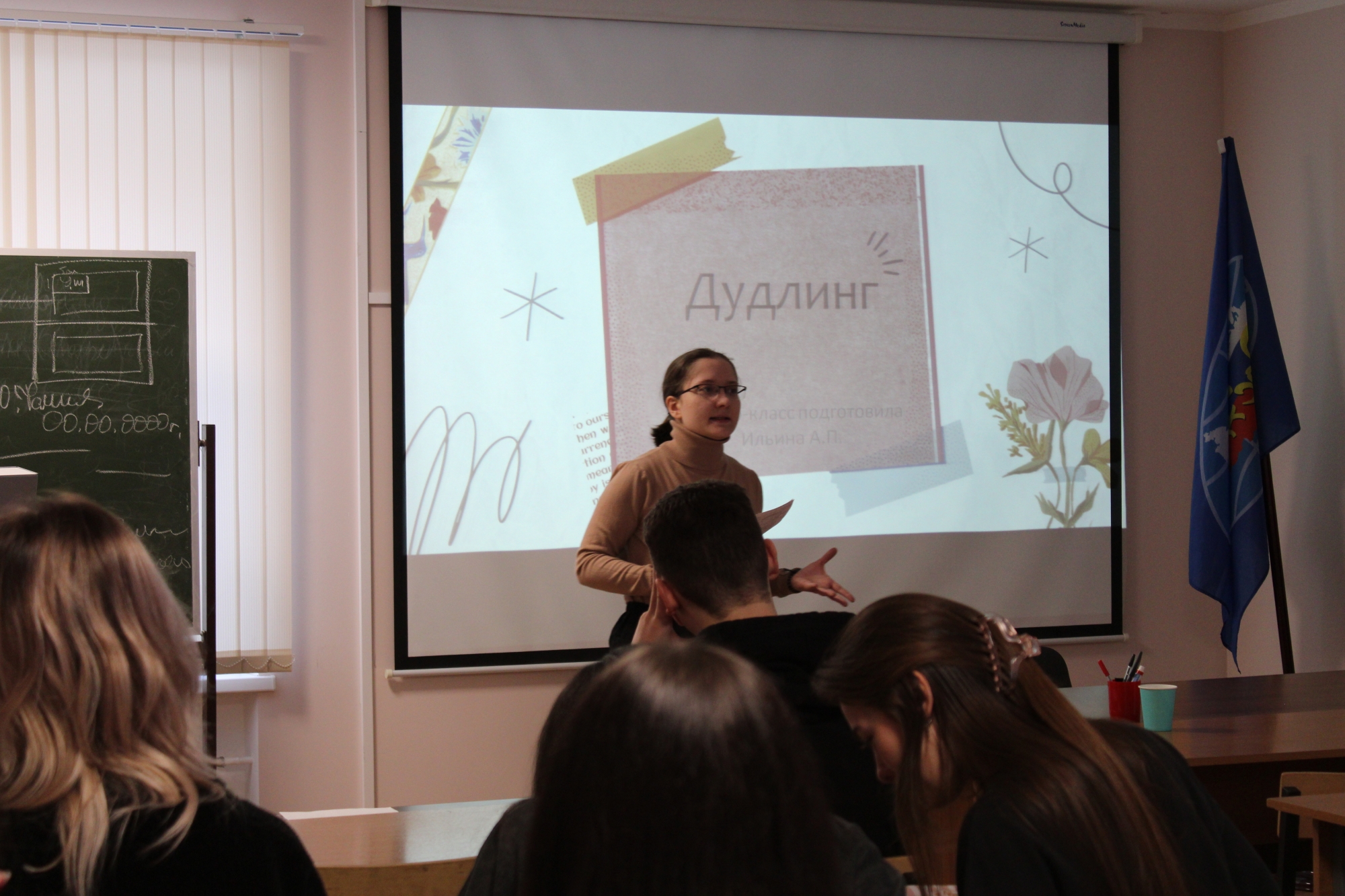 В первый день недели «Рекламы» также прошел мастер-класс по живописи в технике «Дудлинг» (произвольное рисование узоров) преподавателя Павловой А. П. для первого и второго курсов.