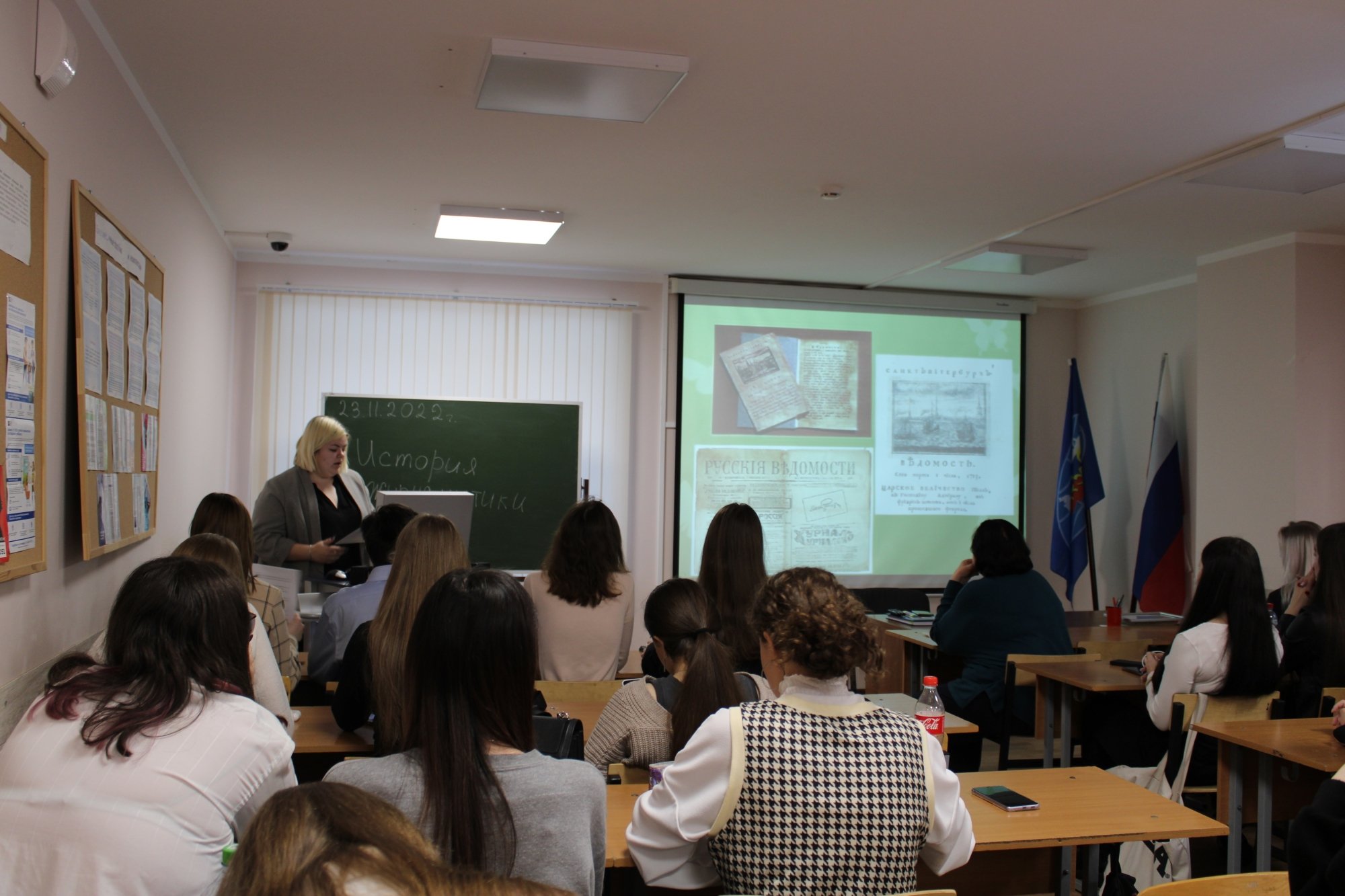 Первый и четвертый курс посетили открытый урок по дисциплине «Основы журналистики» преподавателя Джураевой Н. Ю, где студенты выпускной группы выступили с докладами о выдающихся журналистах, после чего все участвовали в викторине «По волнам истории журналистики».