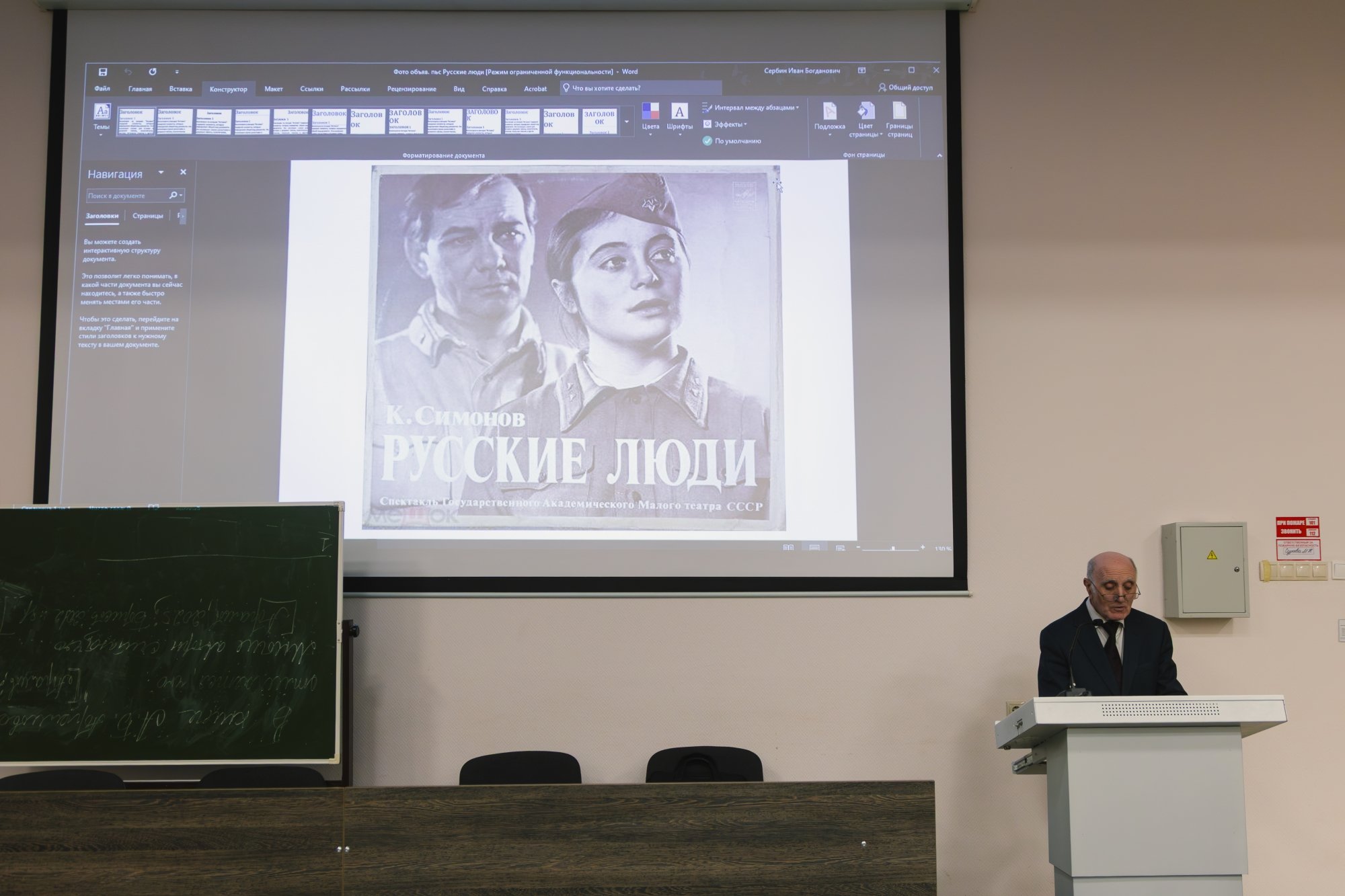 В среду, 26 ноября, в Российском новом университете прошёл исторический кинолекторий, посвящённый жизни и творчеству Константина Михайловича Симонова. Мероприятие провёл кандидат исторических наук, доцент кафедры философии РосНОУ Василий Иванович Кирмикчи. Кинолекторий был приурочен к 110-летию со дня рождения писателя, поэта и военного корреспондента.