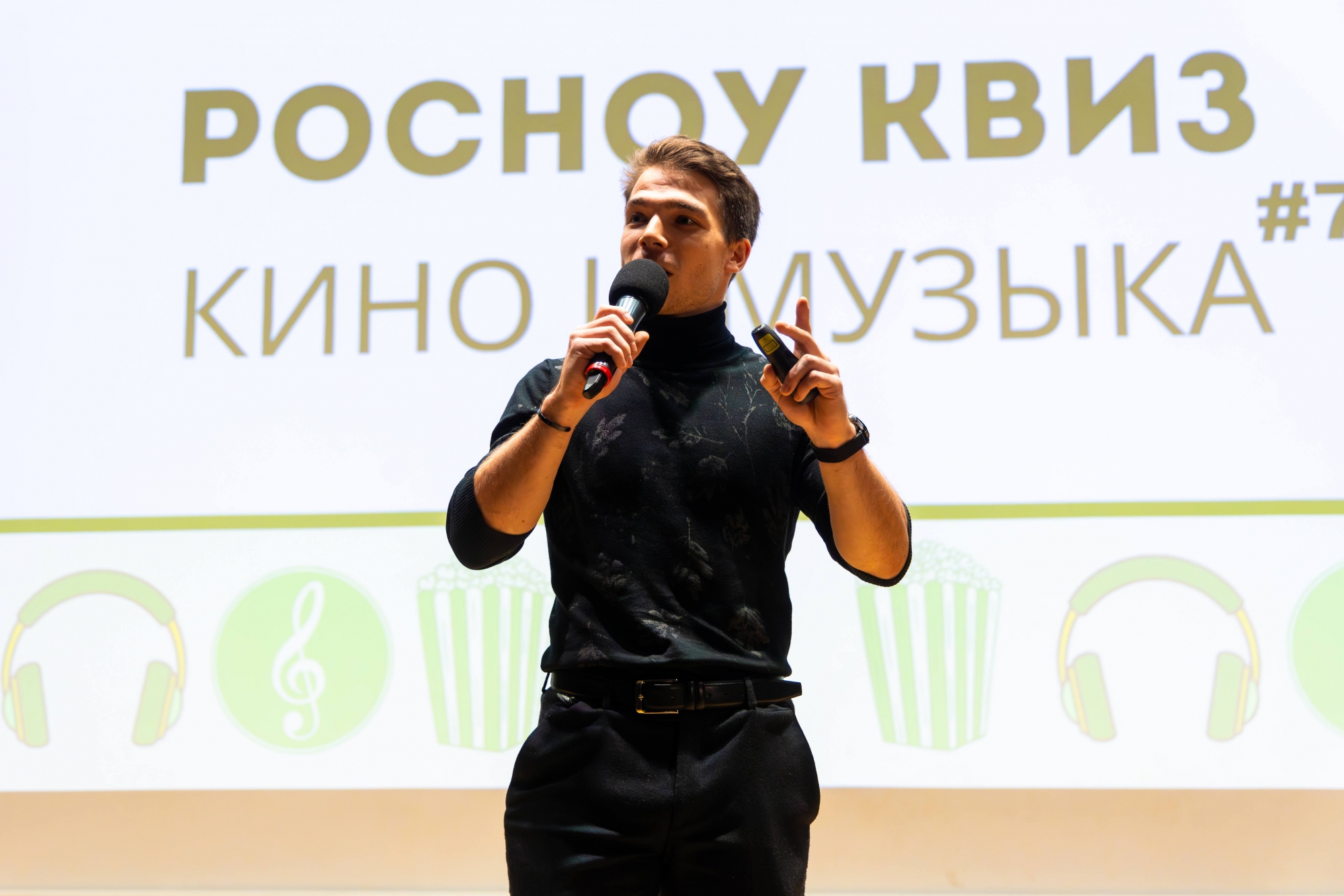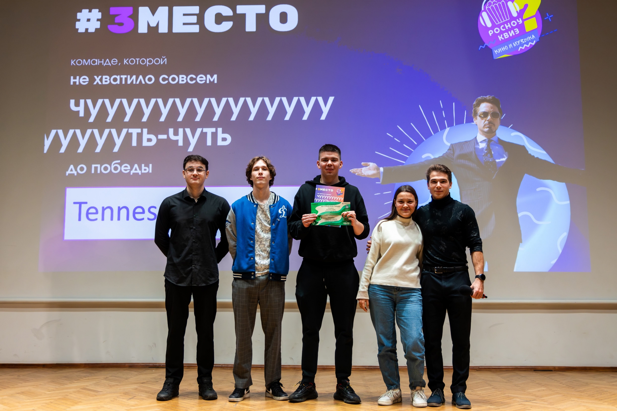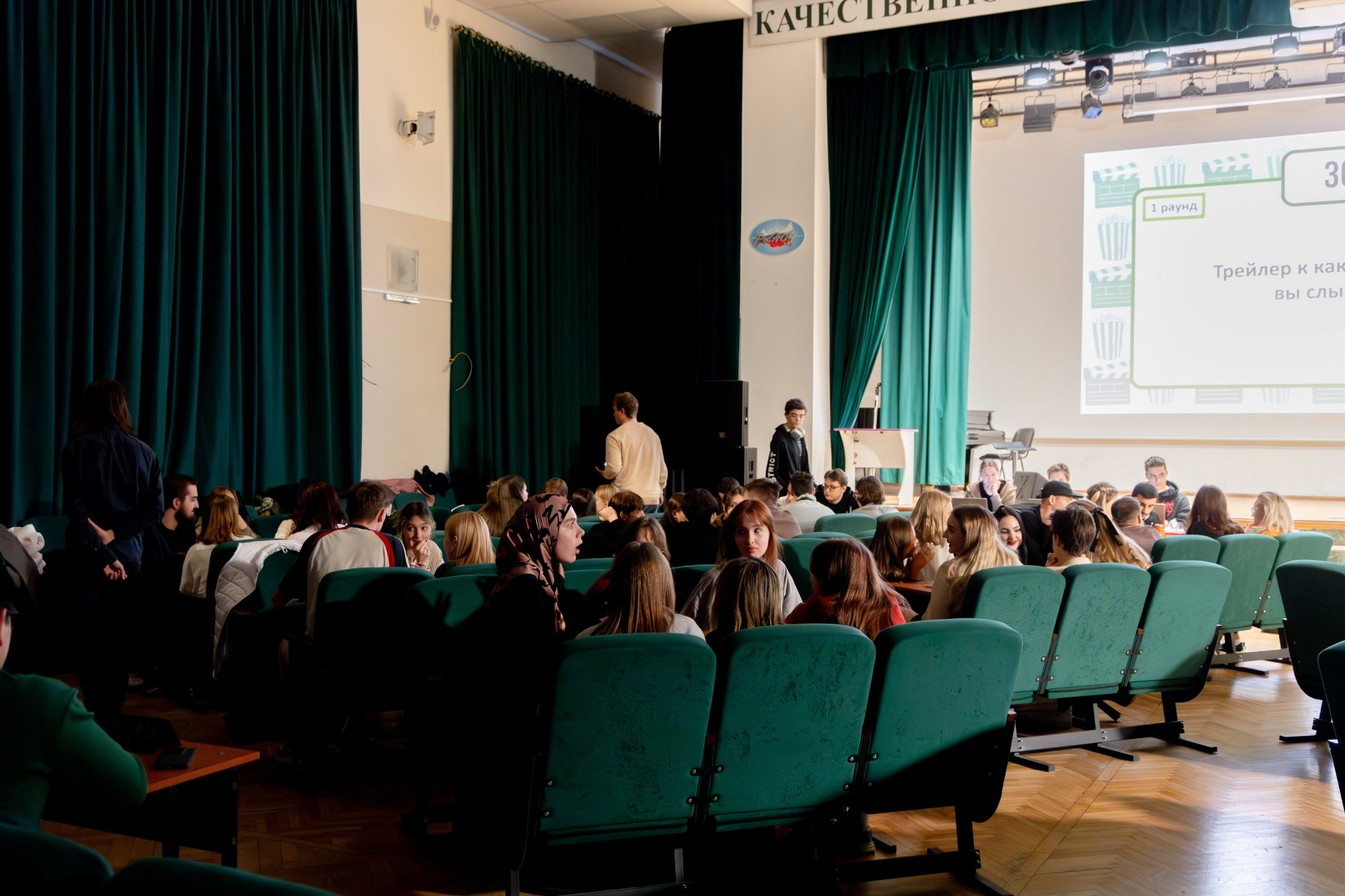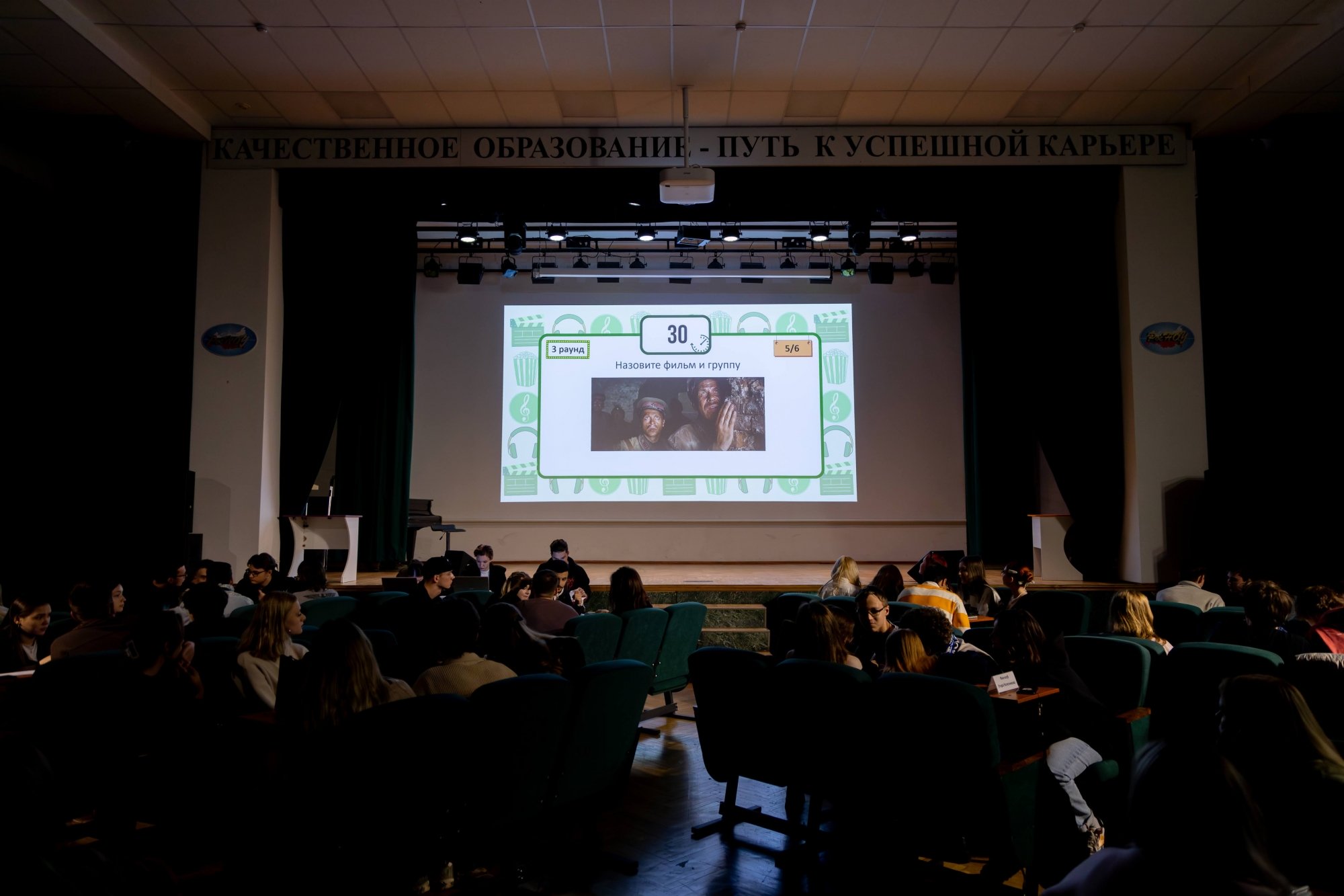 14 октября в Малахитовом зале Российского нового университета прошел интеллектуально-развлекательный РосНОУ-квиз «Кино и музыка» № 7. За звание лучших кино- и меломанов боролись студенты пяти учебных подразделений: шесть команд Гуманитарного института, пять — Института бизнес-технологий, четыре — ИСИКТ, две — Налогового института, одна — колледжа РосНОУ и две сборные. Для турнира это новый рекорд — предыдущий держался с пятого квиза, который прошел год назад и собрал 18 команд.
