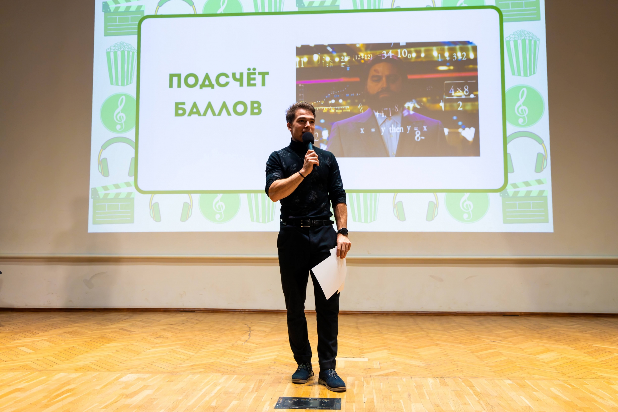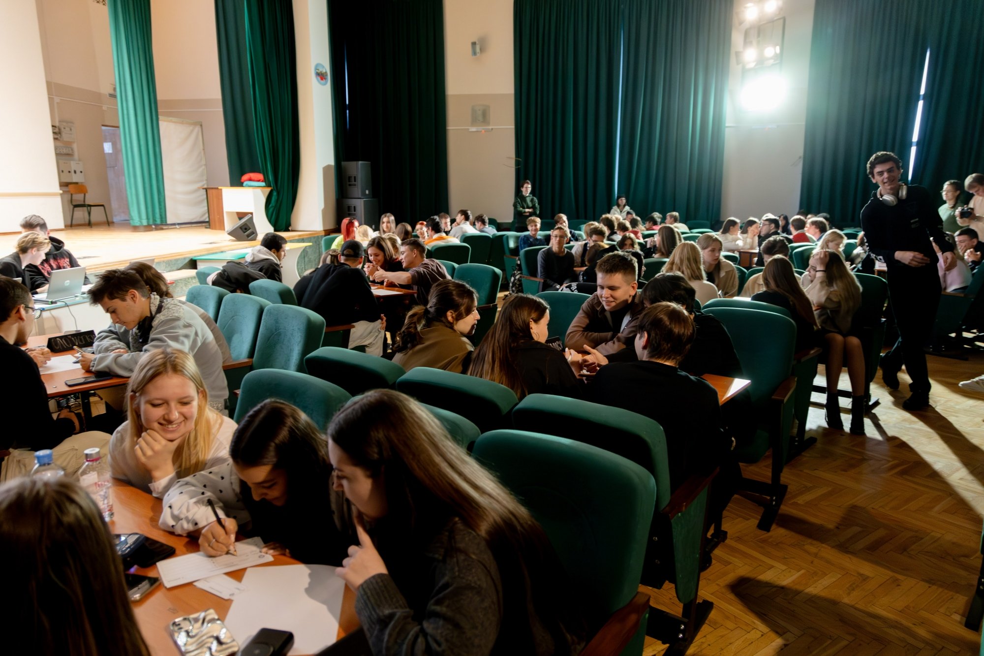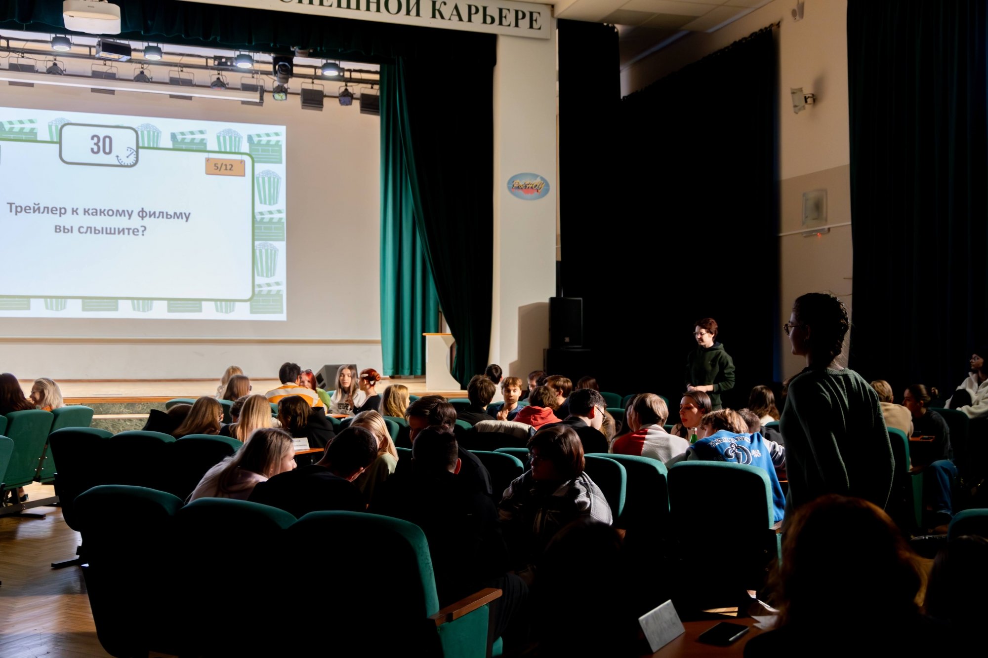 14 октября в Малахитовом зале Российского нового университета прошел интеллектуально-развлекательный РосНОУ-квиз «Кино и музыка» № 7. За звание лучших кино- и меломанов боролись студенты пяти учебных подразделений: шесть команд Гуманитарного института, пять — Института бизнес-технологий, четыре — ИСИКТ, две — Налогового института, одна — колледжа РосНОУ и две сборные. Для турнира это новый рекорд — предыдущий держался с пятого квиза, который прошел год назад и собрал 18 команд.