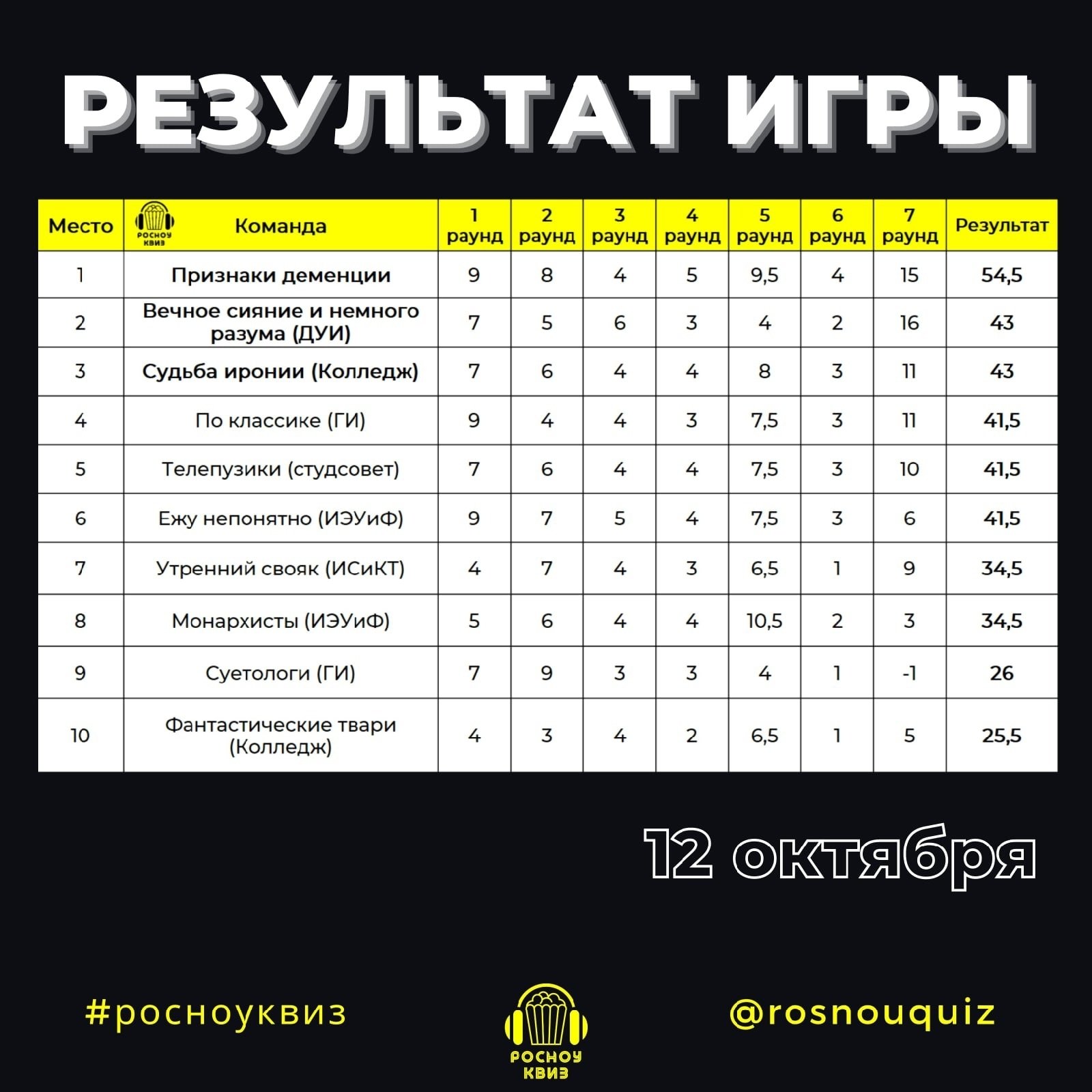 Команды службы новостей РосНОУ «Вечное сияние и немного разума» (43 балла) и Студенческого совета РосНОУ «Телепузики» (41,5 балл) играли вне конкурса.