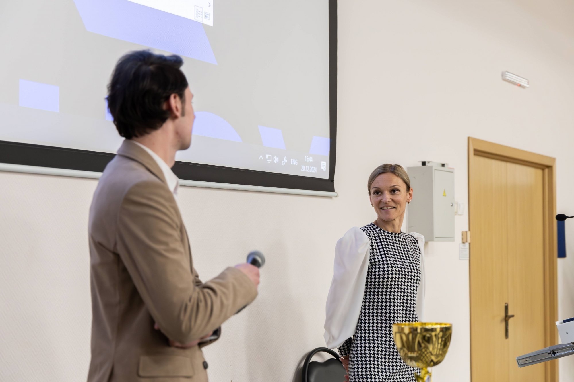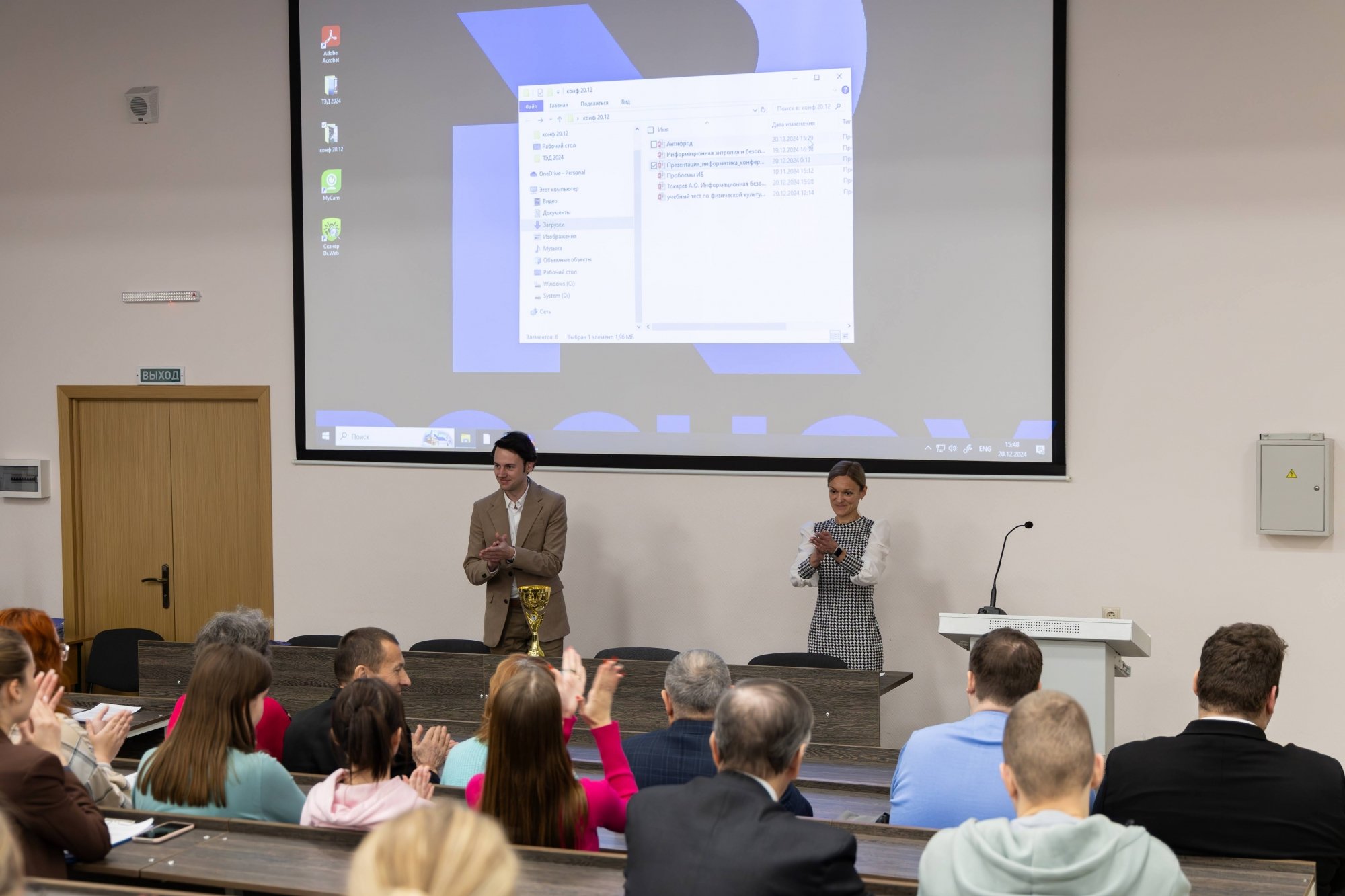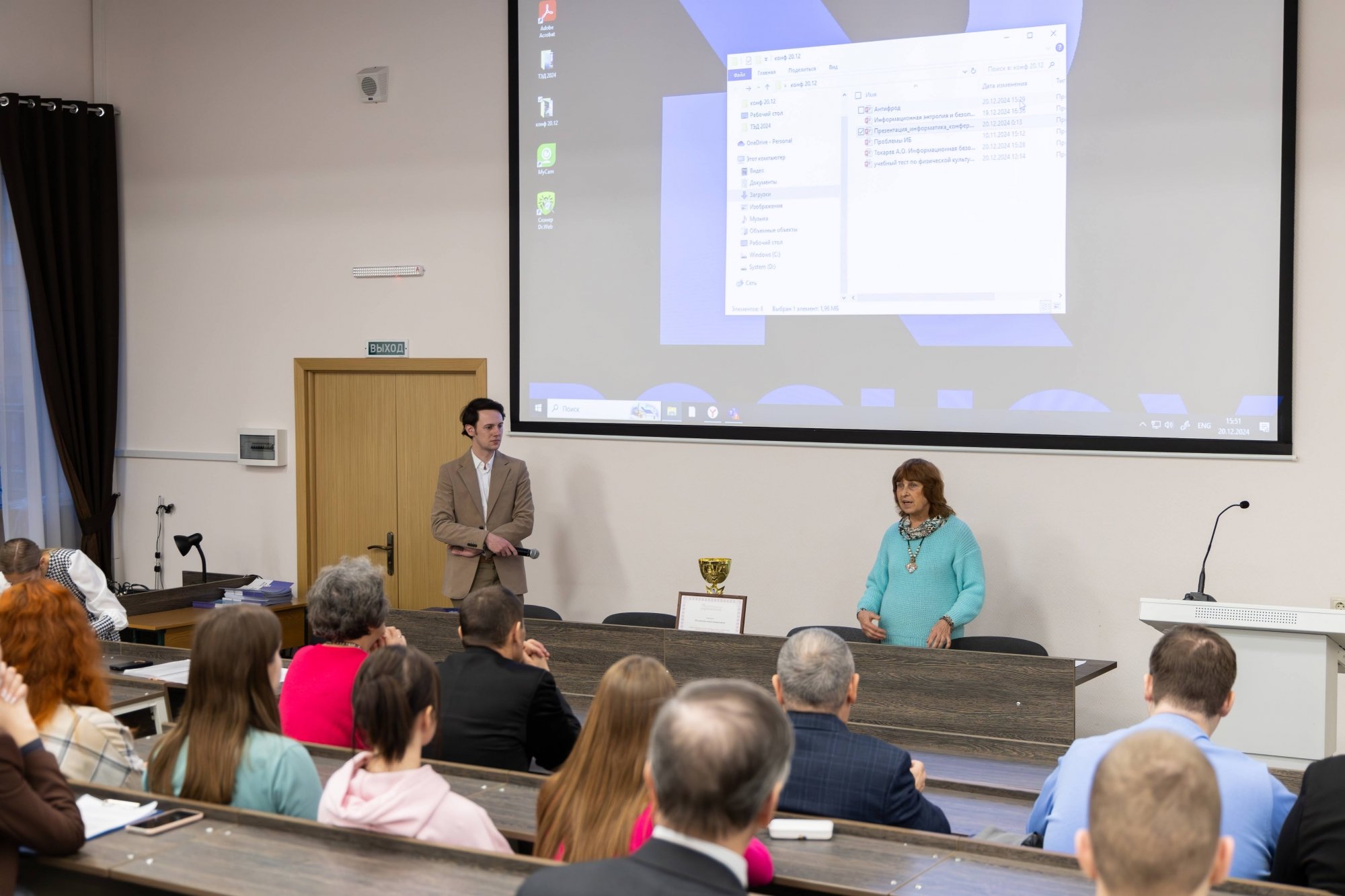 В финале конференции прошло вручение кубка за победу в олимпиаде «Консультант плюс», в которой приняли участие студенты РосНОУ направлений подготовки «Экономика» и «Юриспруденция». Кубок и грамоту вручили доценту кафедры основ математики и информатики Светлане Георгиевне Смолиной, которая и подготовила студентов к олимпиаде.