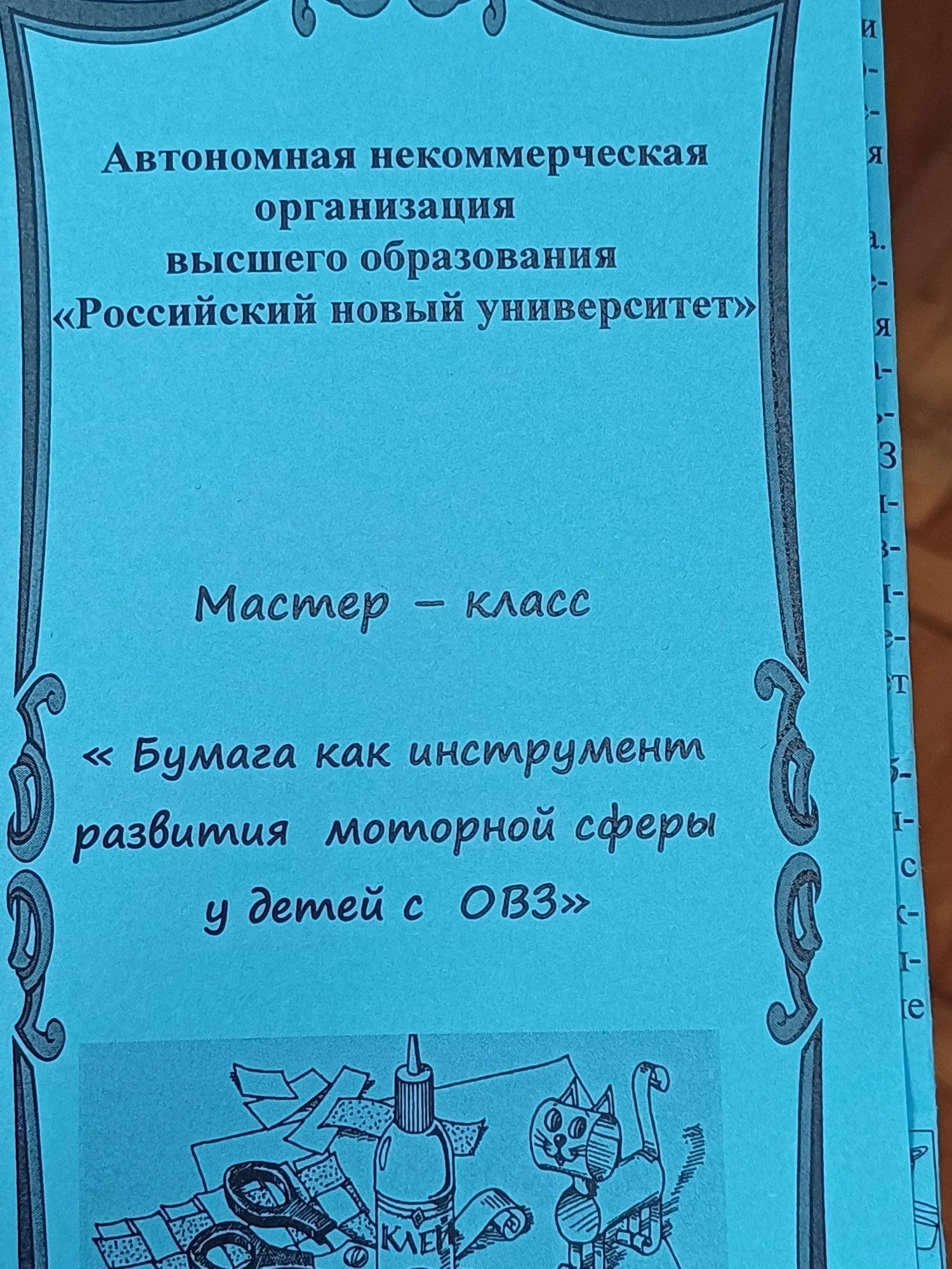 23 сентября в Российском новом университете (РосНОУ) в рамках проекта «Творческая мастерская» прошёл мастер-класс «Бумага как инструмент развития моторной сферы у детей с ограниченными возможностями здоровья». Мероприятие состоялось в рамках «Осенней декады» проекта «Творческая мастерская», который организует кафедра специального дефектологического образования Гуманитарного института (ГИ РосНОУ).