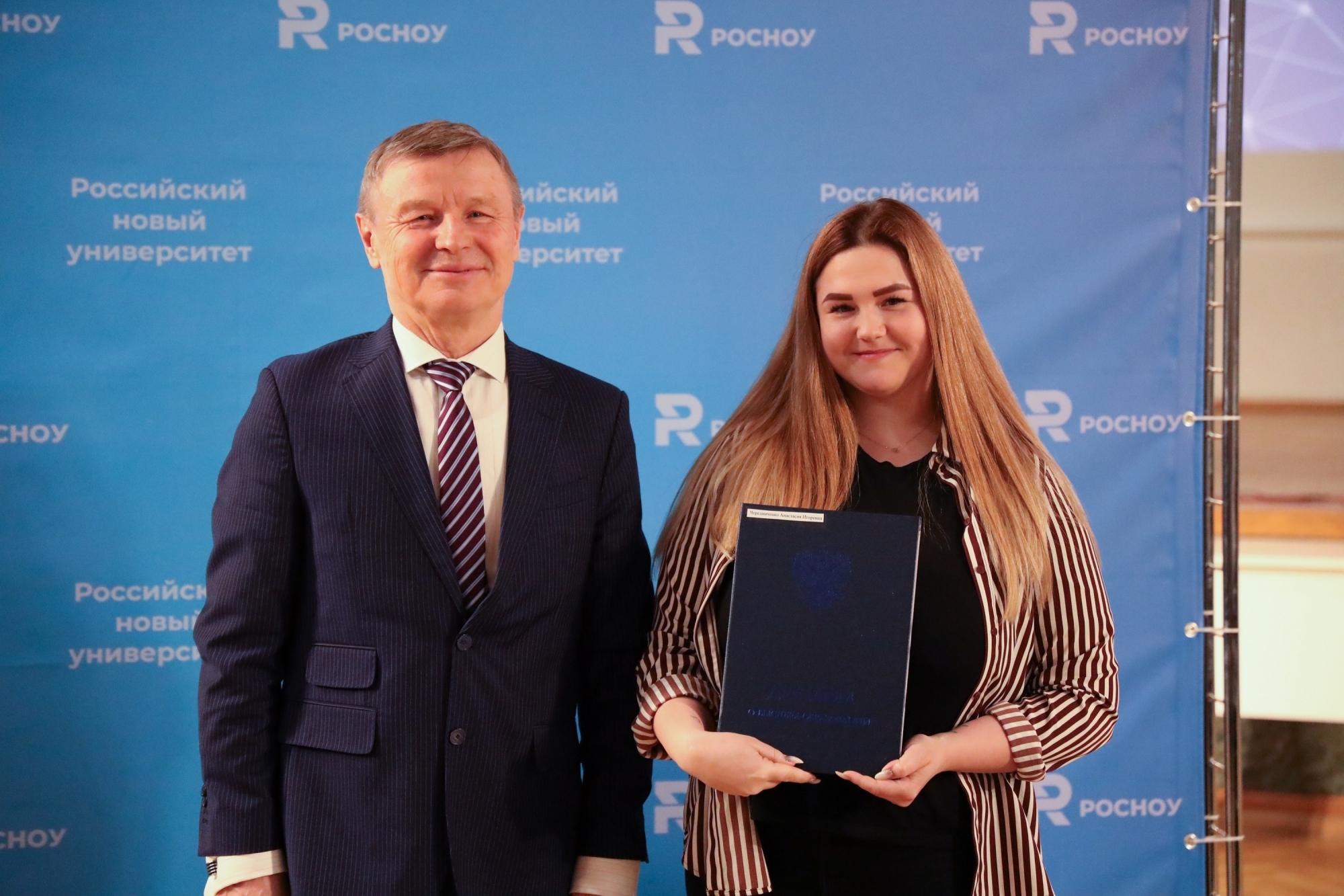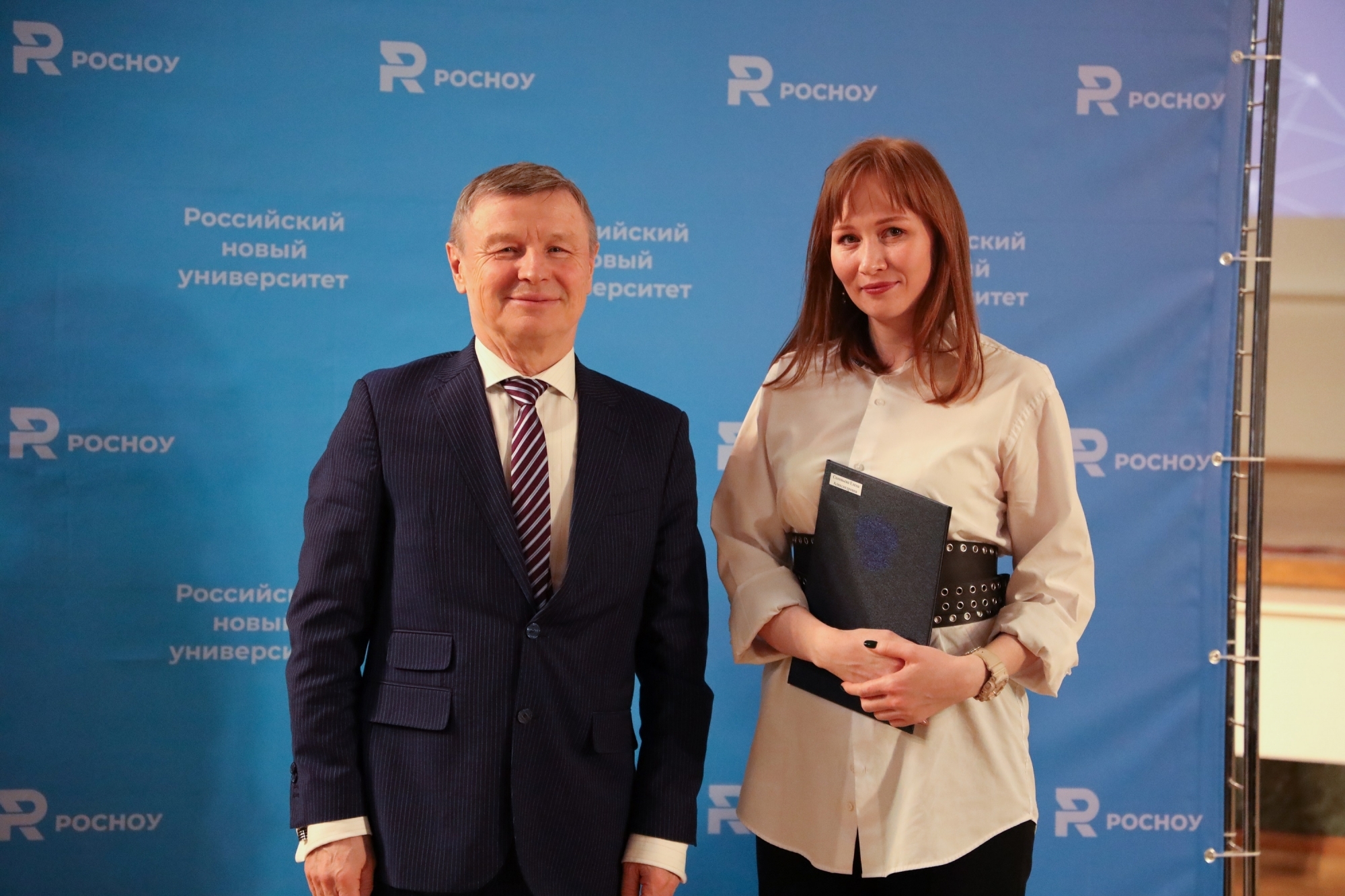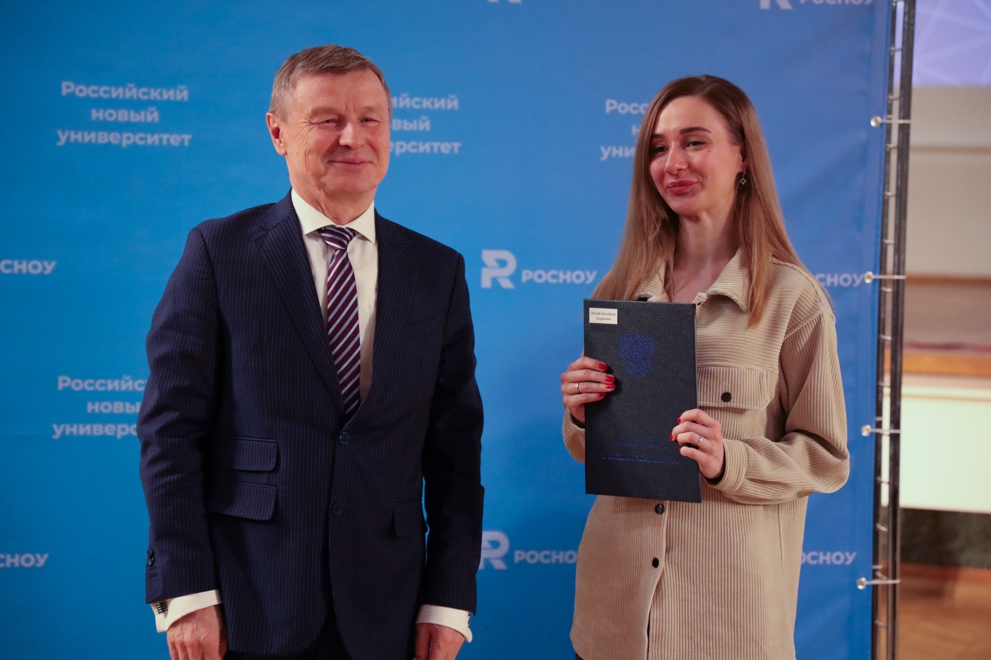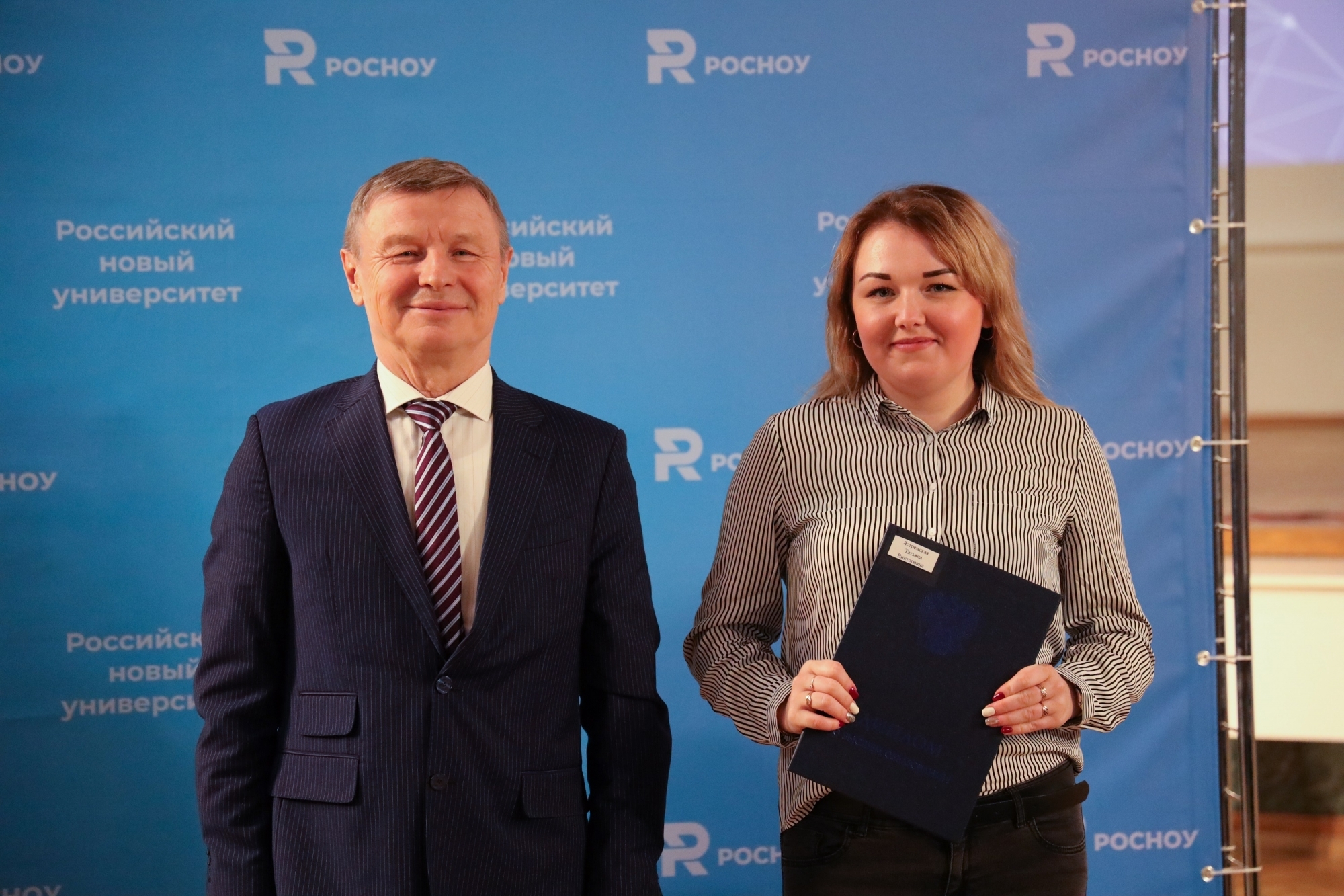 В торжественном мероприятии, которое прошло в Малахитовом зале университета, приняли участие проректор по учебной работе РосНОУ Григорий Шабанов и исполнительный директор Гуманитарного института Виктория Батколина.
