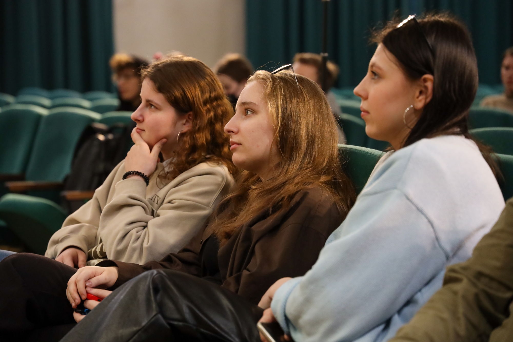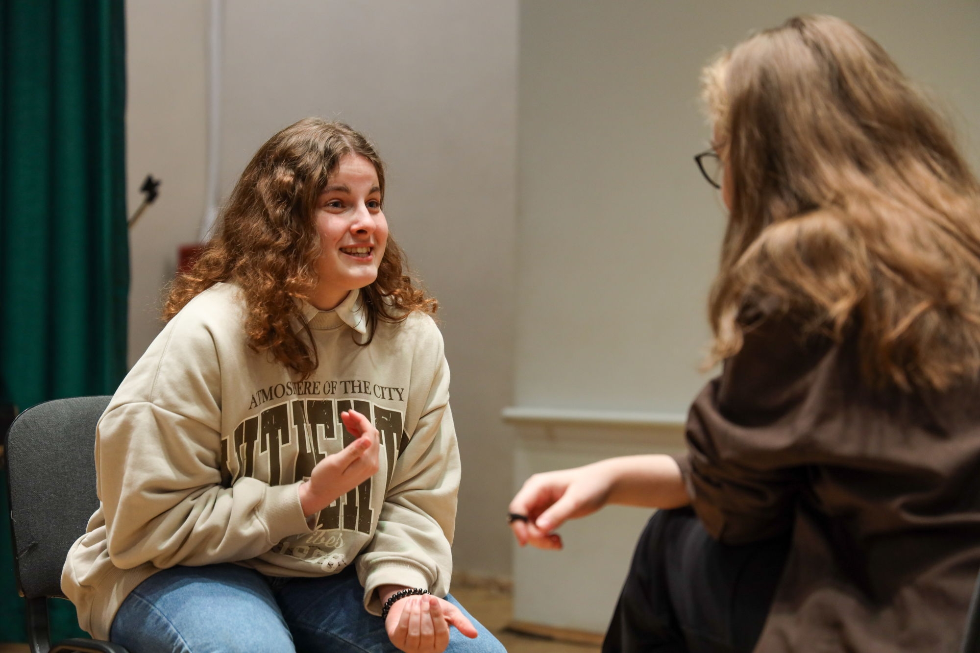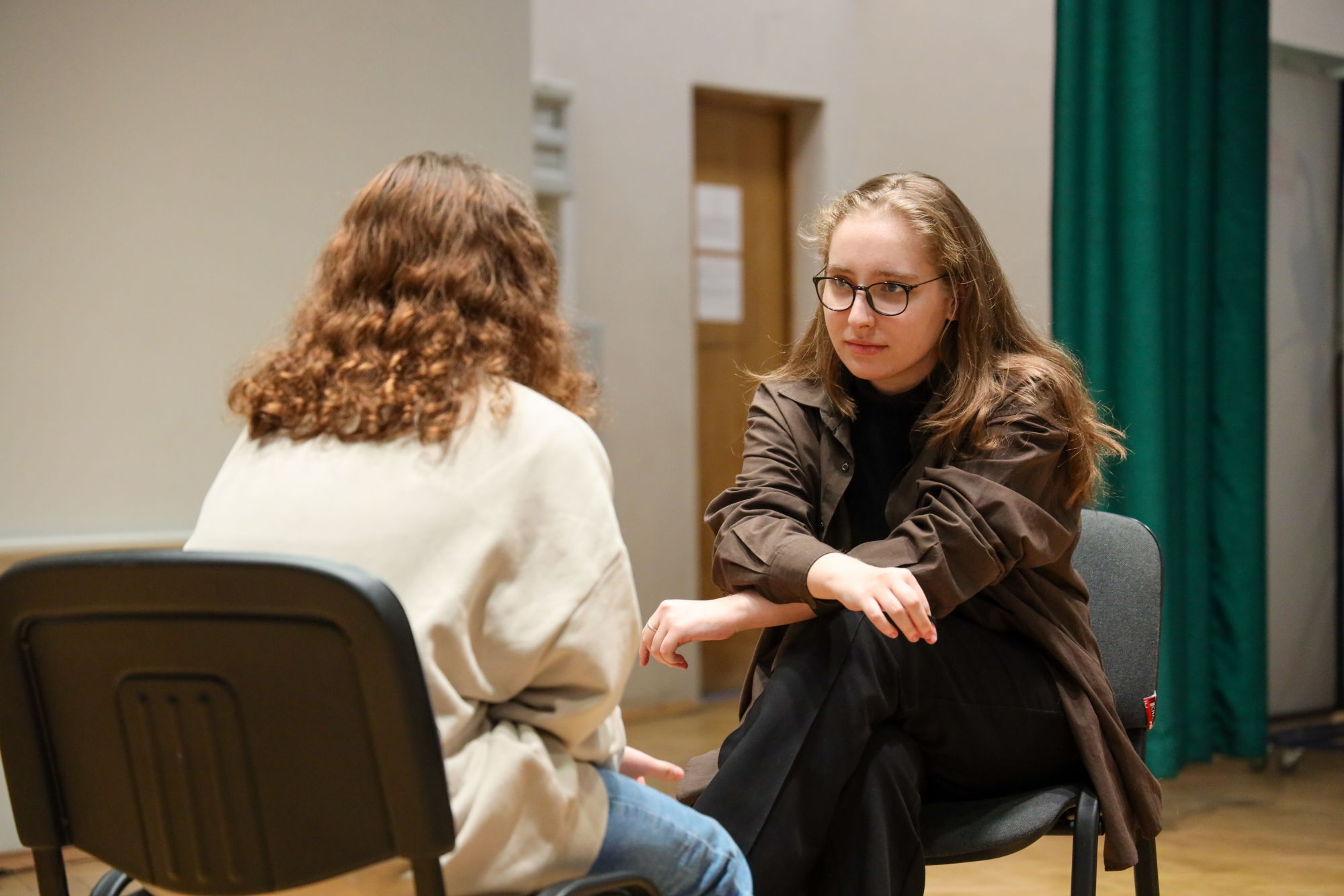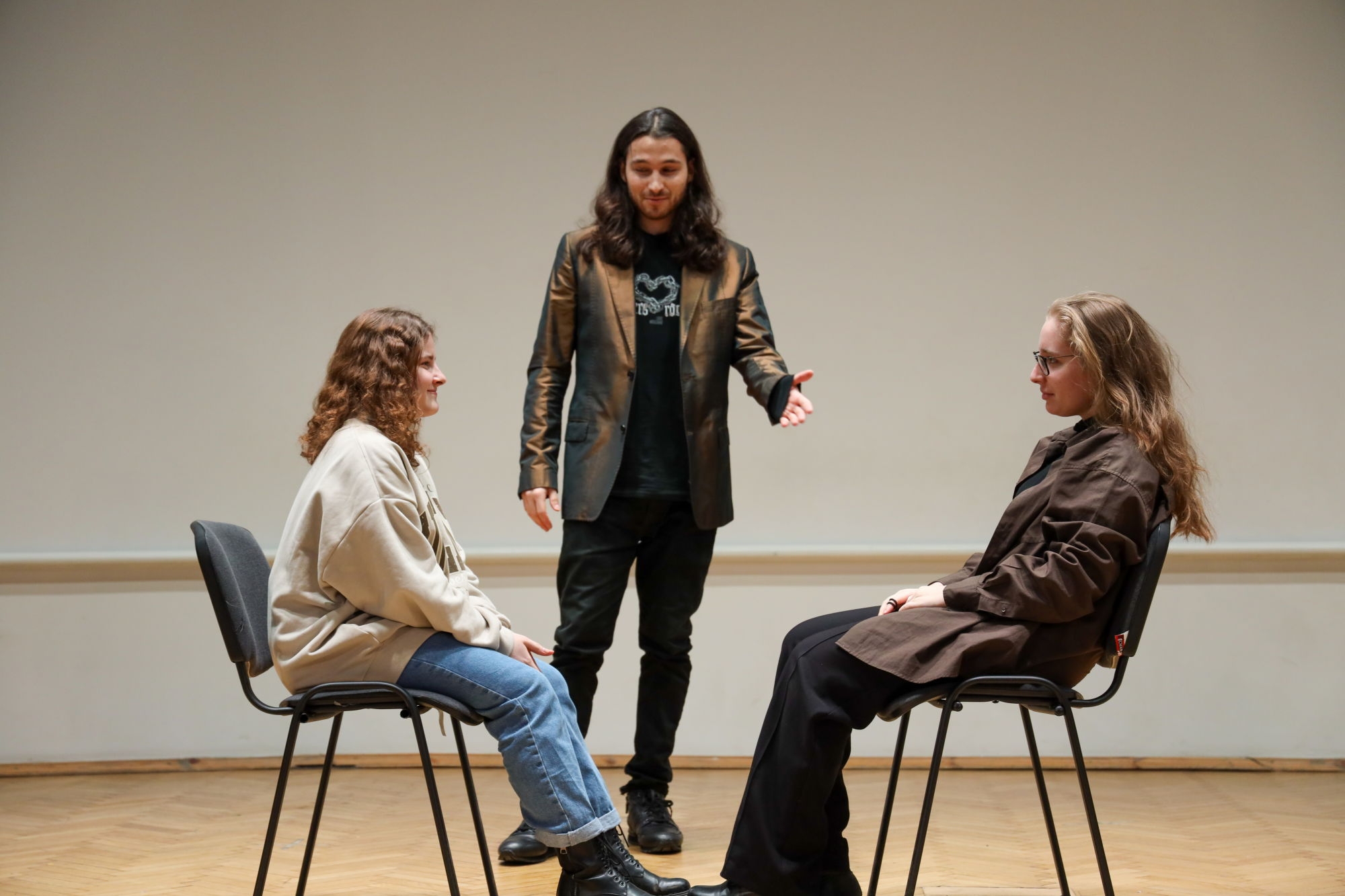Во время мастер-класса студенты практиковались в актерском мастерстве, боролись с публичный страхом на сцене. Выходила пара, которая должна была реализовать сценическую задача, взаимодействуя друг с другом. Желающих было много. Это сложно и интересно одновременно.