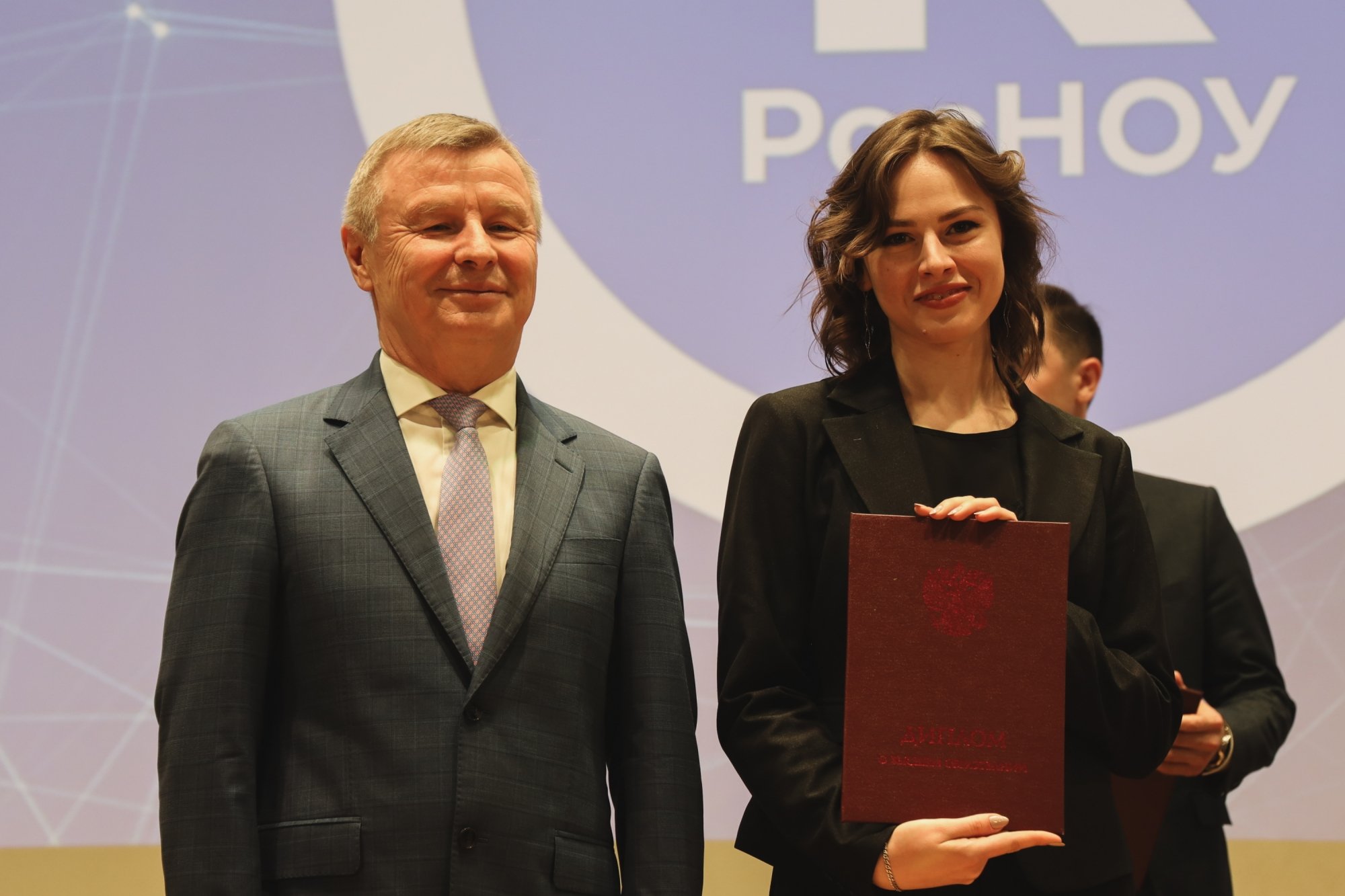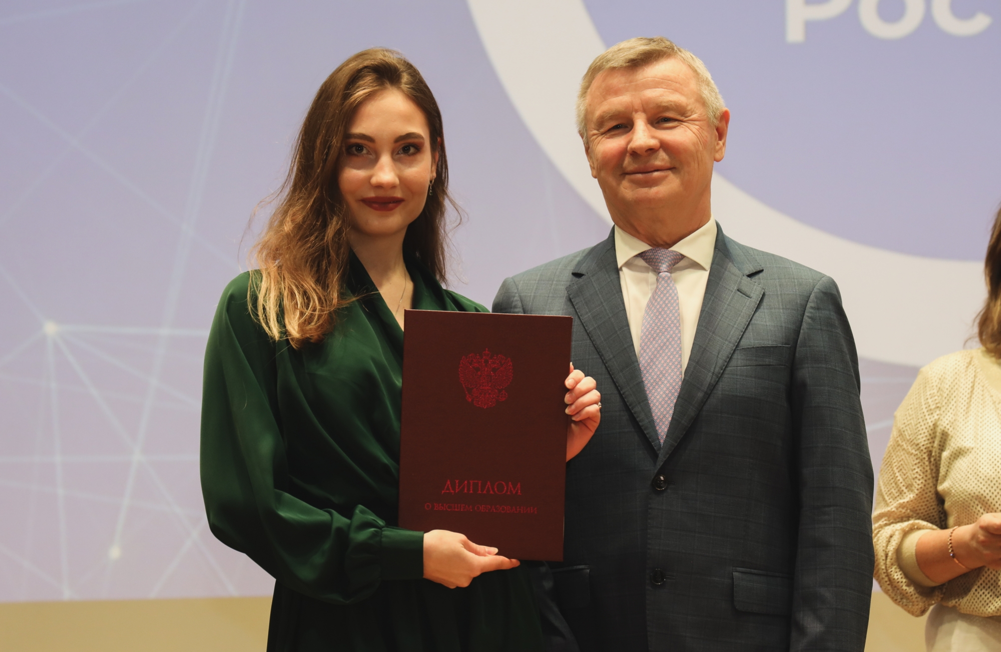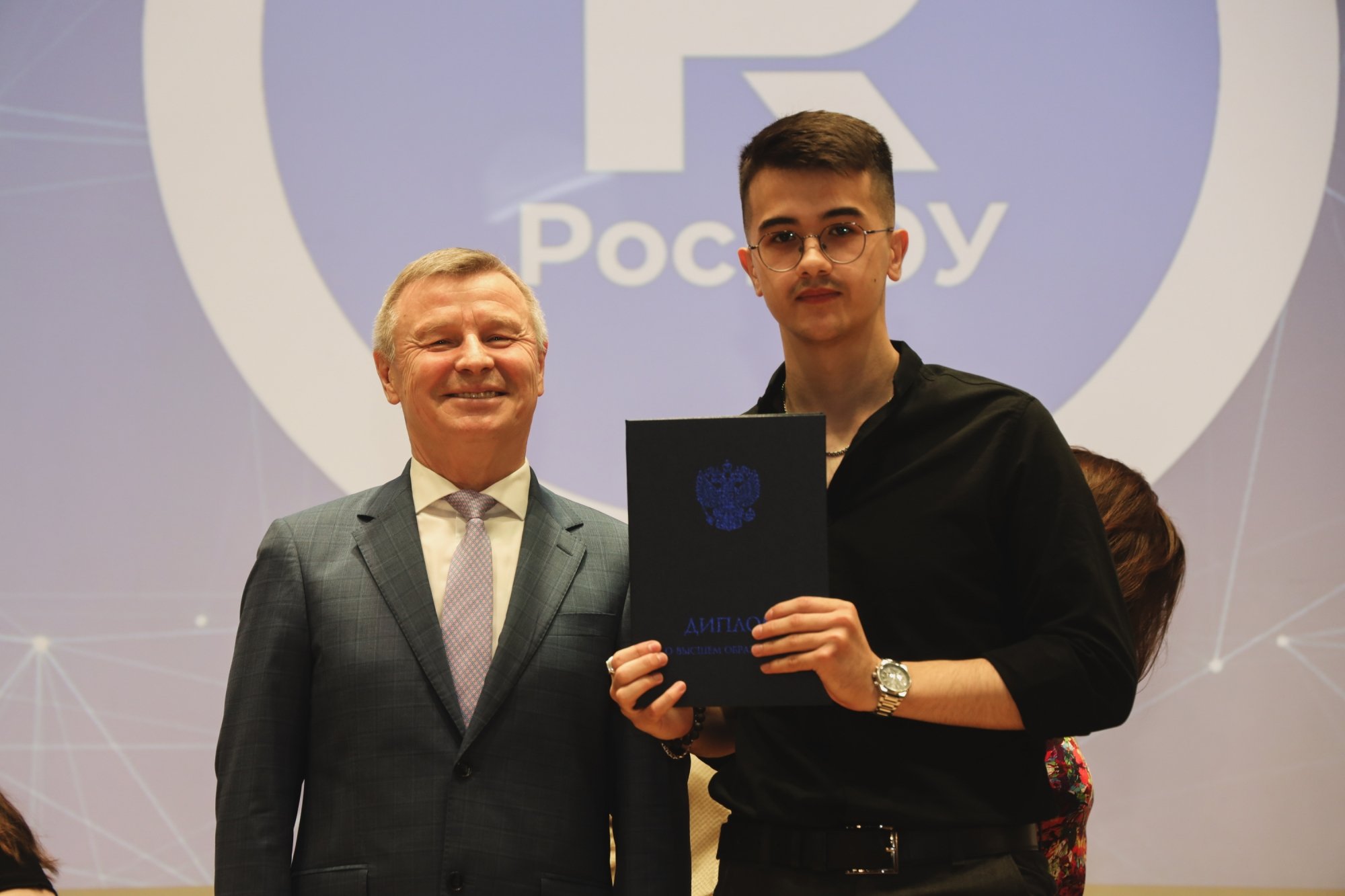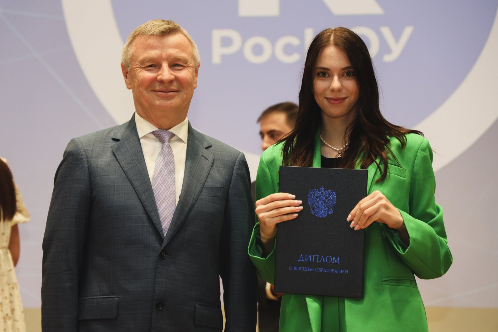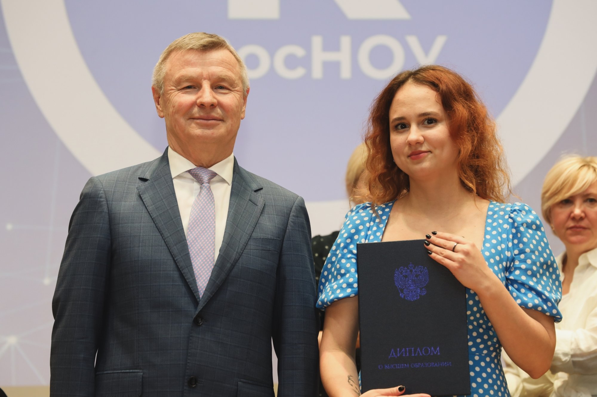 Торжественное событие собрало всех в Малахитовом зале Российского нового университета. Документы о высшем образовании и напутственные слова от педагогов получили 62 молодых специалиста.