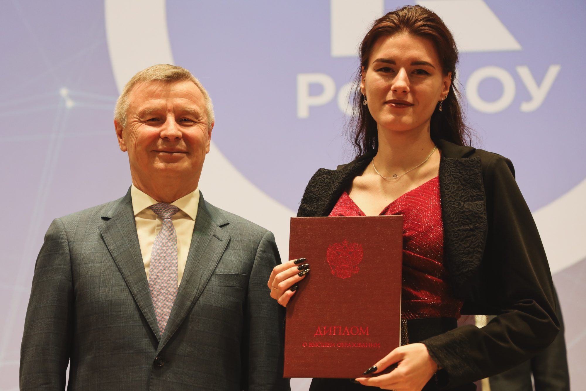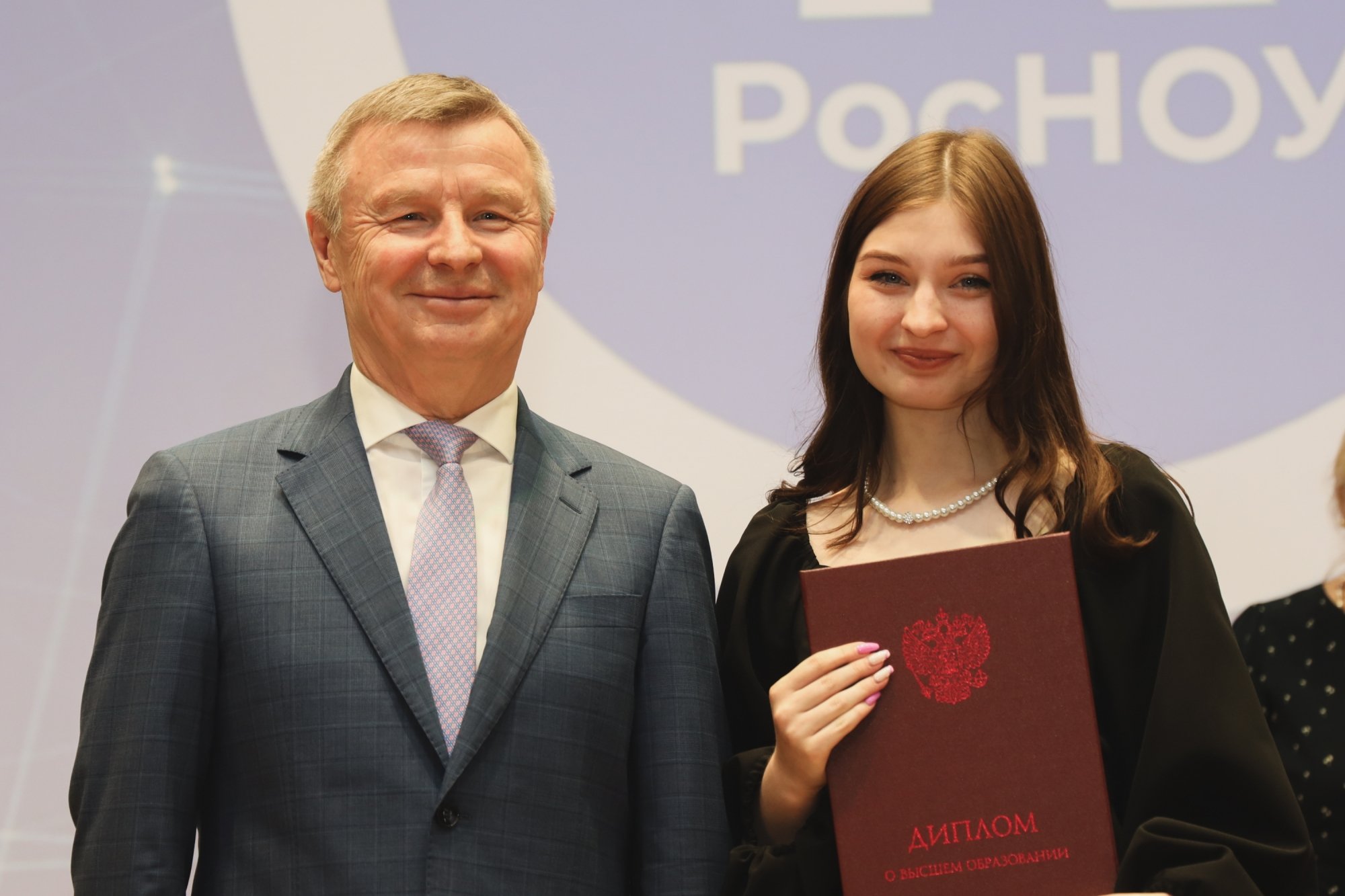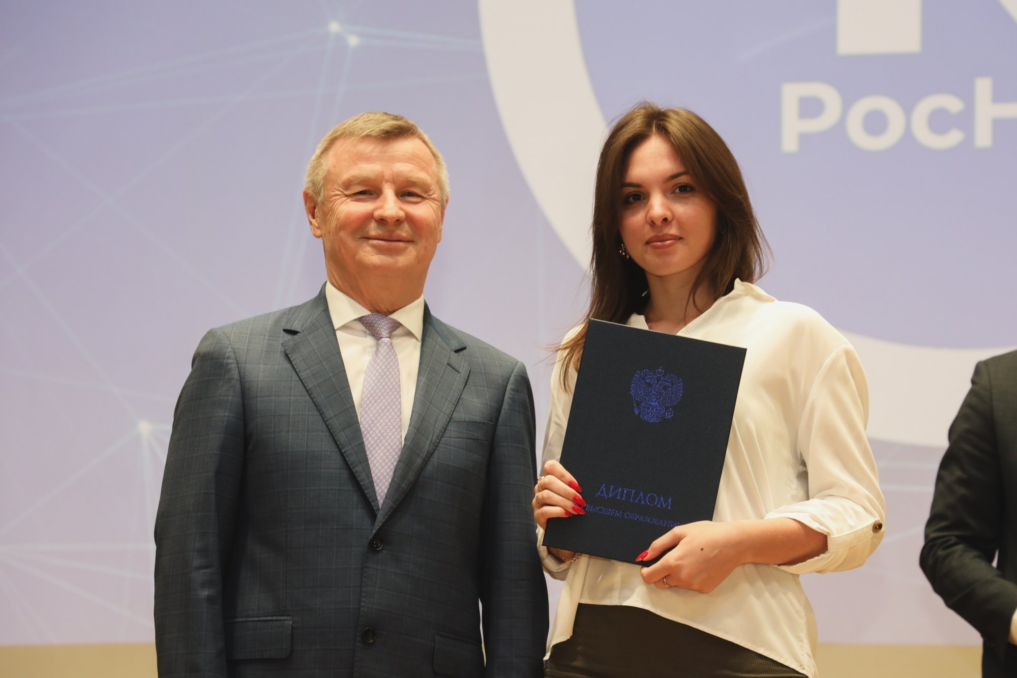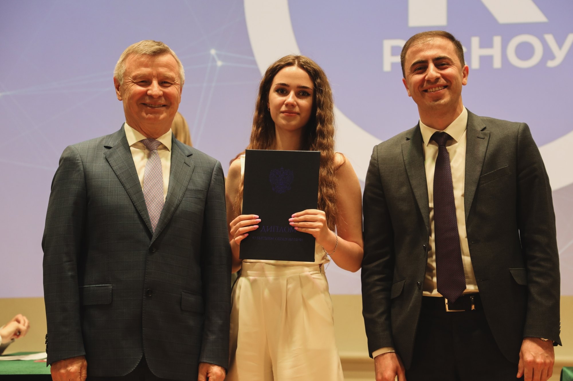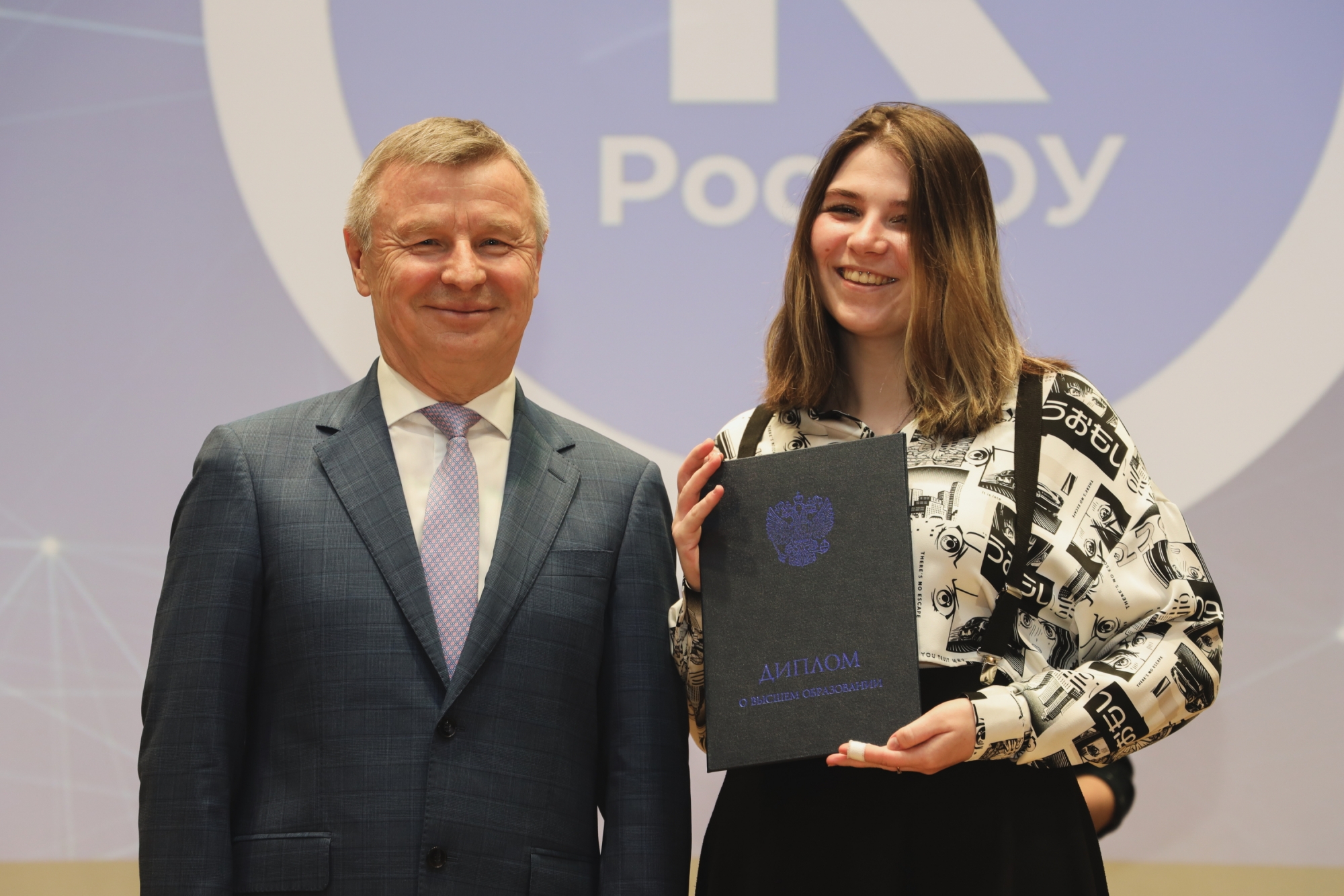Торжественное событие собрало всех в Малахитовом зале Российского нового университета. Документы о высшем образовании и напутственные слова от педагогов получили 62 молодых специалиста.