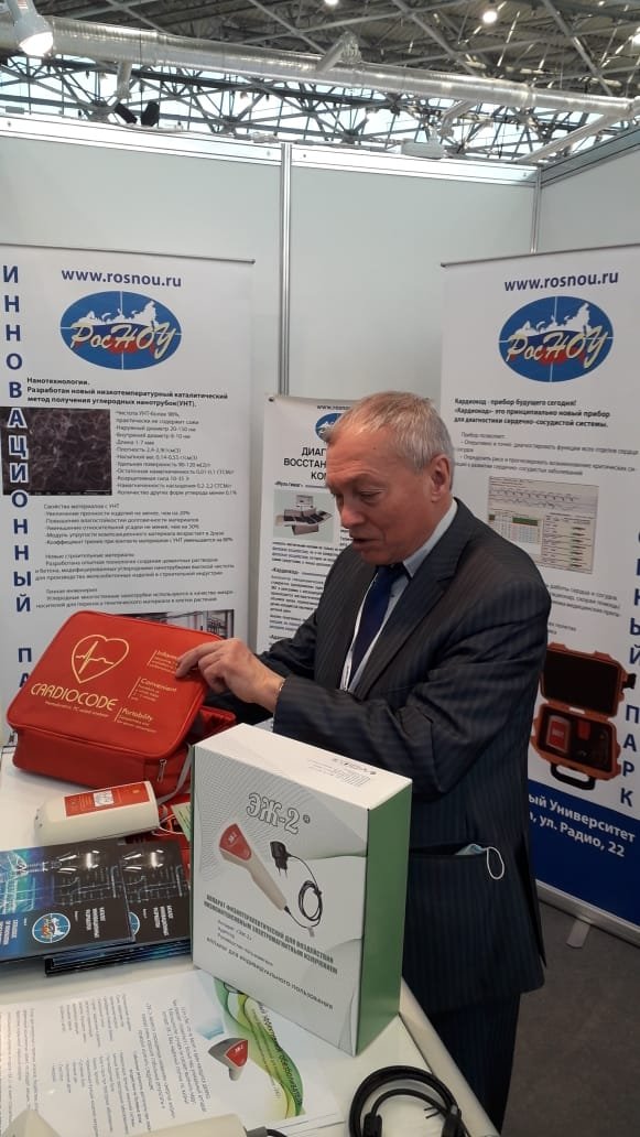В числе медицинских приборов — «Кардиокод», разработанный в научной лаборатории РосНОУ. Прибор диагностирует состояние сердечно-сосудистой системы, прогнозирует возможные осложнения и сценарии лечения.