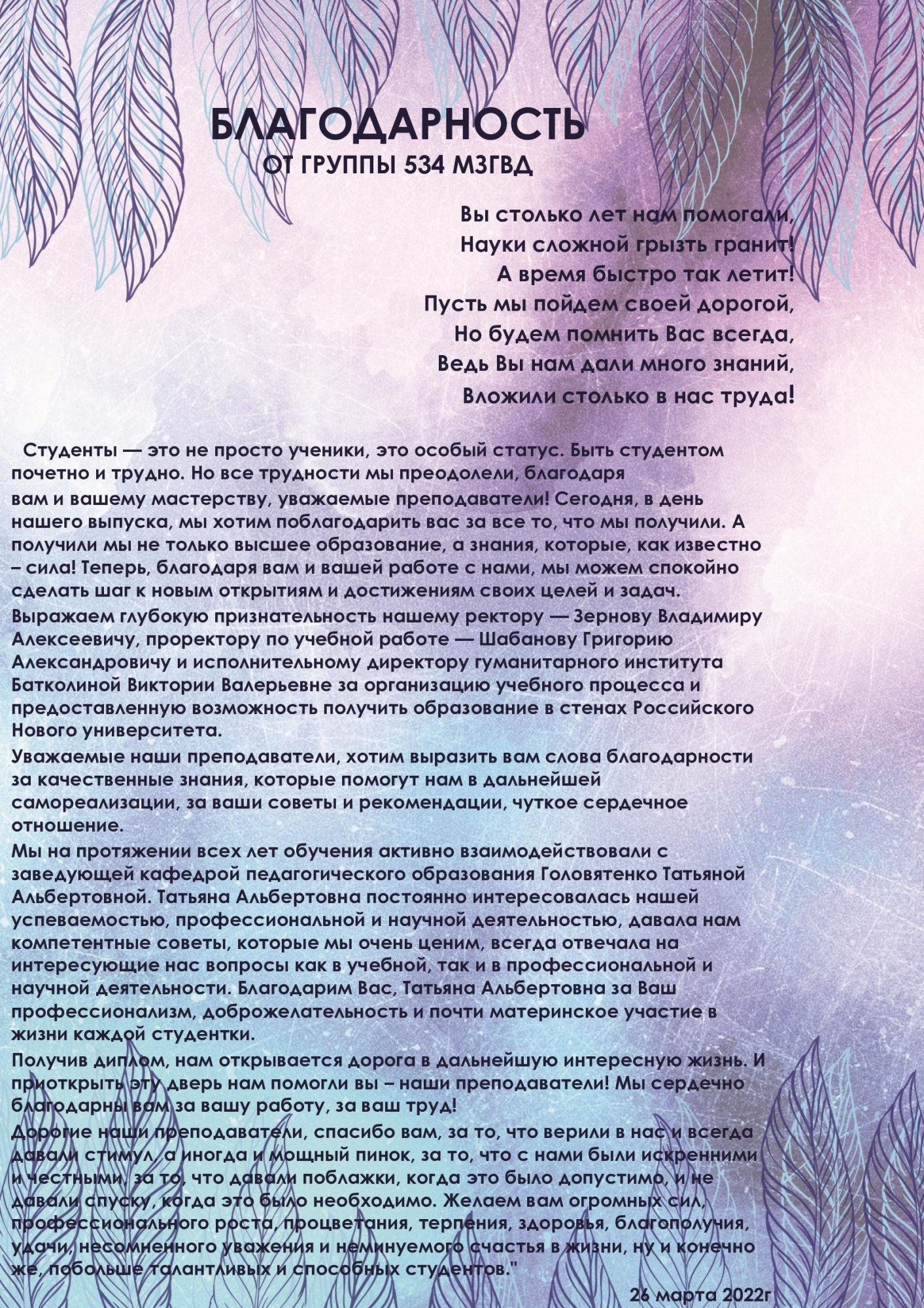 — Пусть полученное образование поможет выпускникам состояться в профессиональной области, внести вклад в экономику страны и жизнь общества в целом.